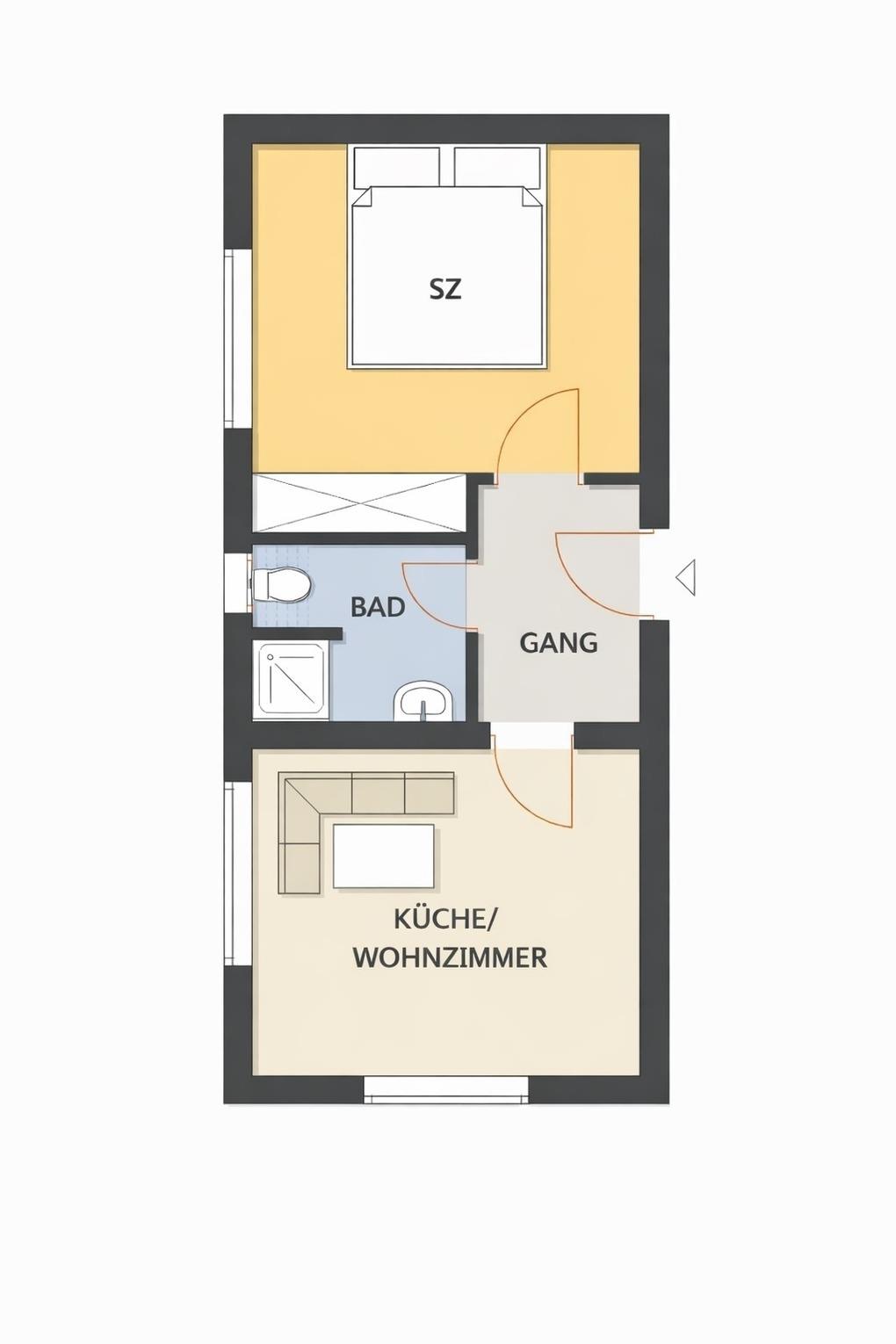 Die Wohnung verfügt über eine eigene Terrasse, die zum Verweilen im Freien einlädt. Der kombinierte Wohn- und Schlafbereich ist mit einem komfortablen Doppelbett (180 × 200 cm), Fernseher und Laminatboden ausgestattet und schafft eine angenehme Wohlfühlatmosphäre.