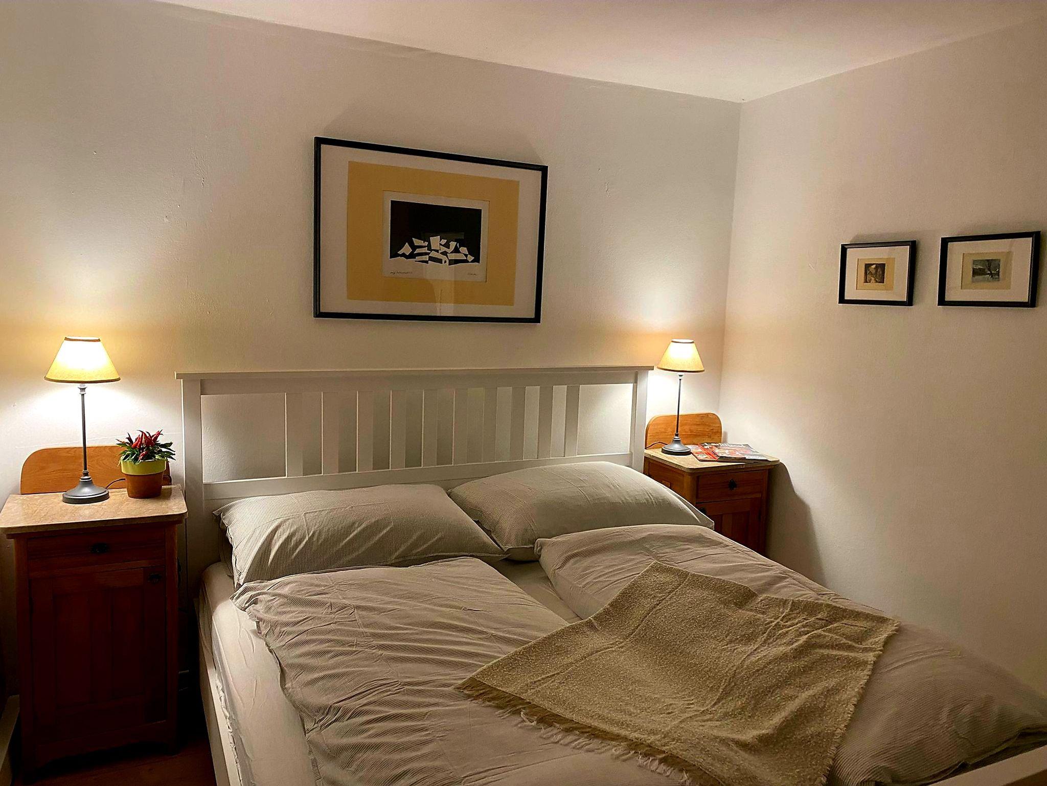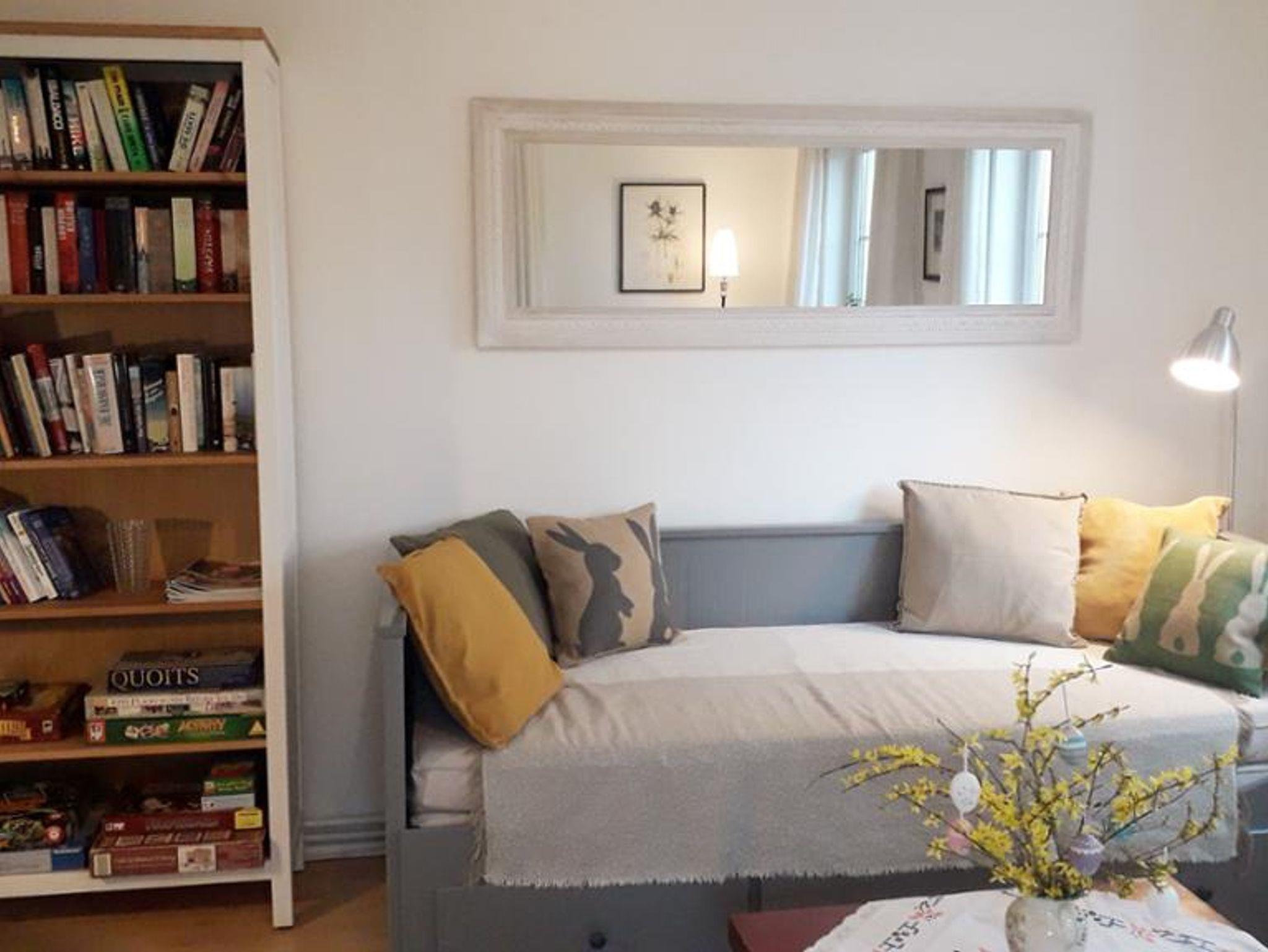 Ebenfalls als Schlafzimmer (mit begehbarem Schrankraum) verwendbar ist unser Wohnzimmer, in dem sich ein gemütliches, ausziehbares Tagesbett (mit separaten, bequemen Matratzen), ein gut gefülltes Bücherregal mit deutsch-und englischsprachigen Büchern und diversen Spielen, sowie einem großen Schreibtisch (WLAN natürlich vorhanden), befinden.