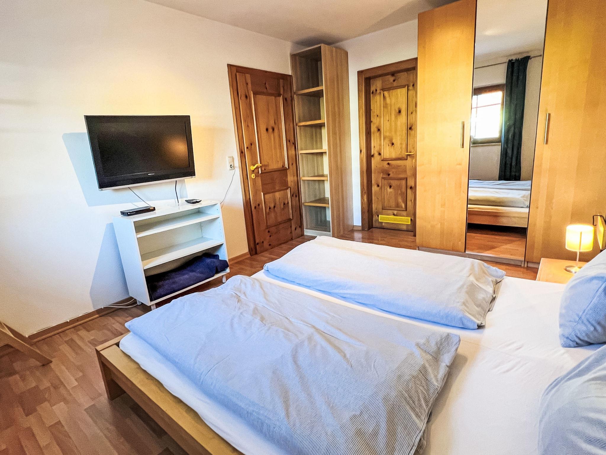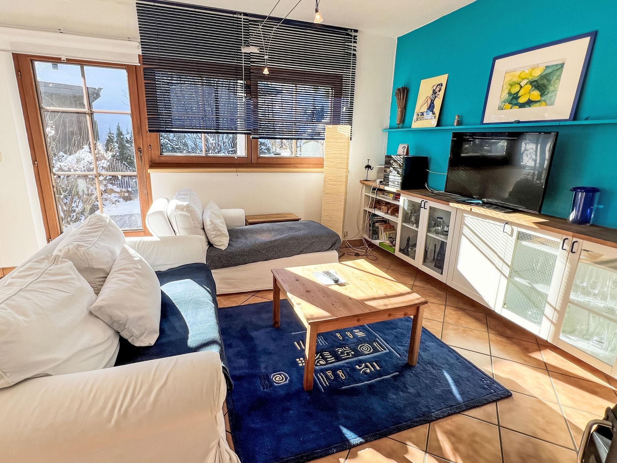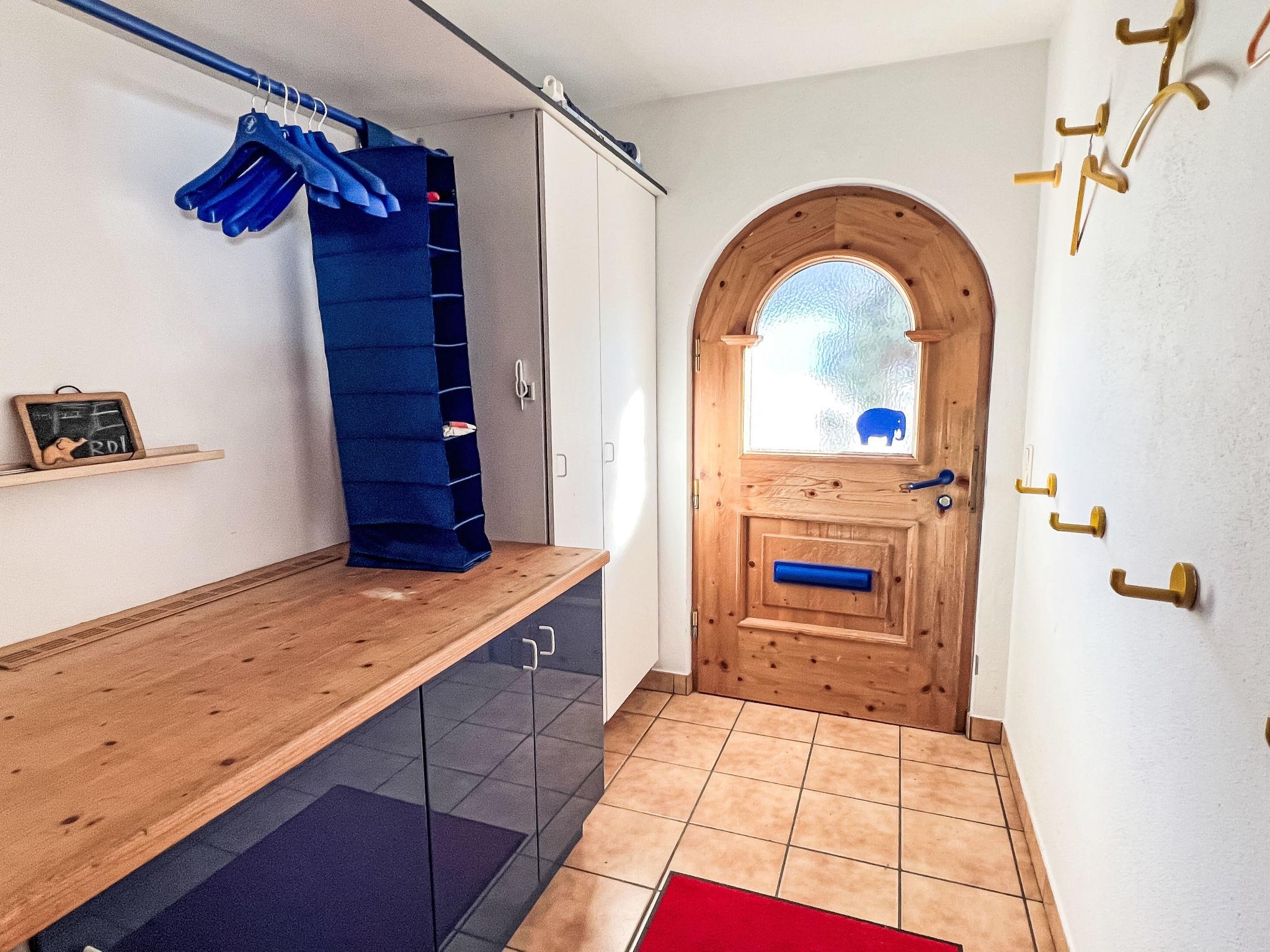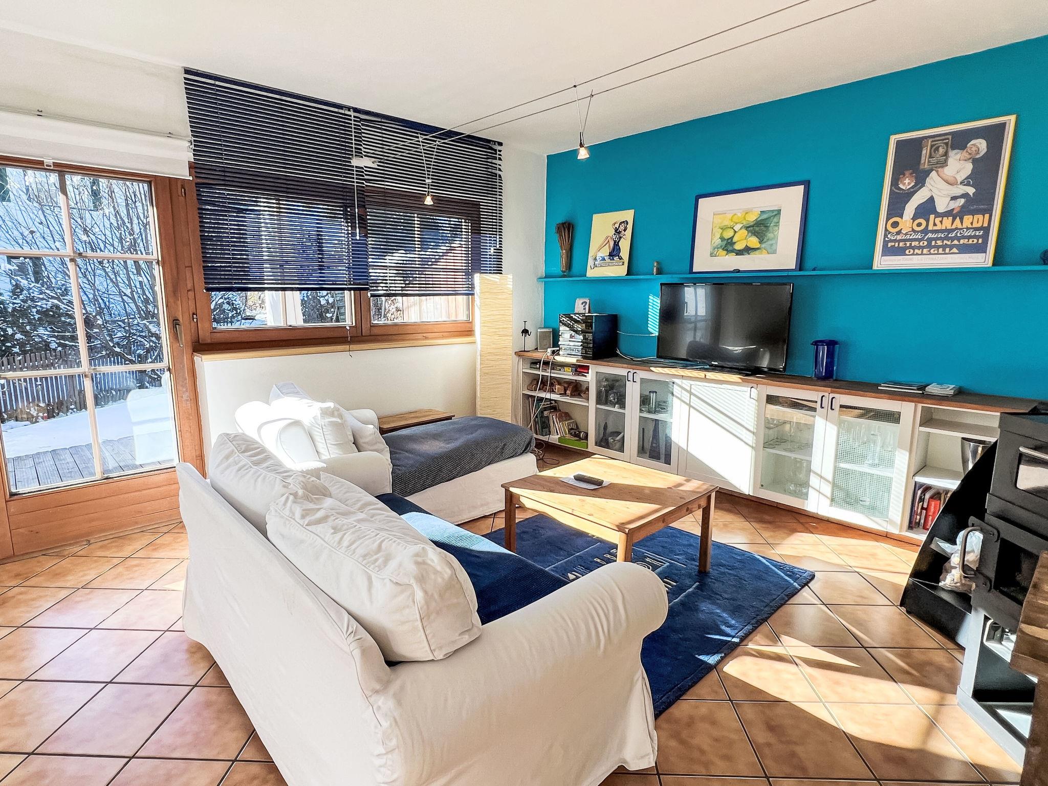 "Blauer Elefant", 4-room apartment 108 m2, on the ground floor. Tasteful furnishings: living room with Scandinavian wood stove and TV. 1 double bedroom with shower/WC and TV. 1 room with 1 x 2 bunk beds (90 cm, length 200 cm). 1 room with 1 double bed (130 cm, length 200 cm). Open kitchen (oven, dishwasher, 4 ceramic glass hob hotplates, toaster, kettle, microwave, fondue Set (chinoise)). Bath/WC. Oil heating. Wooden floors. Terrace 50 m2. Terrace furniture, electric barbecue. Very beautiful panoramic view of the mountains. Facilities: washing machine. Internet (WiFi, free). Please note: non-smokers only. Smoke alarm, fire extinguisher.