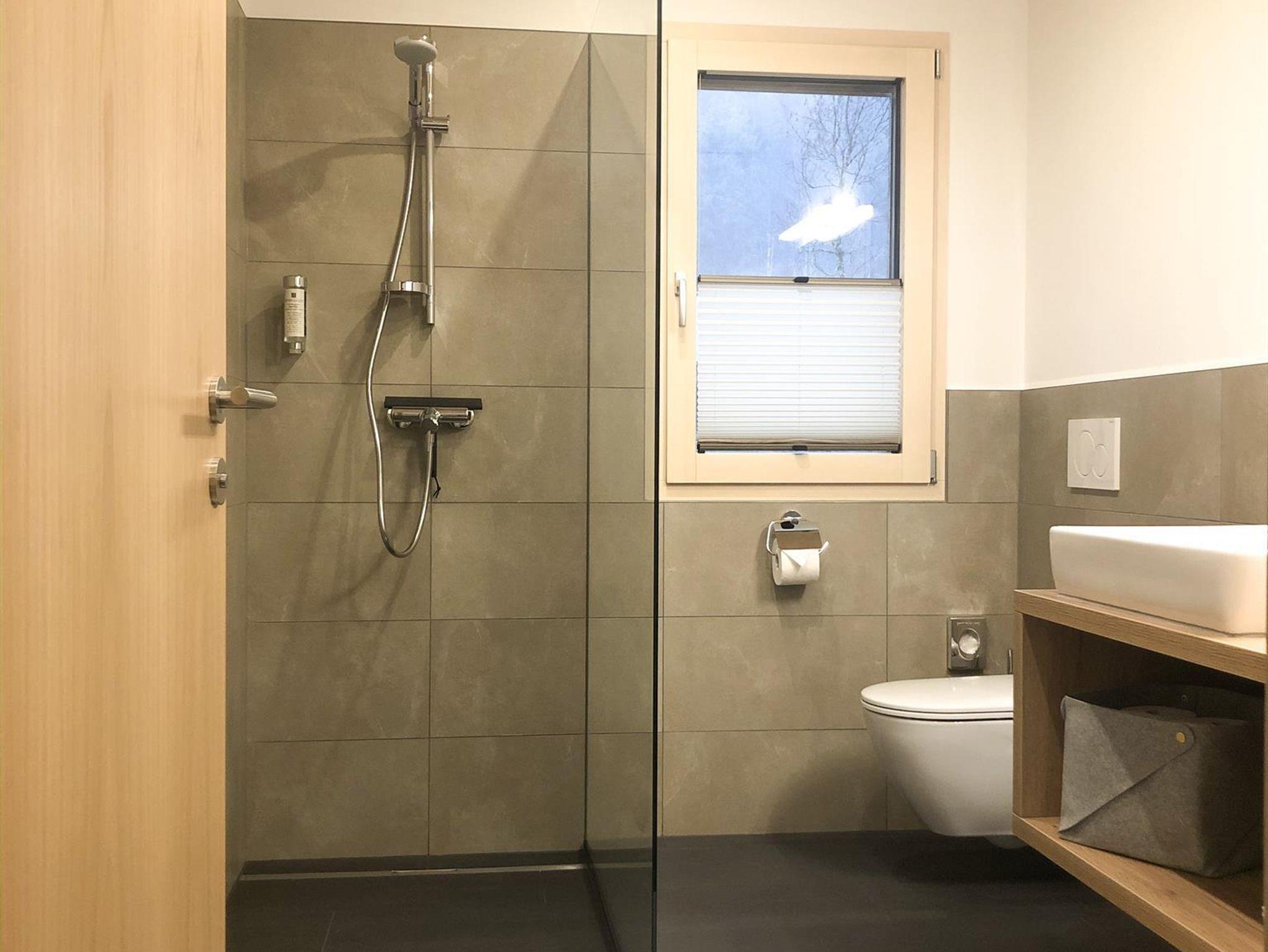 • Das Badezimmer verfügt über einen Waschtisch, Handtuchtrockner, eine Dusche sowie eine Toilette