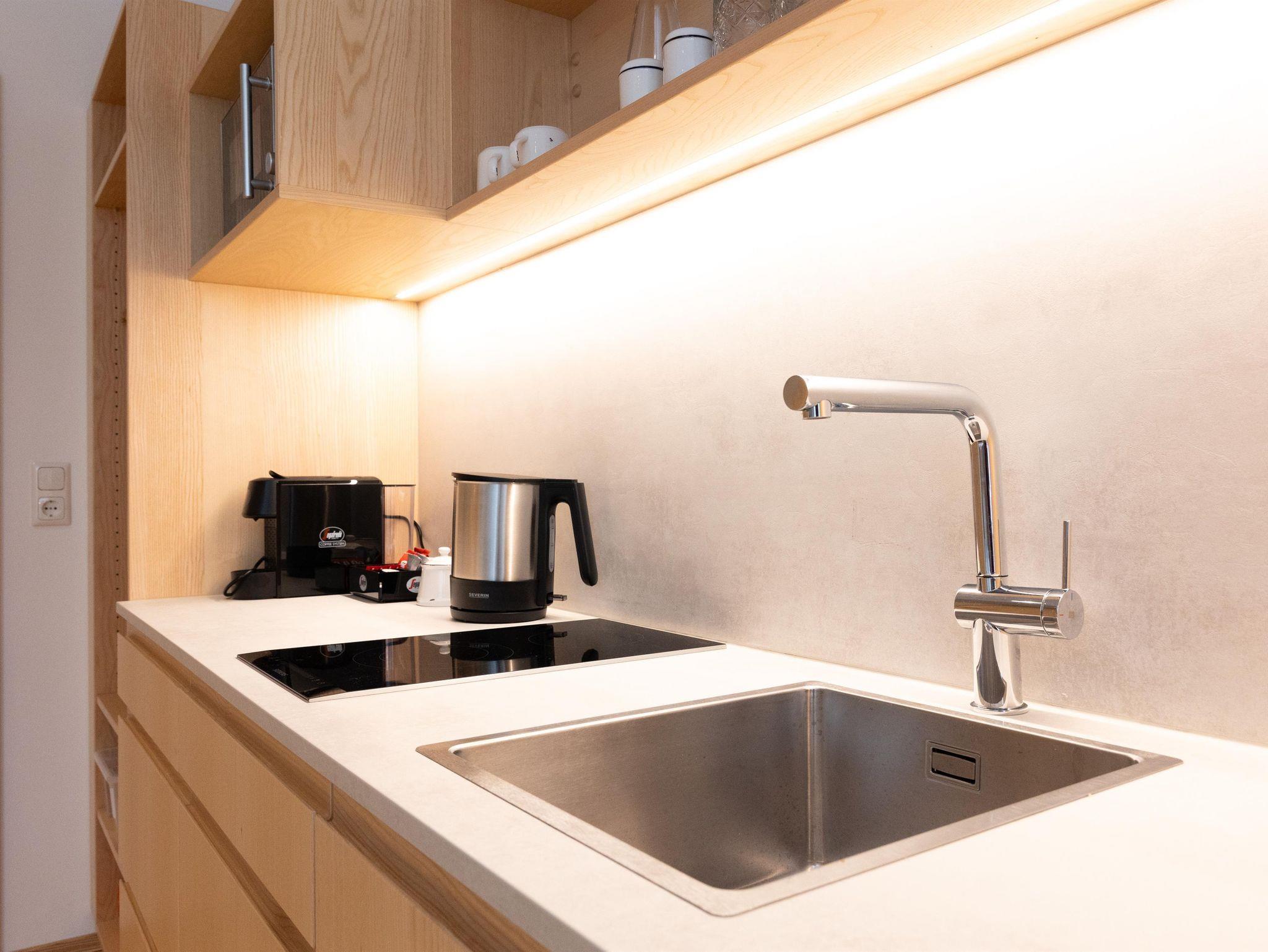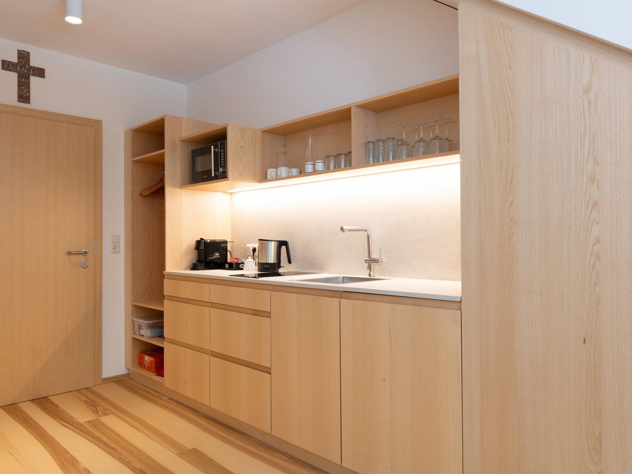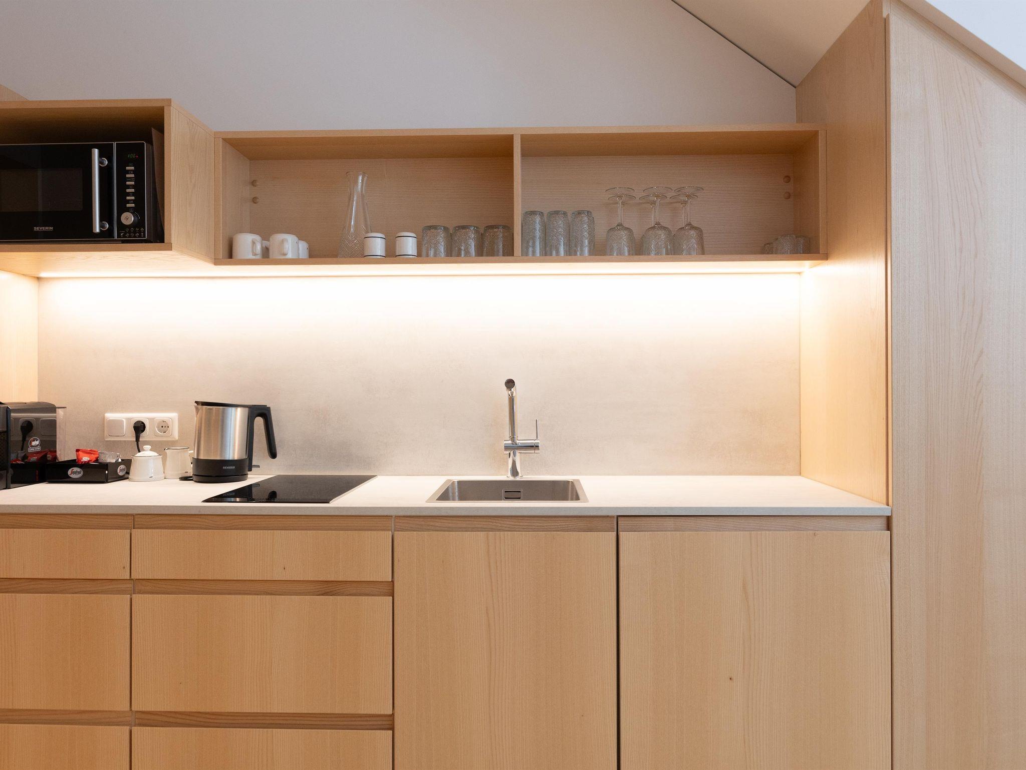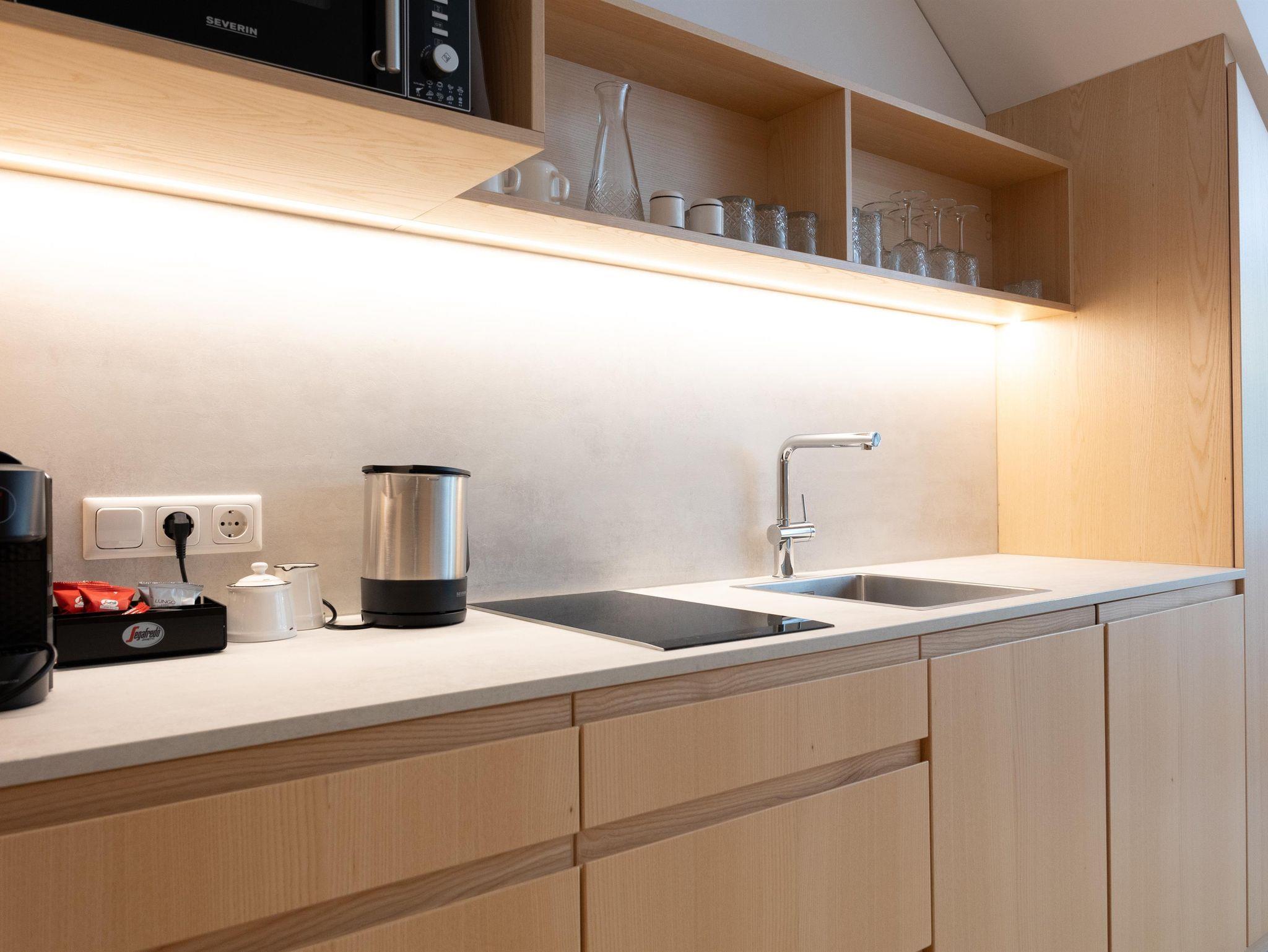 Die Ausstattung der Apartments lässt keine Wünsche offen. In den großzügigen Küchen kannst du dich bequem selbst versorgen, und im Vorraum findest du hausgemachte Gerichte in Kühlschränken, die du in deinem Apartment erwärmen kannst. Außerdem findest du im Kühlschrank in den Appartements einige Erfrischungen, die bereits für dich vorbereitet wurden!