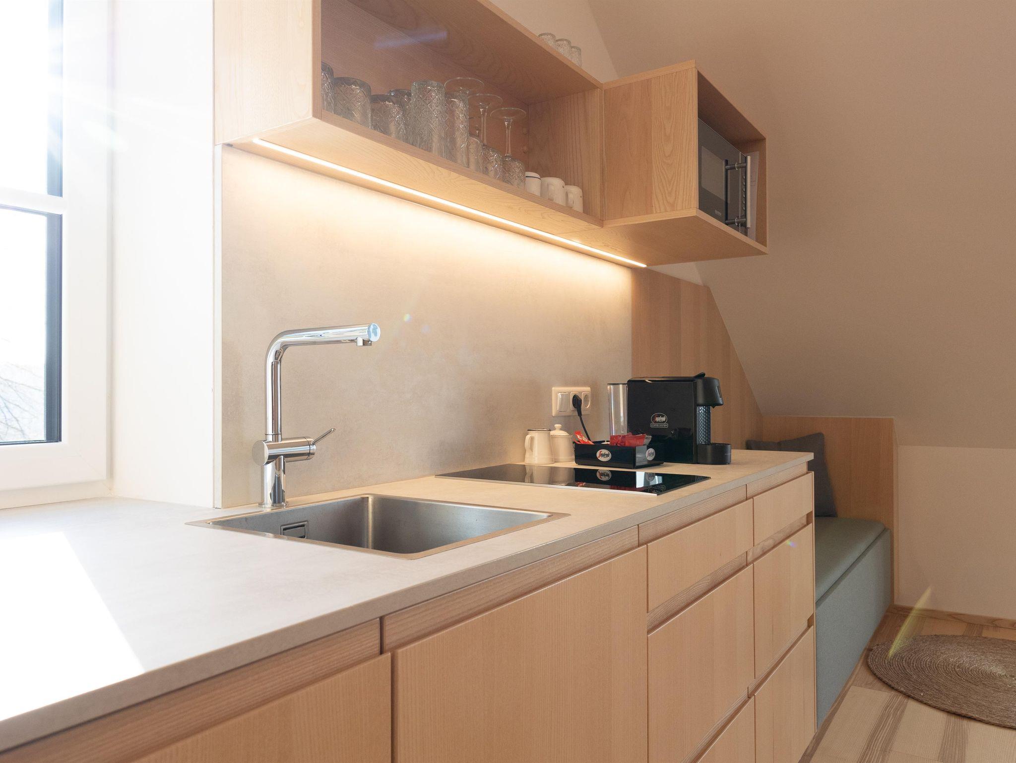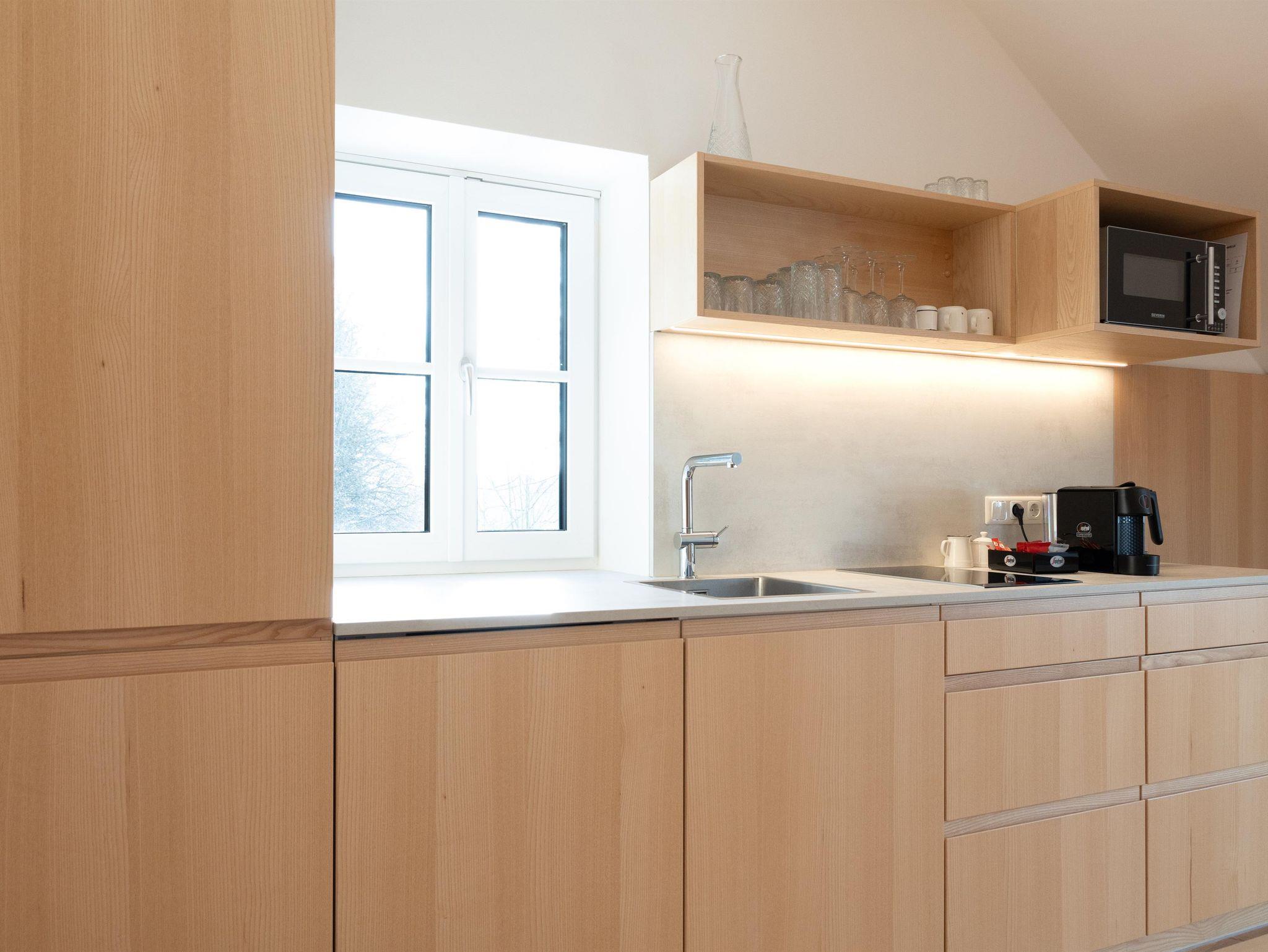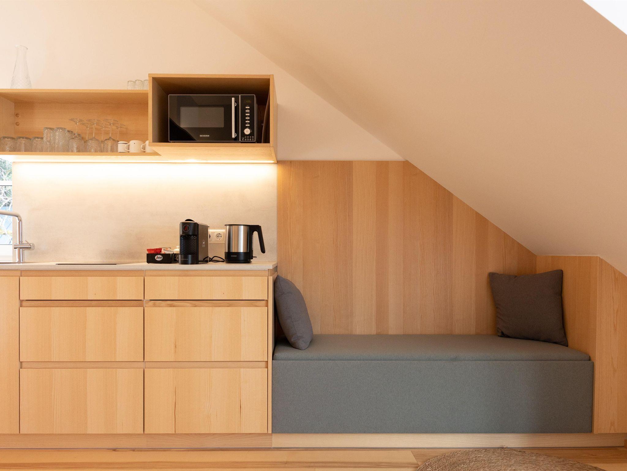Die Ausstattung der Apartments lässt keine Wünsche offen. In den großzügigen Küchen kannst du dich bequem selbst versorgen, und im Vorraum findest du hausgemachte Gerichte in Kühlschränken, die du in deinem Apartment erwärmen kannst. Außerdem findest du im Kühlschrank in den Appartements einige Erfrischungen, die bereits für dich vorbereitet wurden!