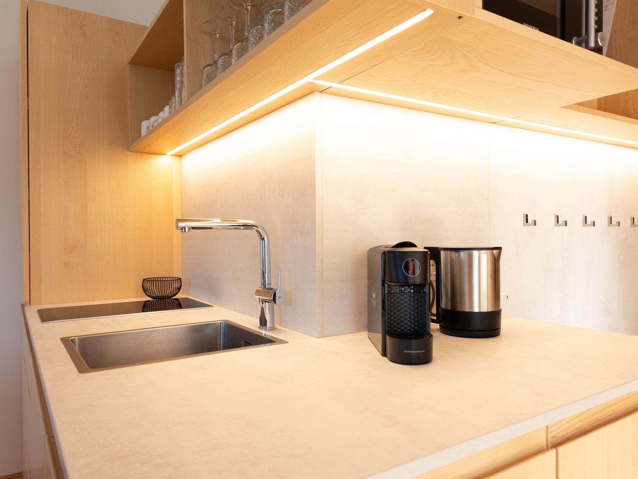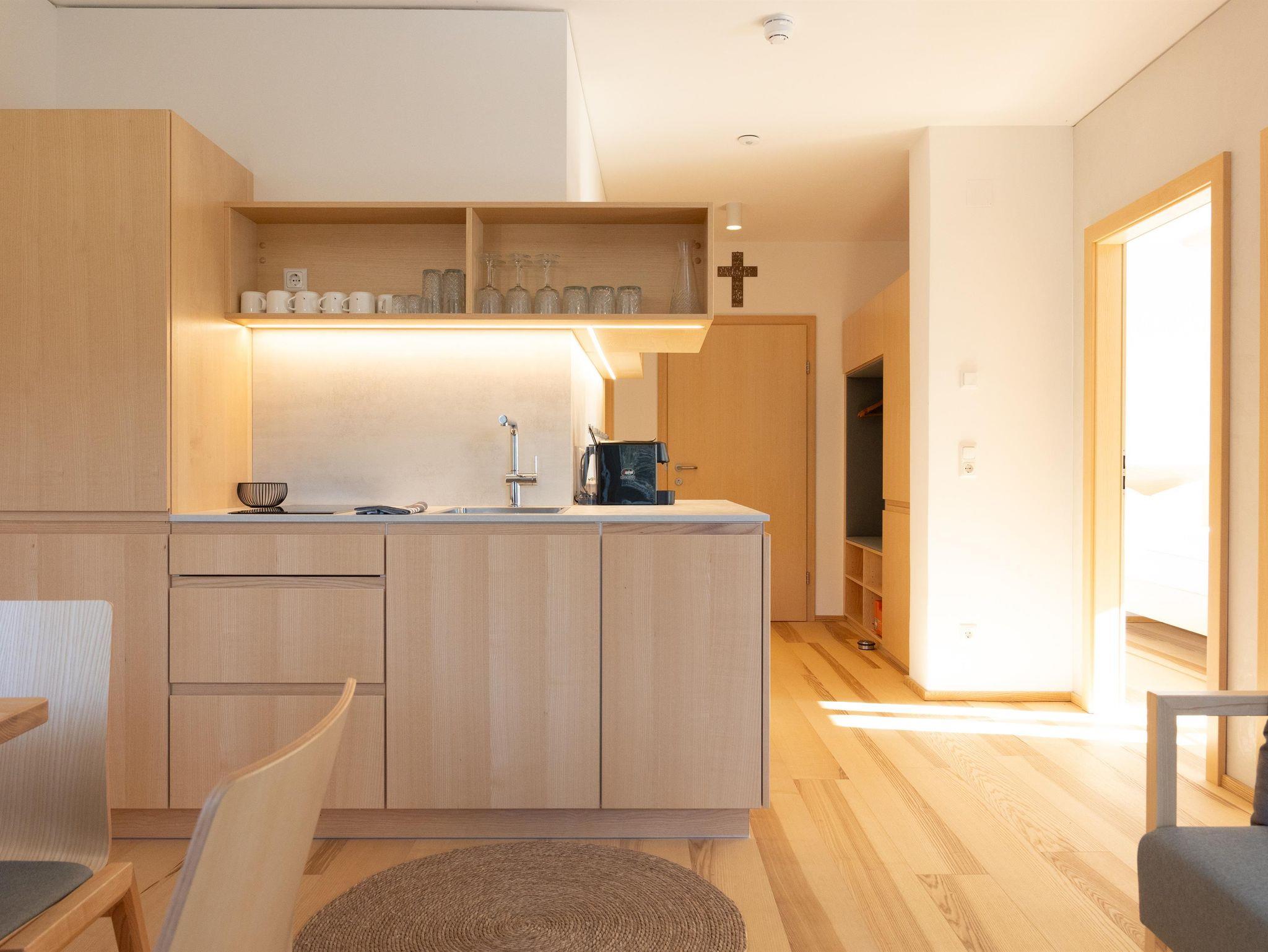 Die Ausstattung der Apartments lässt keine Wünsche offen. In den großzügigen Küchen kannst du dich bequem selbst versorgen, und im Vorraum findest du hausgemachte Gerichte in Kühlschränken, die du in deinem Apartment erwärmen kannst. Außerdem findest du im Kühlschrank in den Appartements einige Erfrischungen, die bereits für dich vorbereitet wurden!