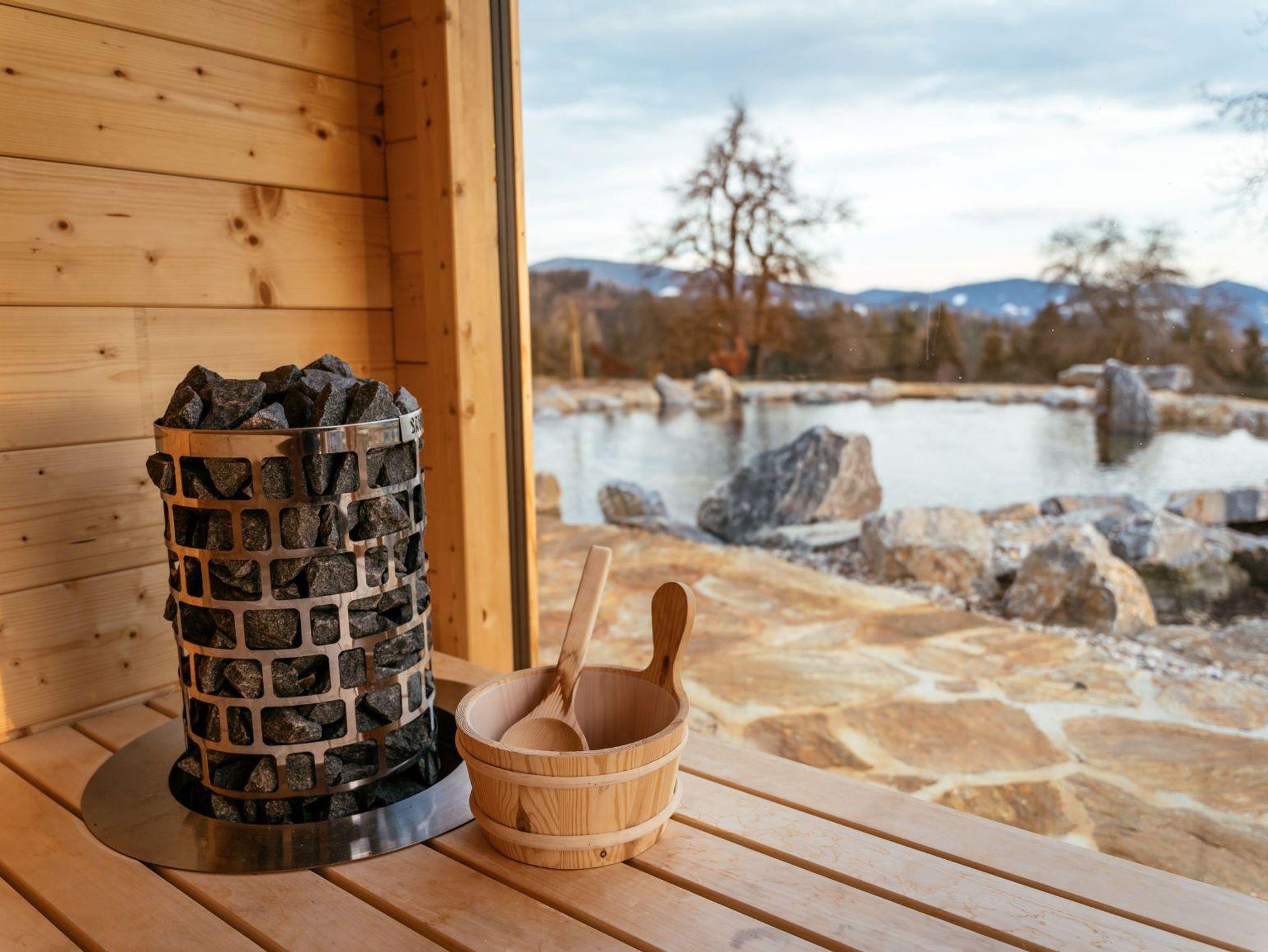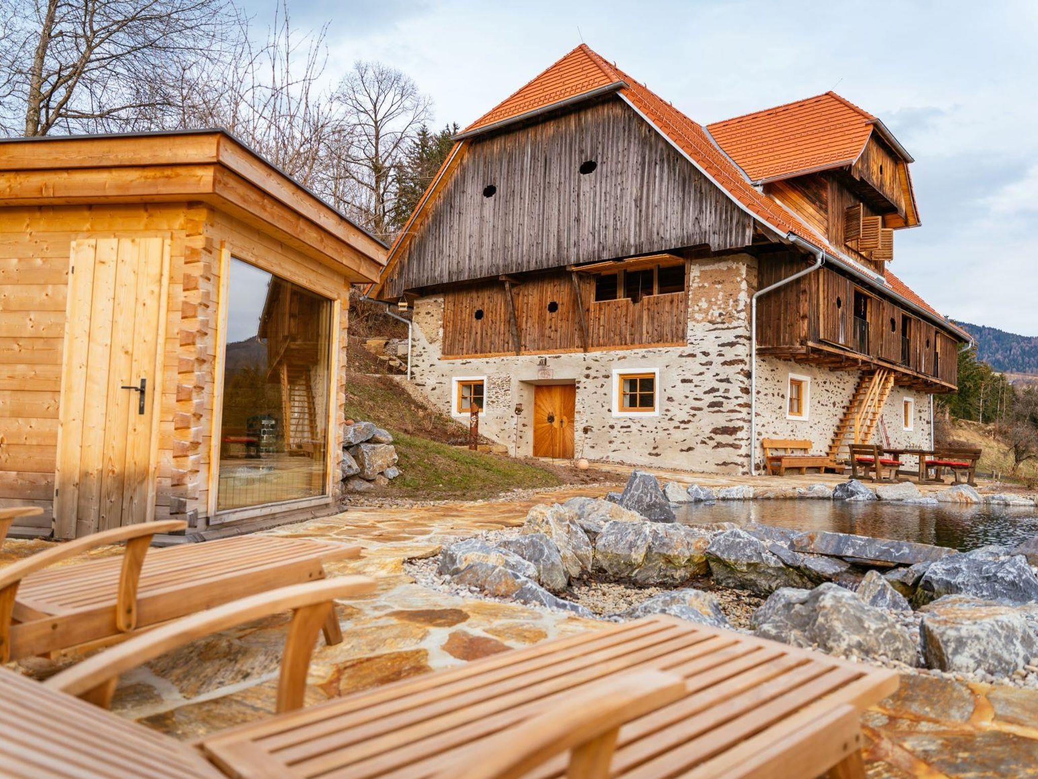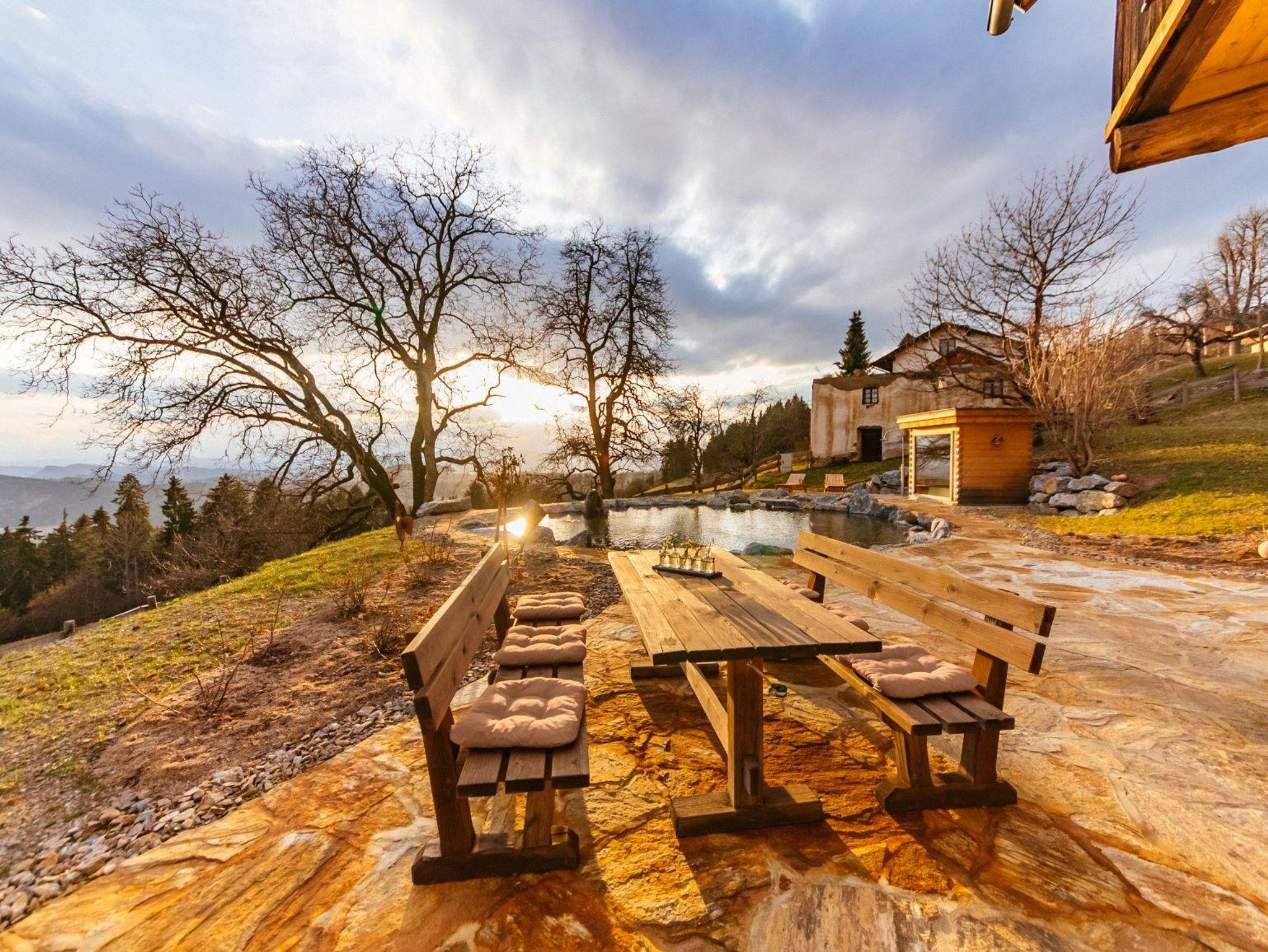 Chalet in Alleinlage mit Naturpool und Außensauna, Weitblick bis zu den Karawanken. Entspannung pur für Körper und Geist.