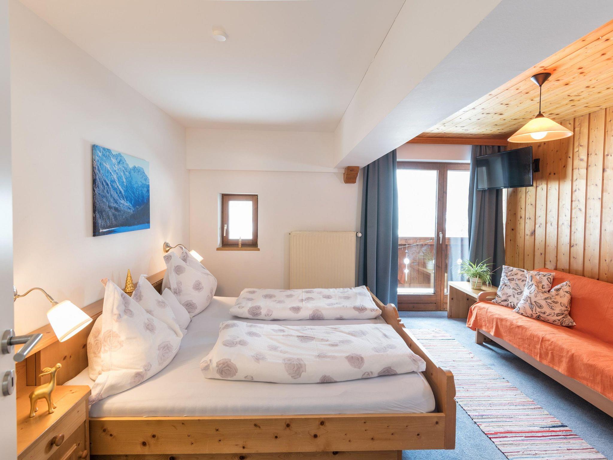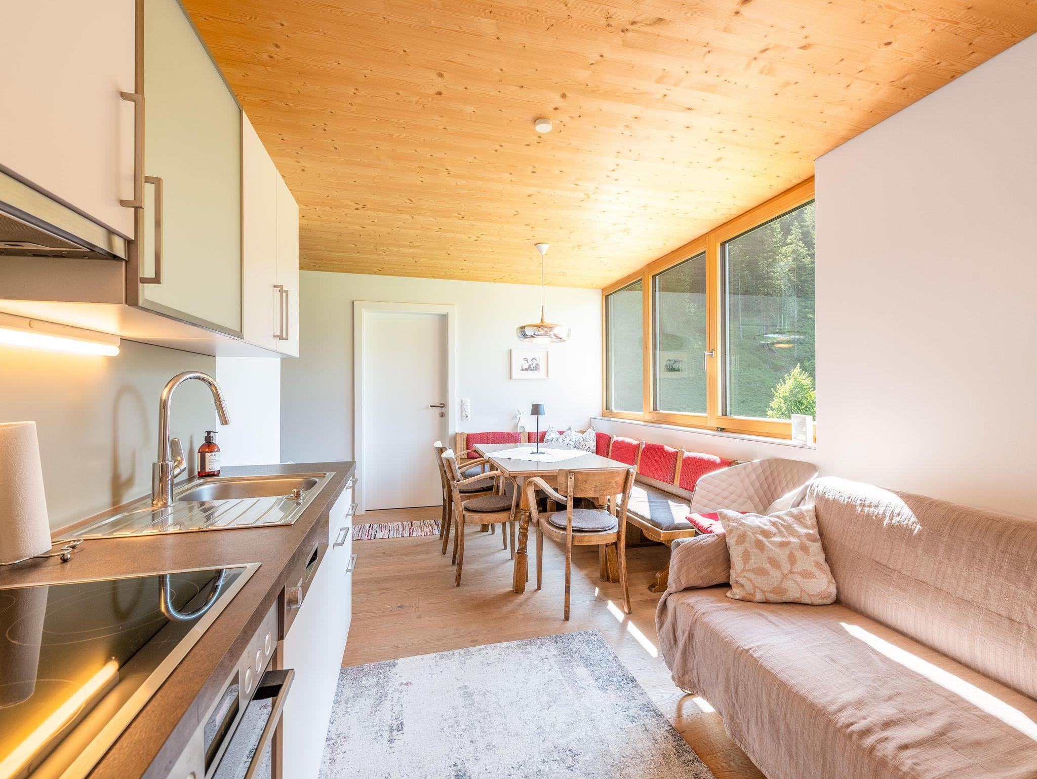 Das Panorama hat einen großartigen Ausblick und - Wohnküche mit Eichenboden, ausziehbarer Couch & Panoramafenster - 1 Schlafzimmer mit Doppelbett aus Zirbenholz/Holzboden & 1 Schlafzimmer mit Doppelbett/ausziehbarer Couch - Bad/WC - Balkon