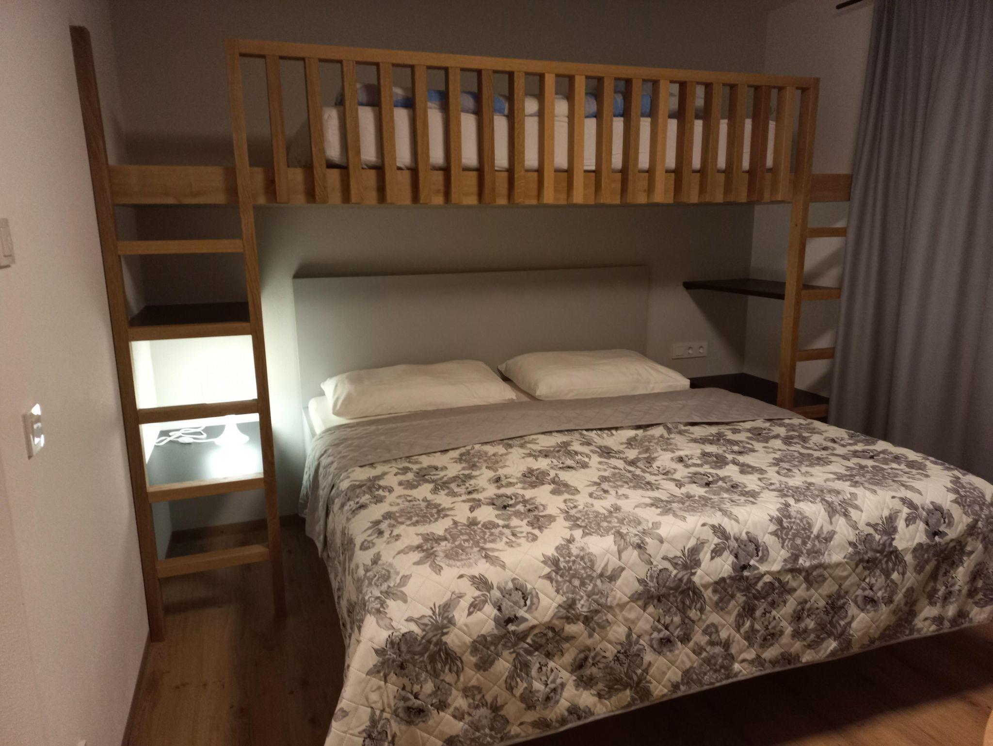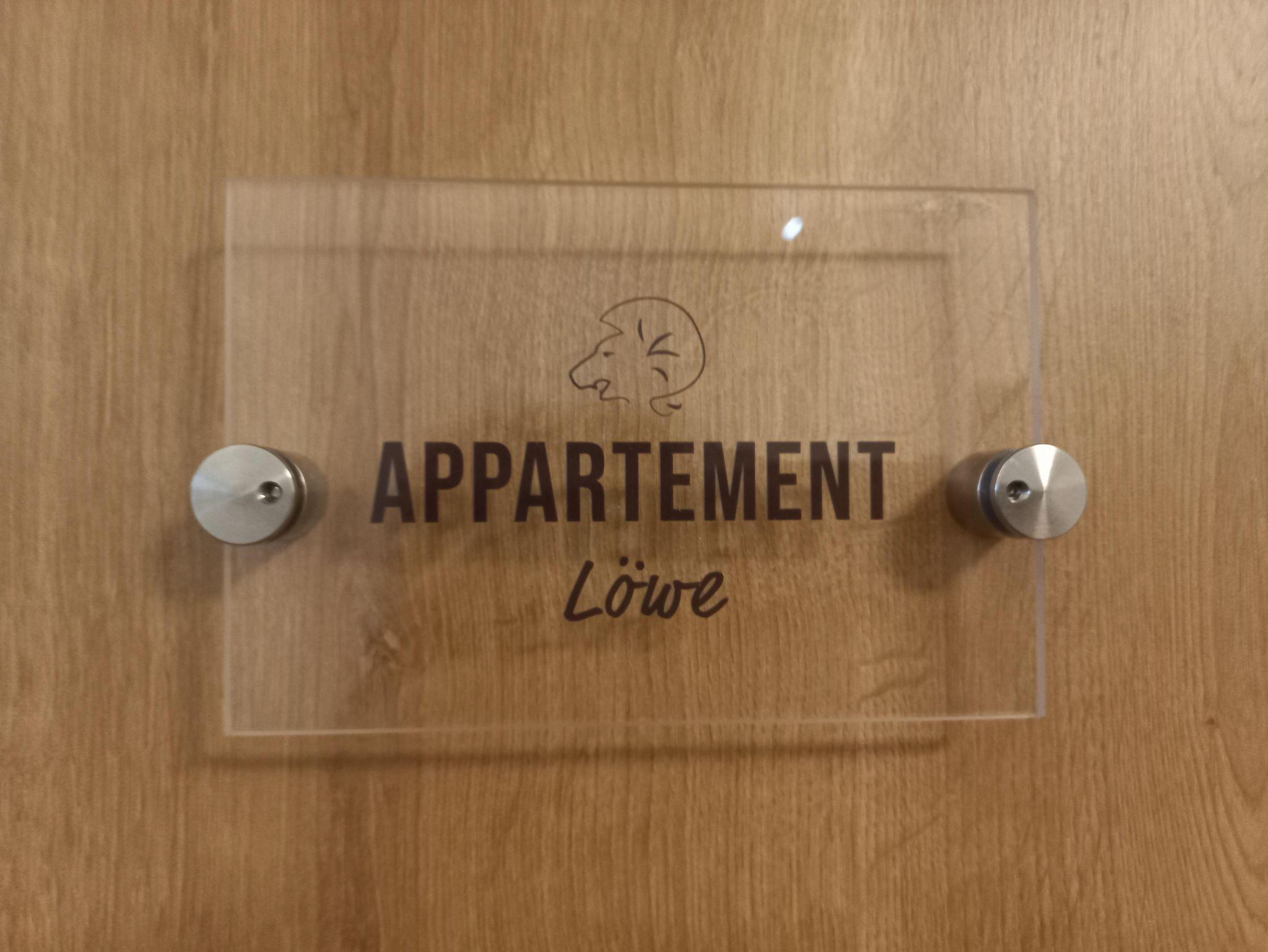 Das Apartment Löwe im ersten Stock bietet auf 36 m² Platz für bis zu 3 Personen. Es verfügt über ein Schlafzimmer mit einem Doppelbett und einem Hochbett, das sich für ein Kind eignet. Ein modernes Badezimmer mit Dusche und WC sorgt für zusätzlichen Komfort.