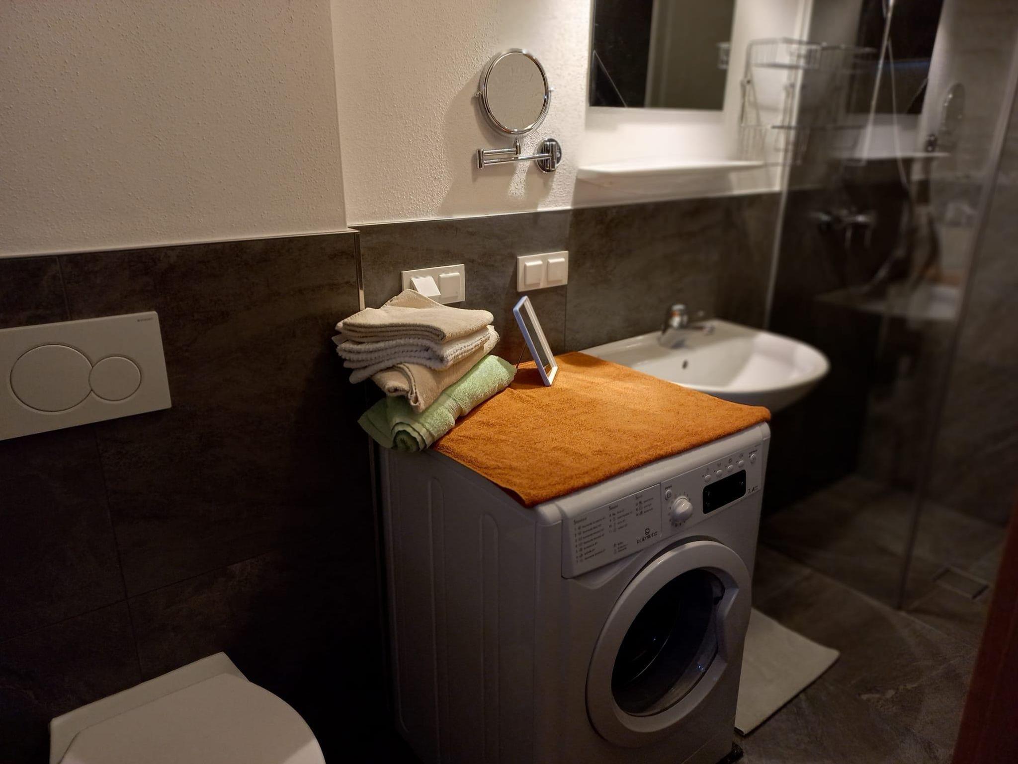 Ein stilvolles Badezimmer mit Dusche und WC rundet das kompakte und komfortable Wohnkonzept ab.