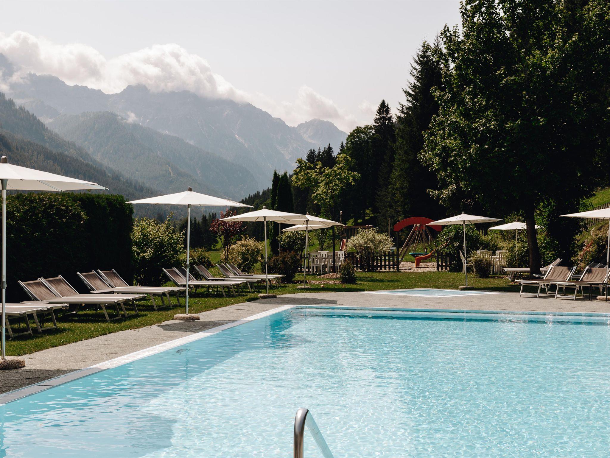 Familien genießen großzügige Zimmer & Studios, den Kinderspielraum im Haus sowie den Garten mit Kleinkinder-Spielturm, Freibad mit beheiztem Außenpool und eigenem Kleinkinderbecken (im Sommer, 3 Gehminuten vom Hotel)
