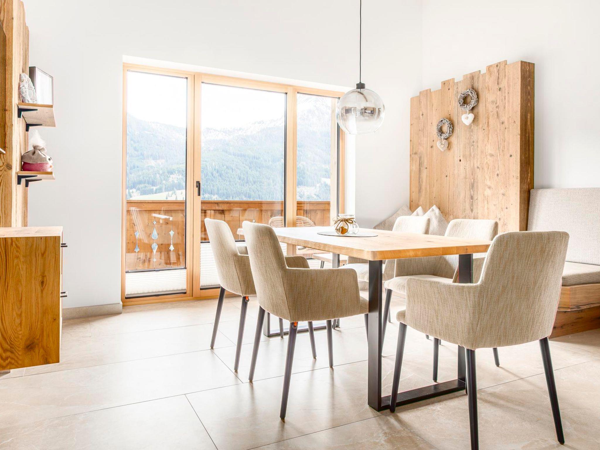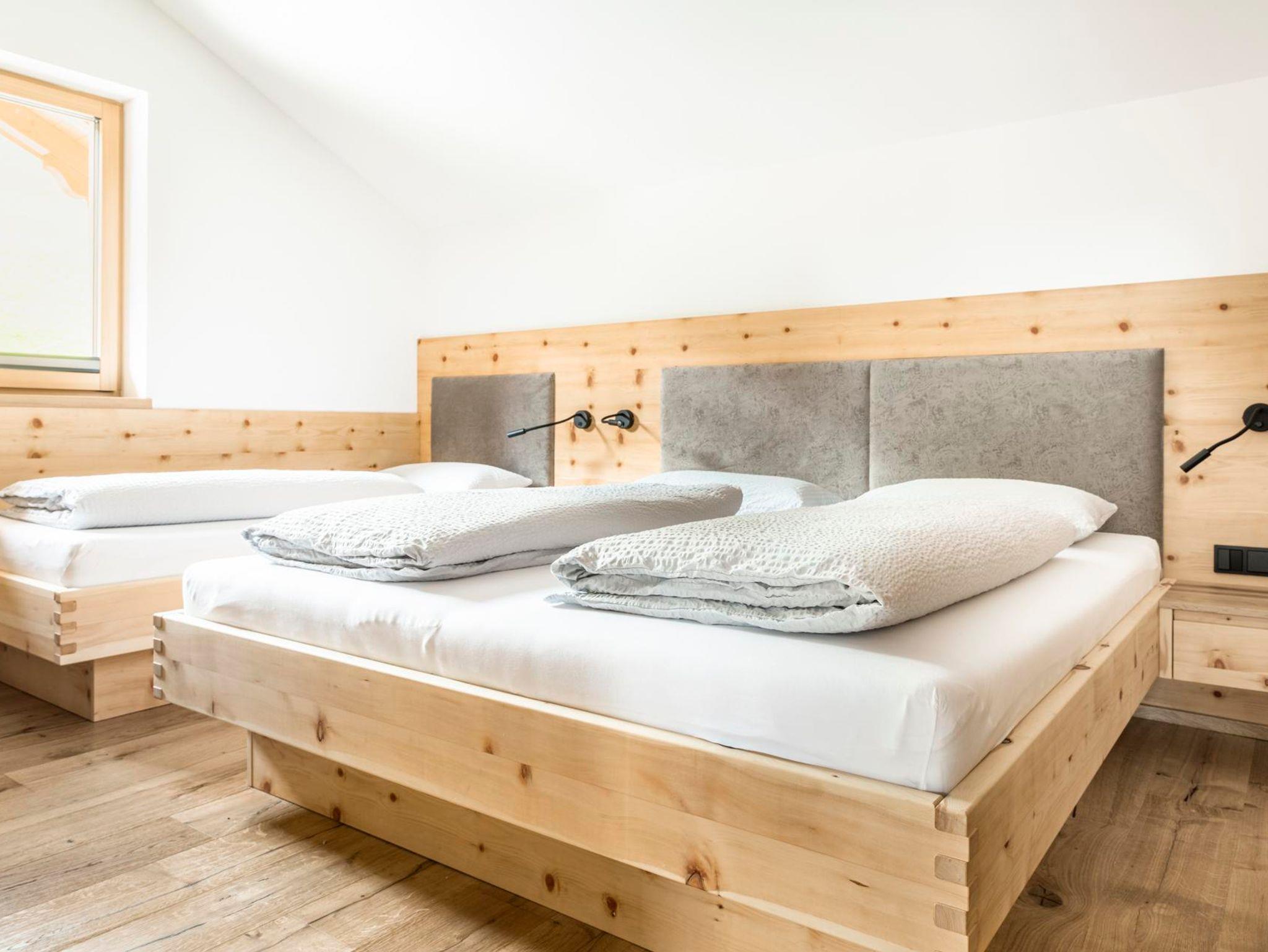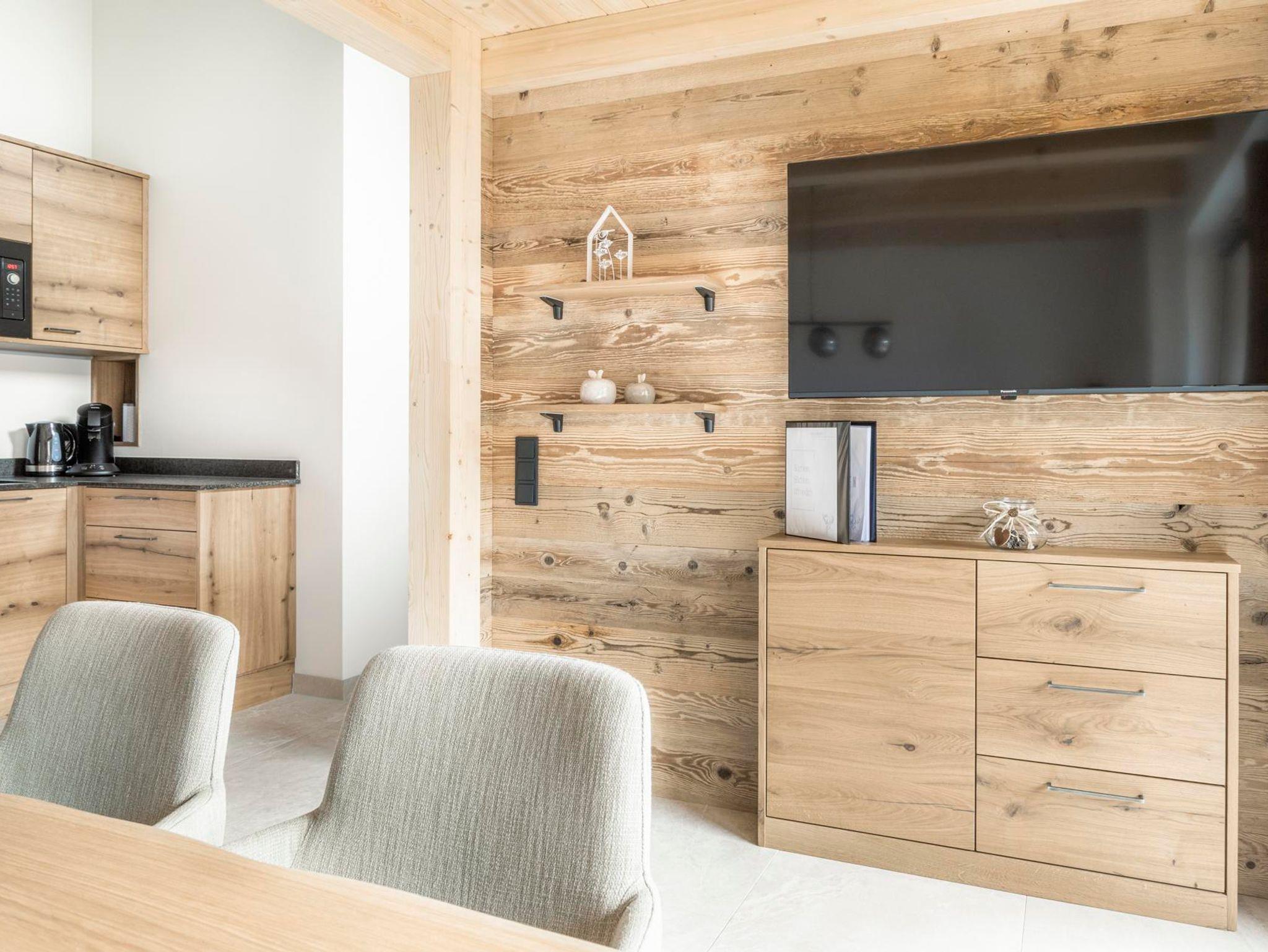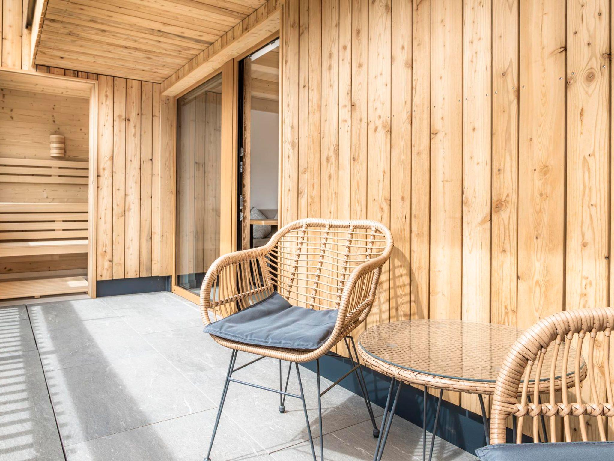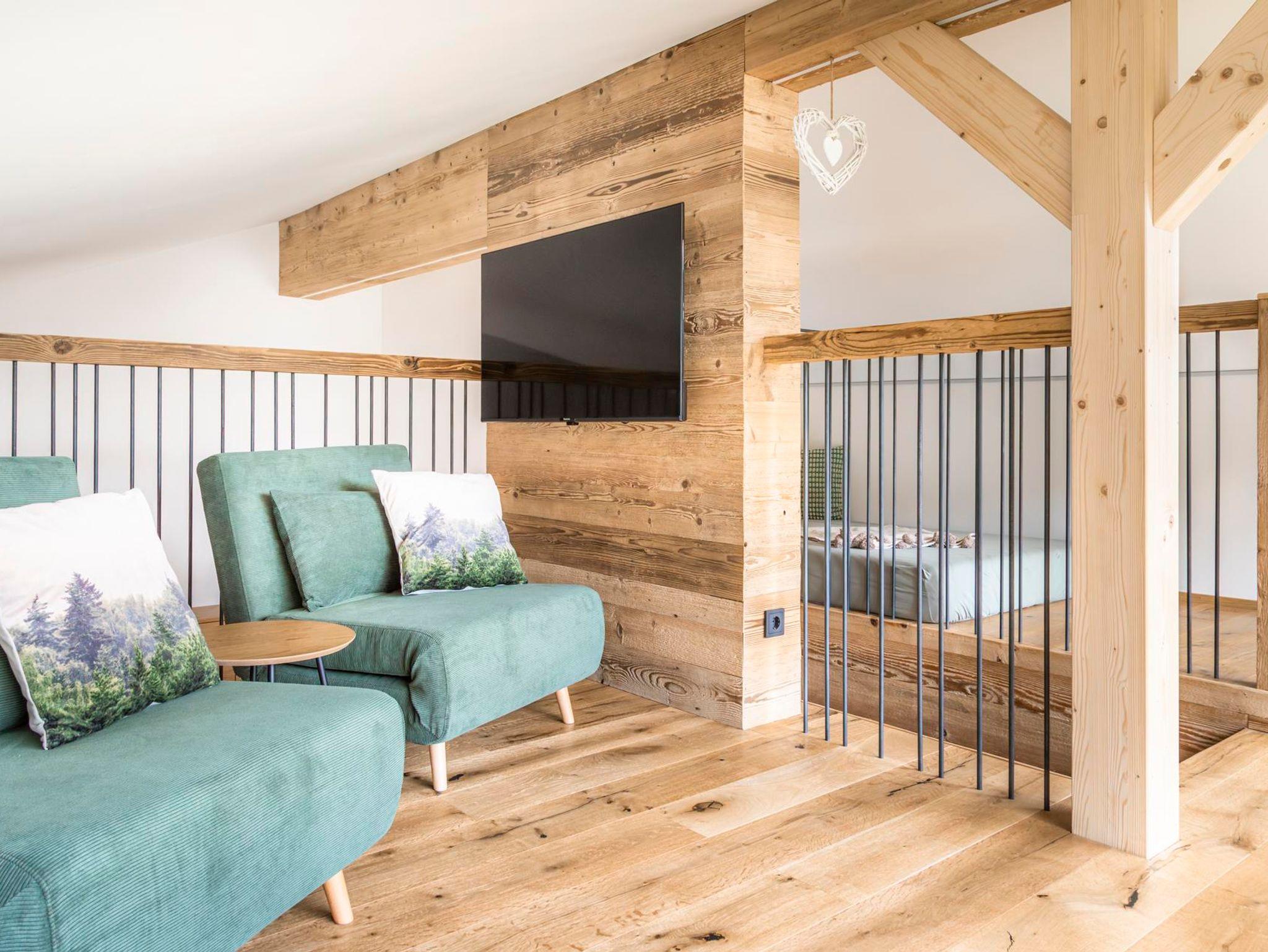 Die zwei neu erbauten Ferienwohnungen im 2. Stock bieten Freiraum, Tischlermöbel und sind nach der Morgensonne ausgerichtet. Zusätzlich verfügen sie über zwei eigene Saunen mit Panoramafenster im Außenbereich. Wellnessurlaub inklusive