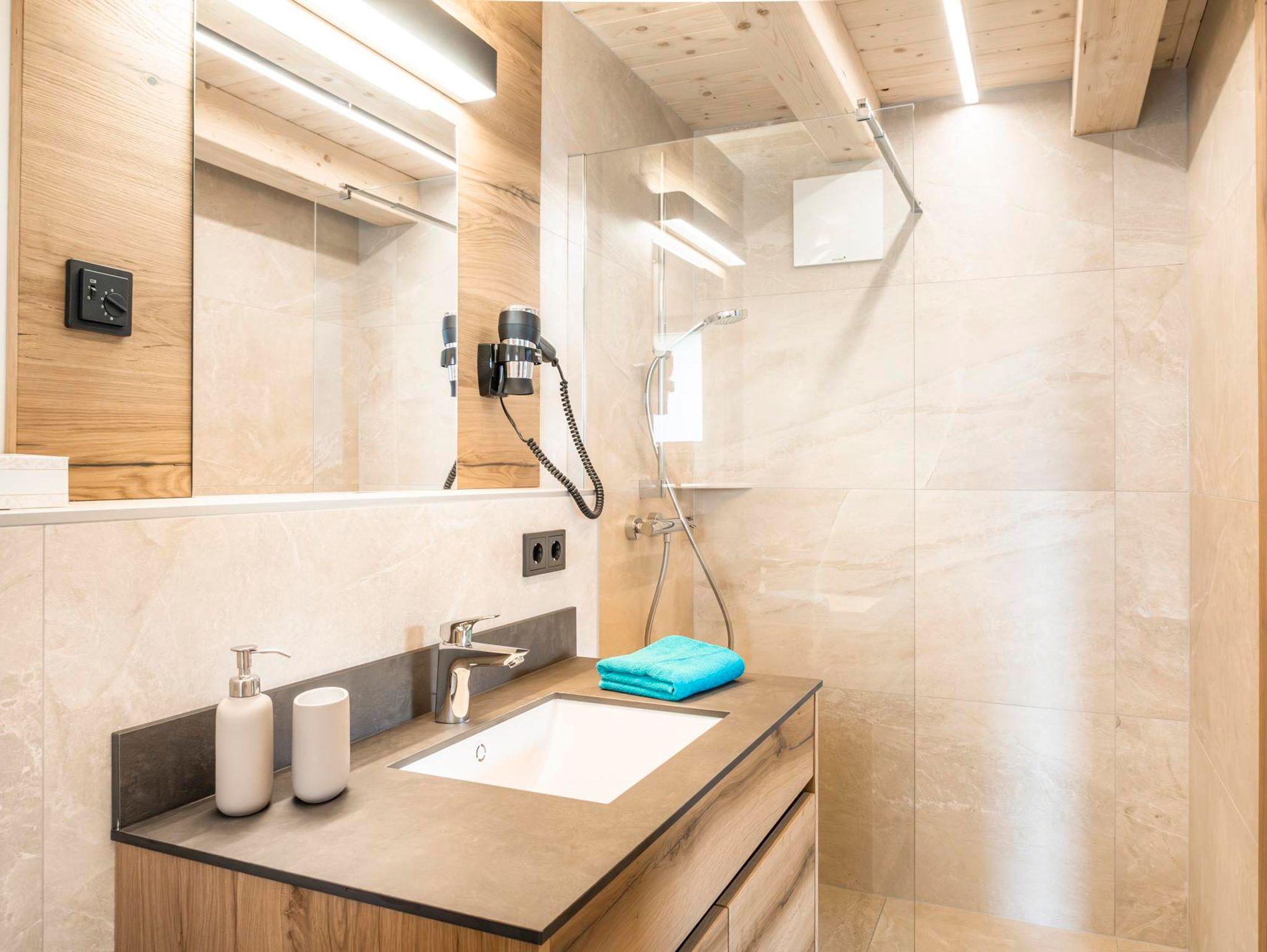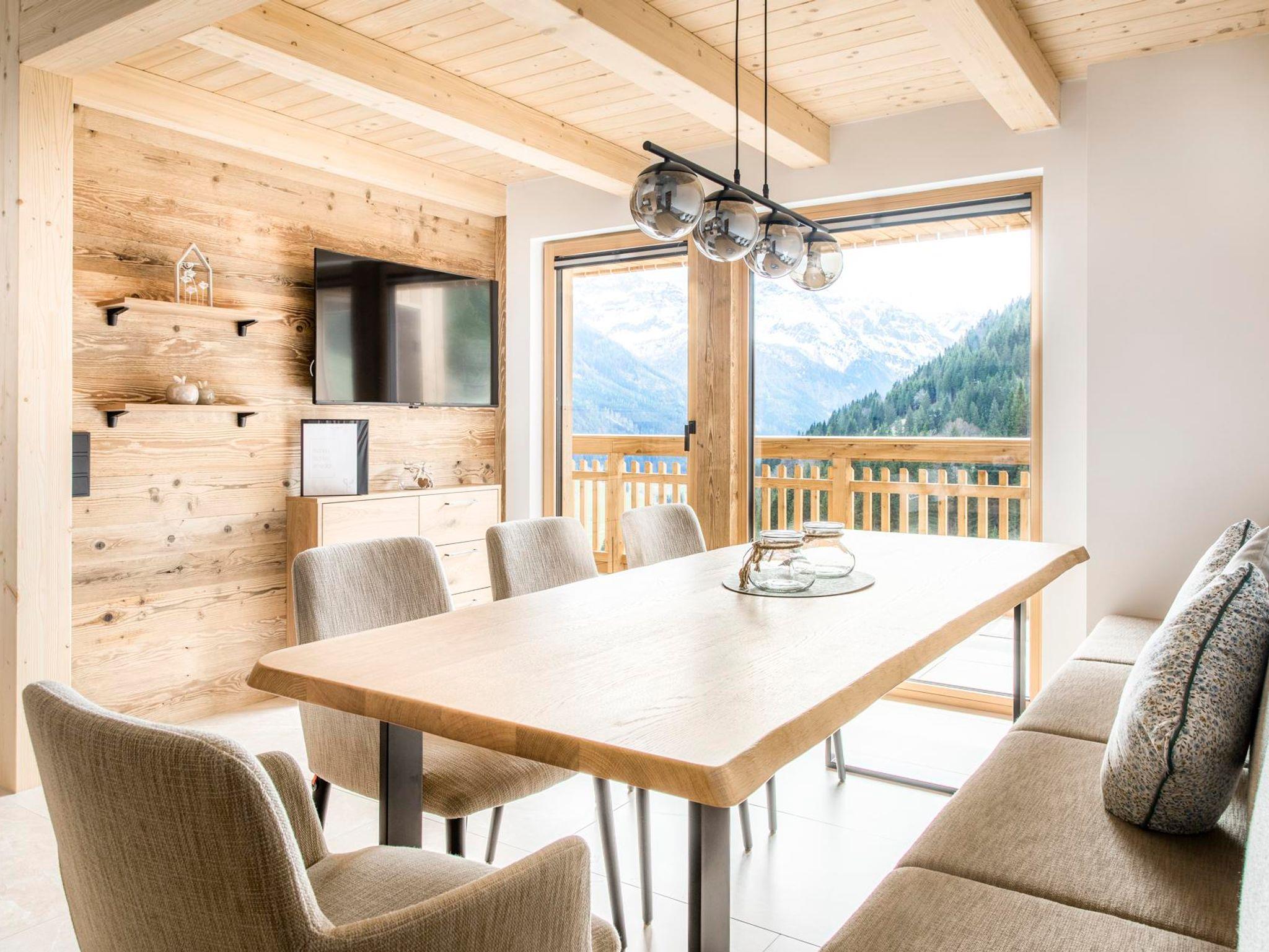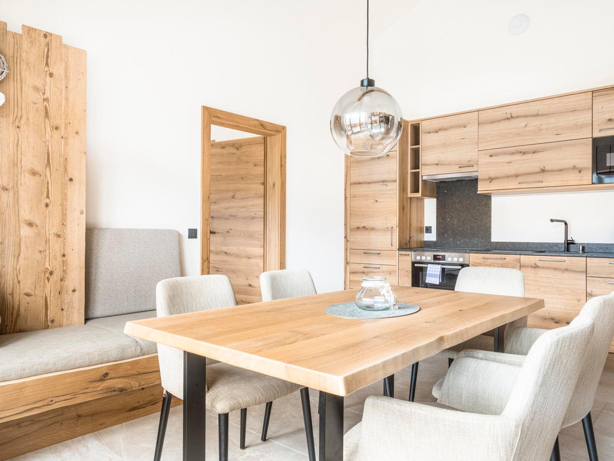 Das Appartement bietet Platz für bis zu 7 Personen und ist 90m² groß und hat ein 2-Bett- und ein 3-Bettzimmer mit jeweils zwei Bädern & WC und einem extra WC. Der Weg zur Außensauna mit Panoramafenster führt über die Wohnküche und den Balkon.
