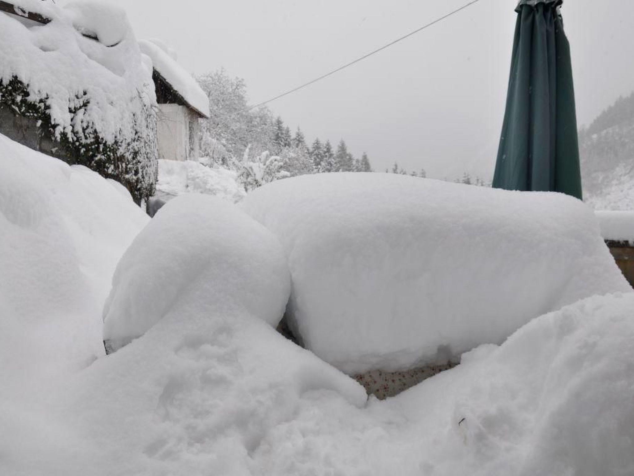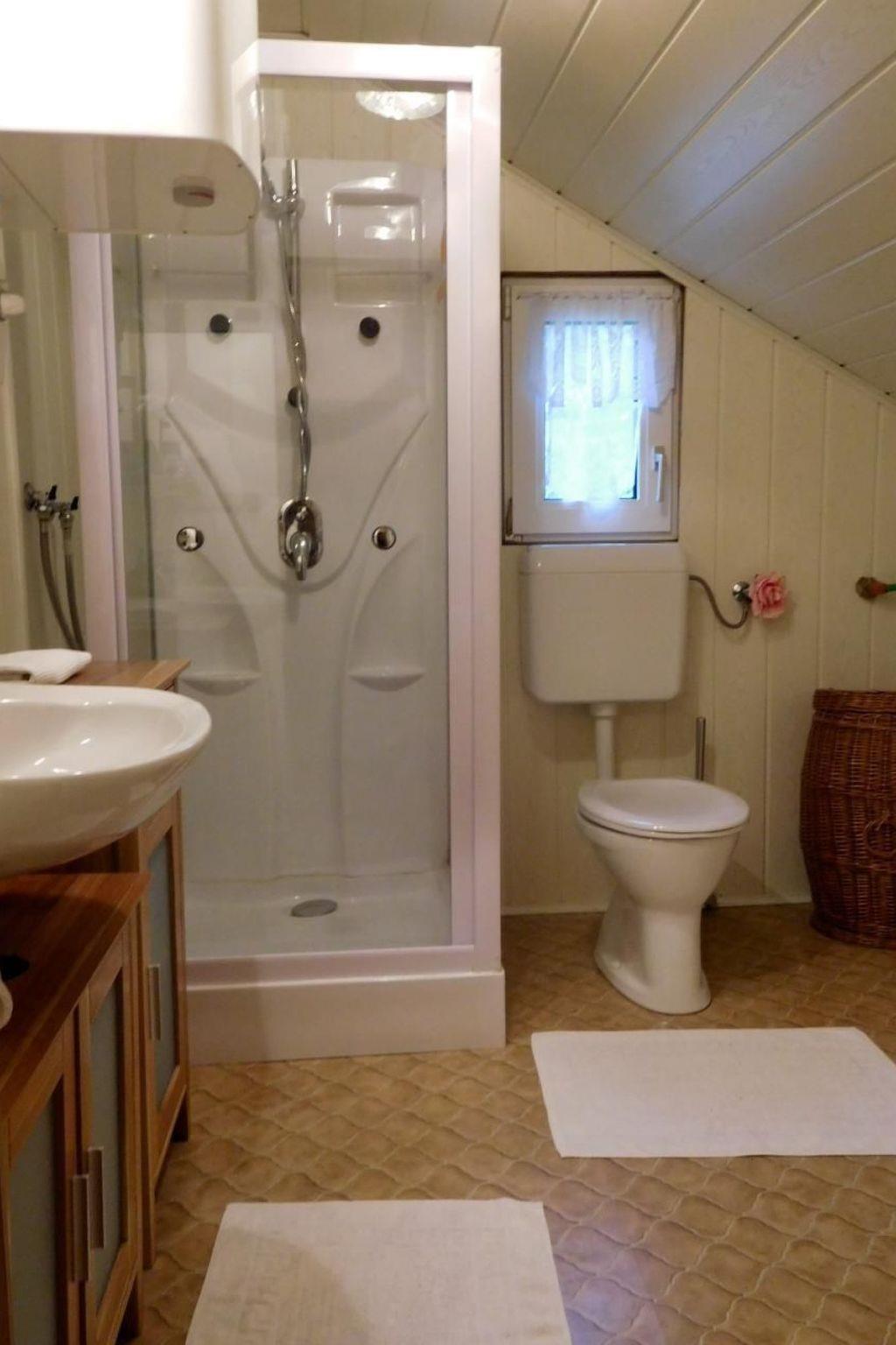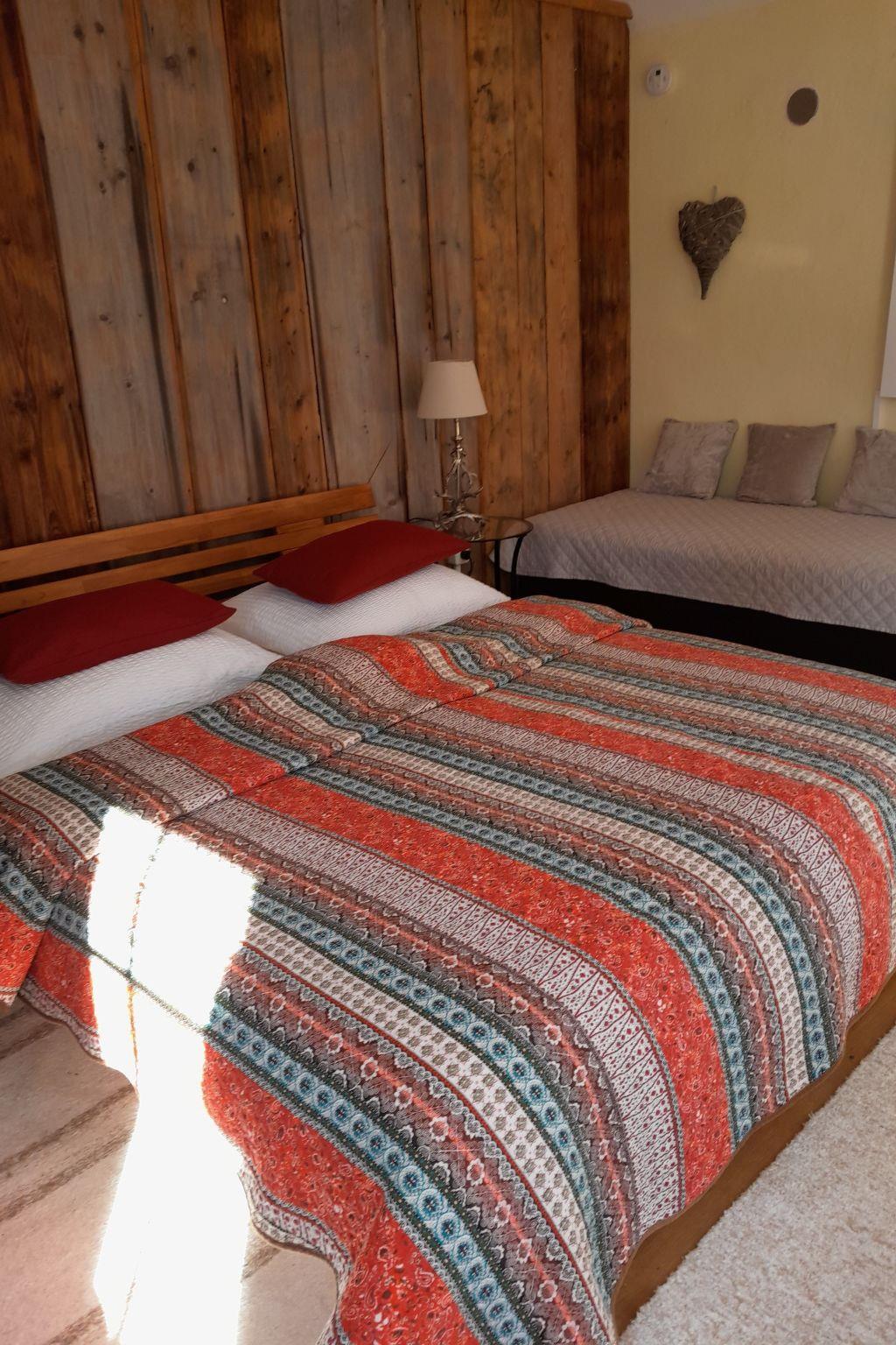 Inside you will find a cosy ground floor with living room and kitchen corner, equipped with electric hob and oven, microwave, crockery, kettle, toaster, Nespresso machine, filter coffee machine, blender and a large fridge with freezer compartment. A steep wooden staircase leads to the first floor, where there is a large bedroom with a double and single bed and an antique farmhouse wardrobe. On the upper floor, guests will find another bedroom with the same bed configuration. The house offers modern amenities such as infrared heating panels, satellite TV, a washing machine and a well-equipped bathroom with shower, WC and hairdryer.