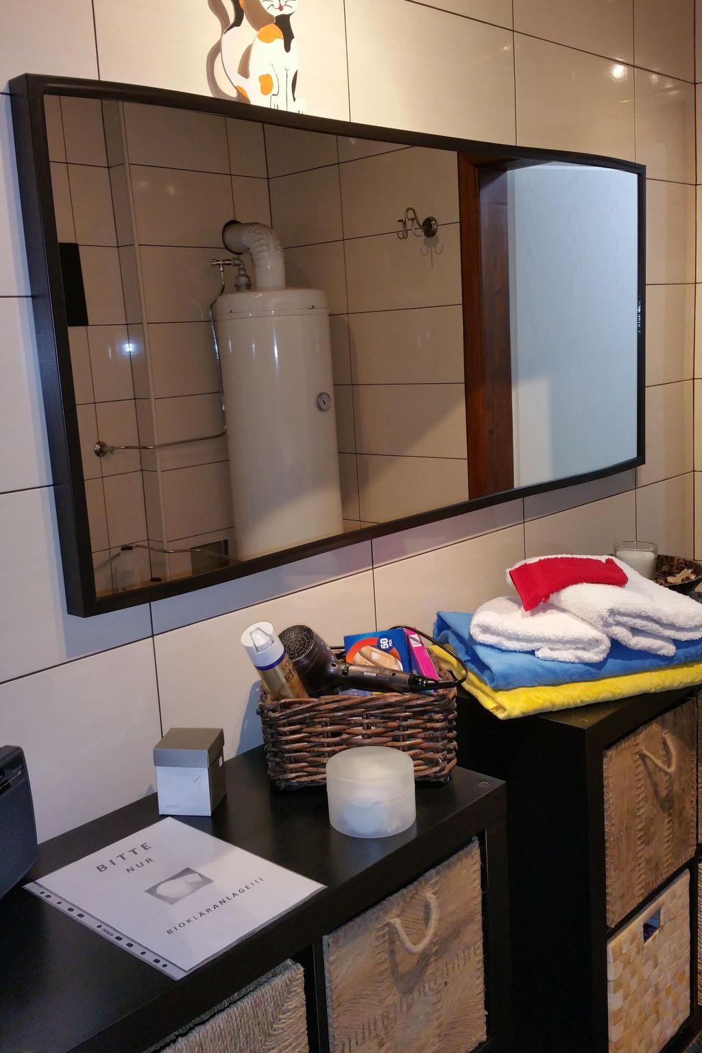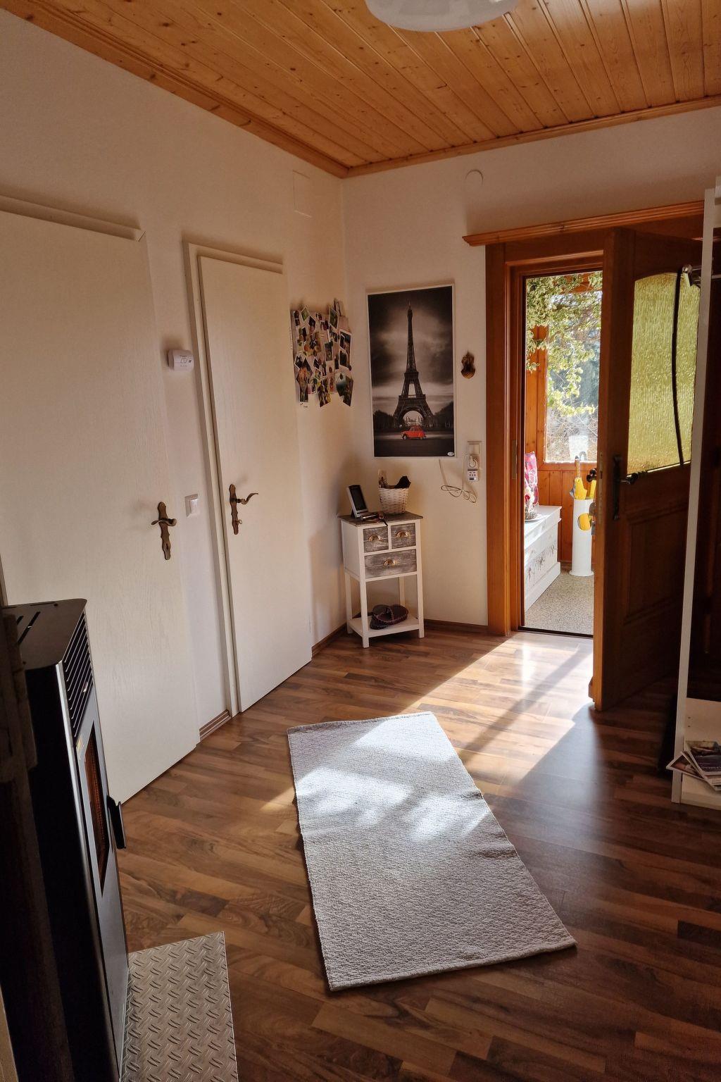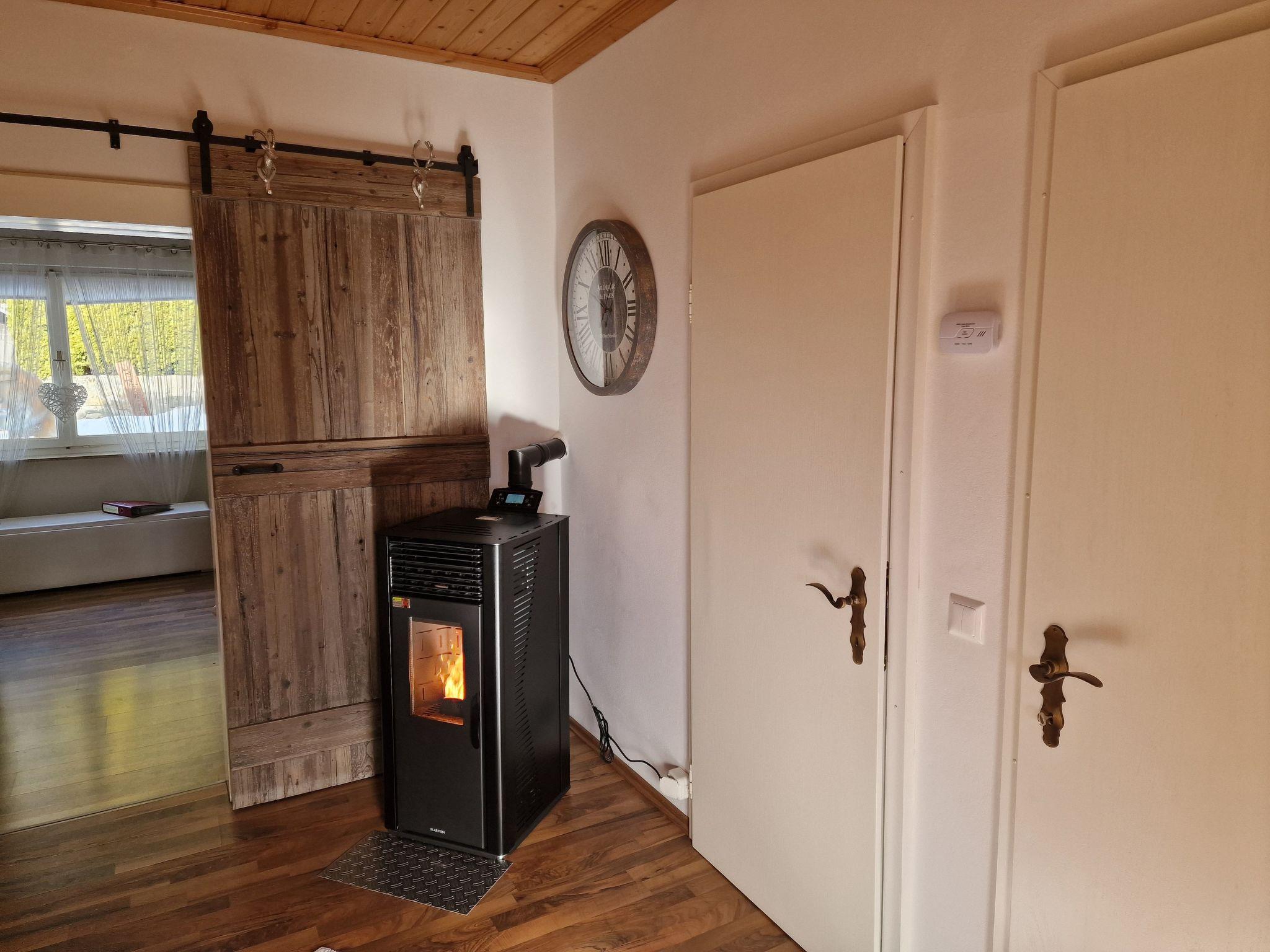 The house consists of a bedroom, a living room, a little entrance area, a pantry, a little dining corner and a fully-equipped kitchen, as well as a bathroom with a bath, washbasin and WC. The kitchen is equipped with a dishwasher, microwave, Nespresso machine, electric stove, filter coffee machine, fridge and freezer, crockery and tea towels. You can also cook with an additional hob. Sugar and salt are provided. The bedroom has a double bed and satellite TV, as well as bed linen. The bathroom consists of a bath, WC, washbasin, toilet paper, towels, bathrobes, bath towels. The hot water is heated with a bathroom boiler. Pellets heating is possible throughout. In the living room there is a Haas stove with a glass front for cosy hours, as well as a satellite TV, a leather sofa that can be pulled out for 1-2 people. The house was generally renovated in 2017. The flooring consists of laminate, with tile in the bathroom. The wood and pellets are provided by the owner.