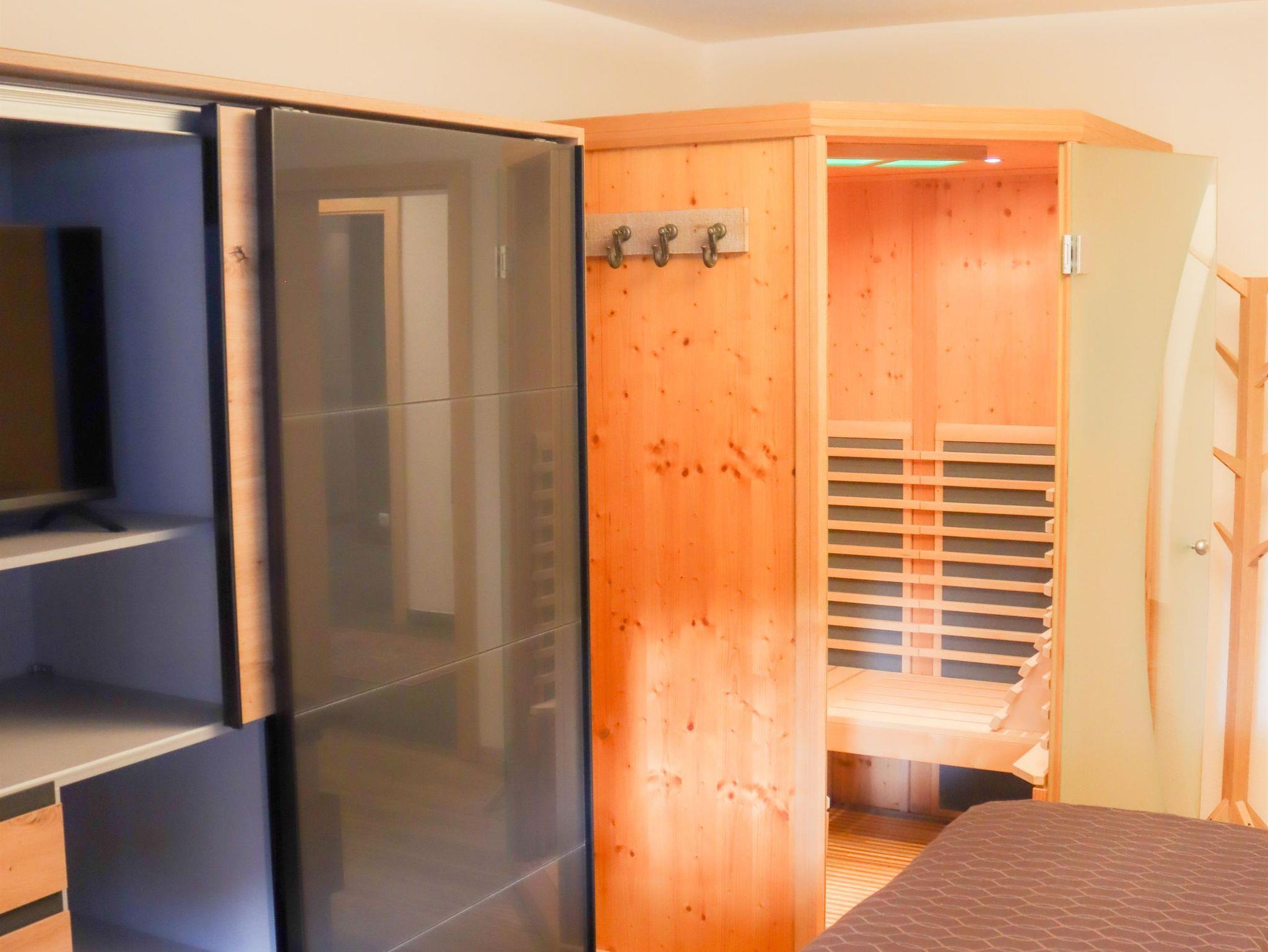 Die exklusive Ferienwohnung mit Infrarotkabine ist 110m² groß und verfügt über 2 Schlafzimmer mit Flachbild TV, kostenfreies WLAN, Infrarotkabine, Wohnzimmer mit Schlafcouch und Flachbild TV, Esszimmer, eine komplett ausgestattete Küche mit Geschirrspüler und Mikrowelle, 1 Badezimmer mit Dusche und Badewanne, WC und eine Waschmaschine. Alle Fenster sind mit Außenrollos und Fliegengitter ausgestattet.