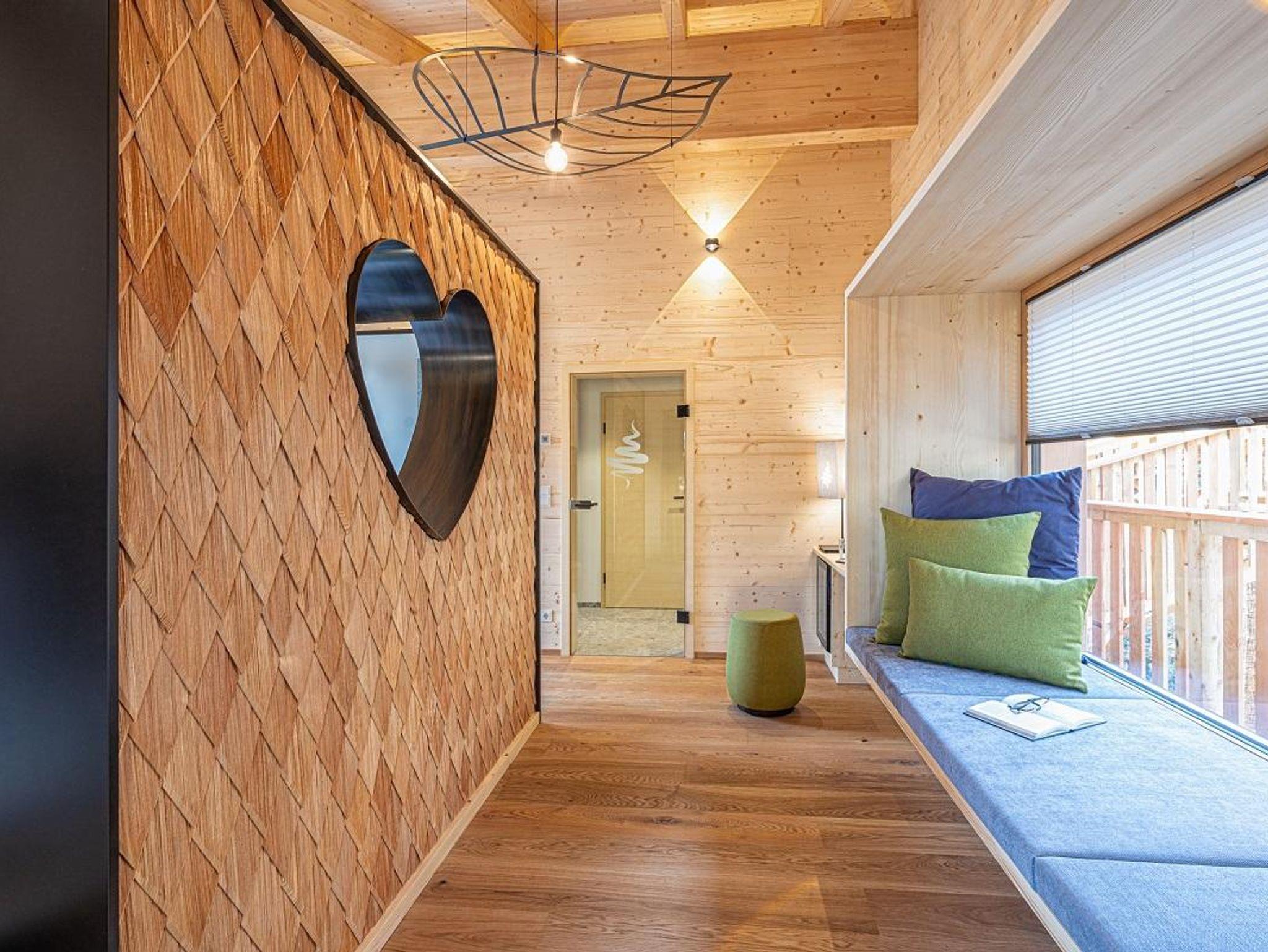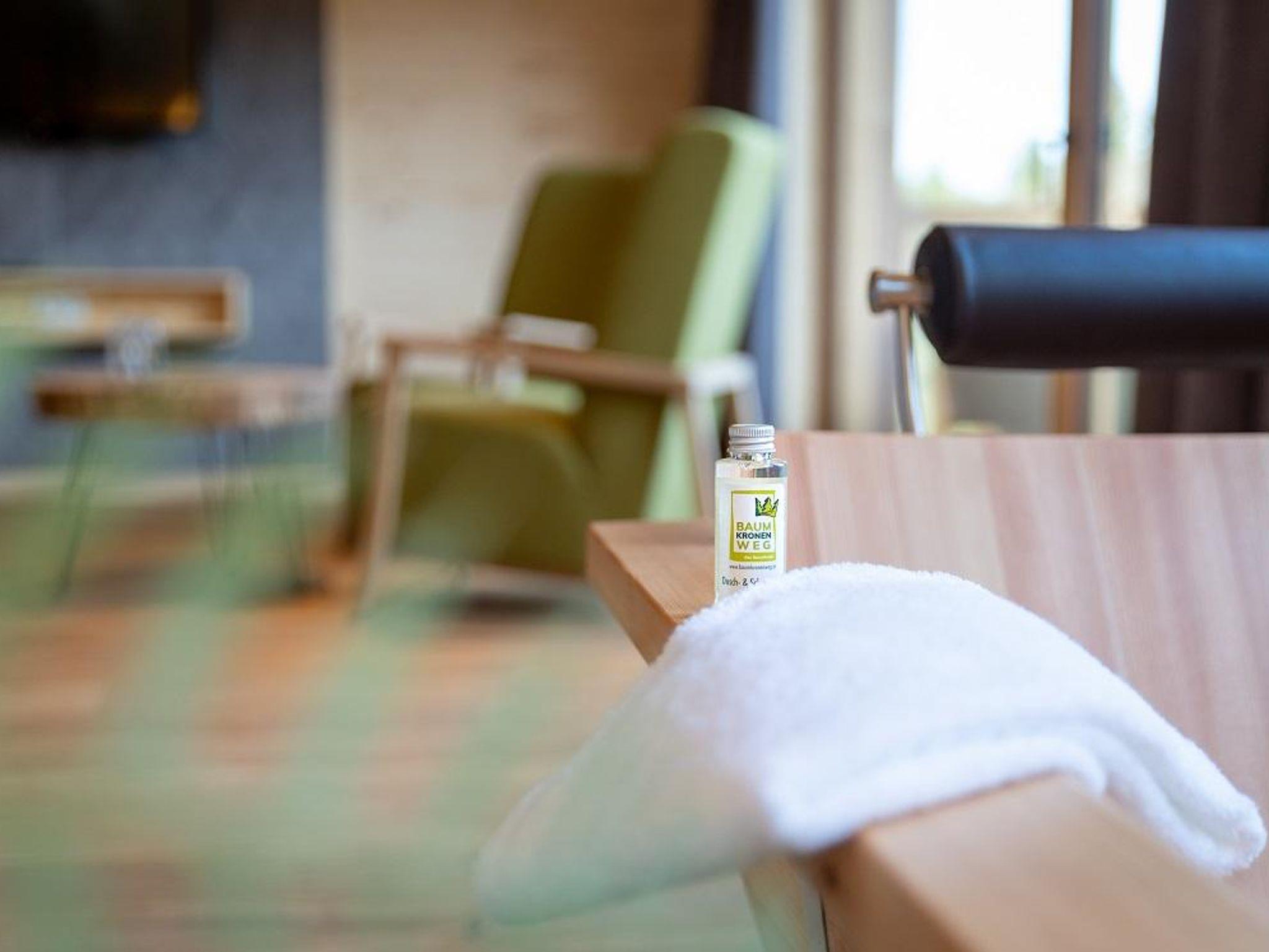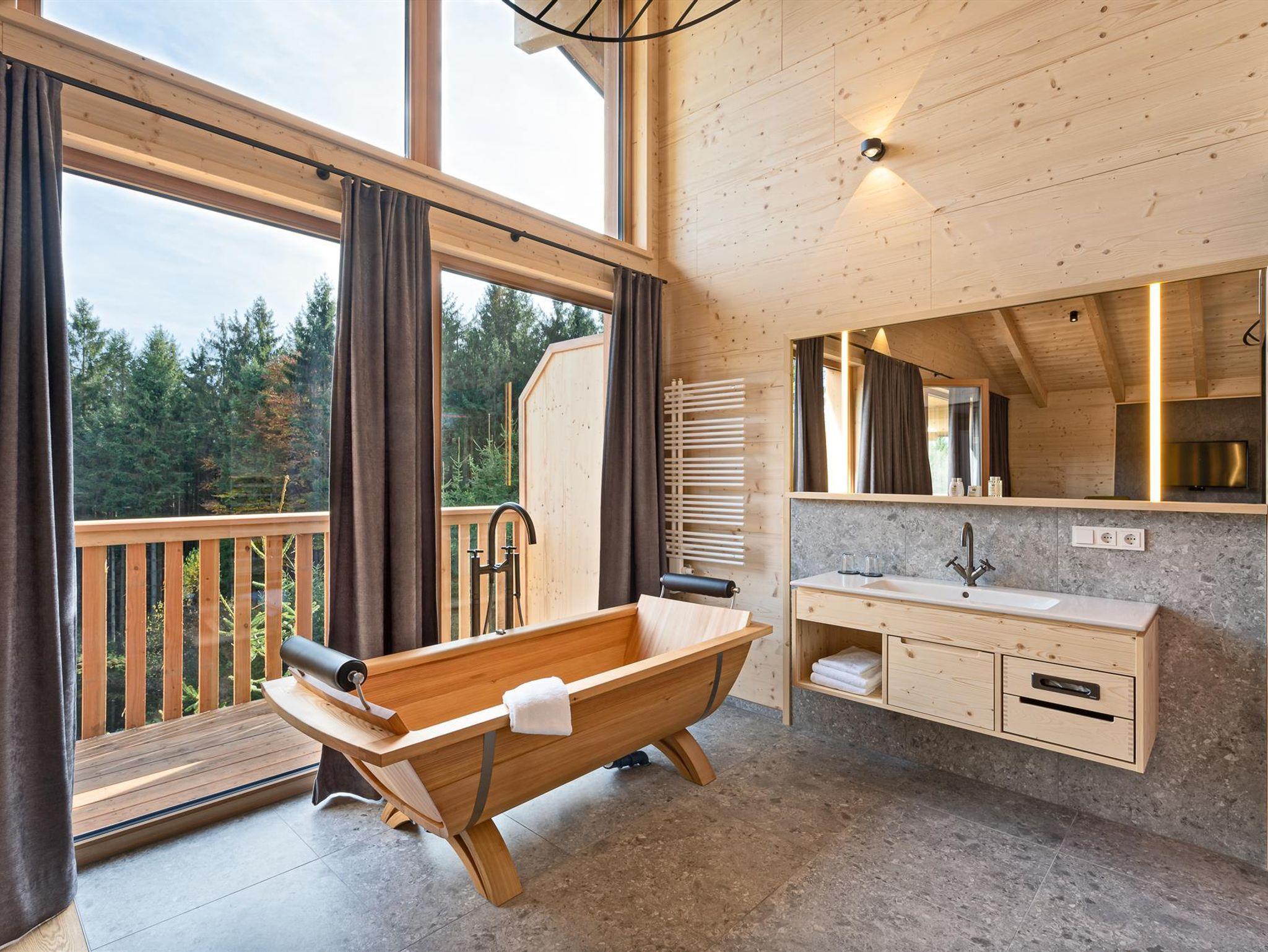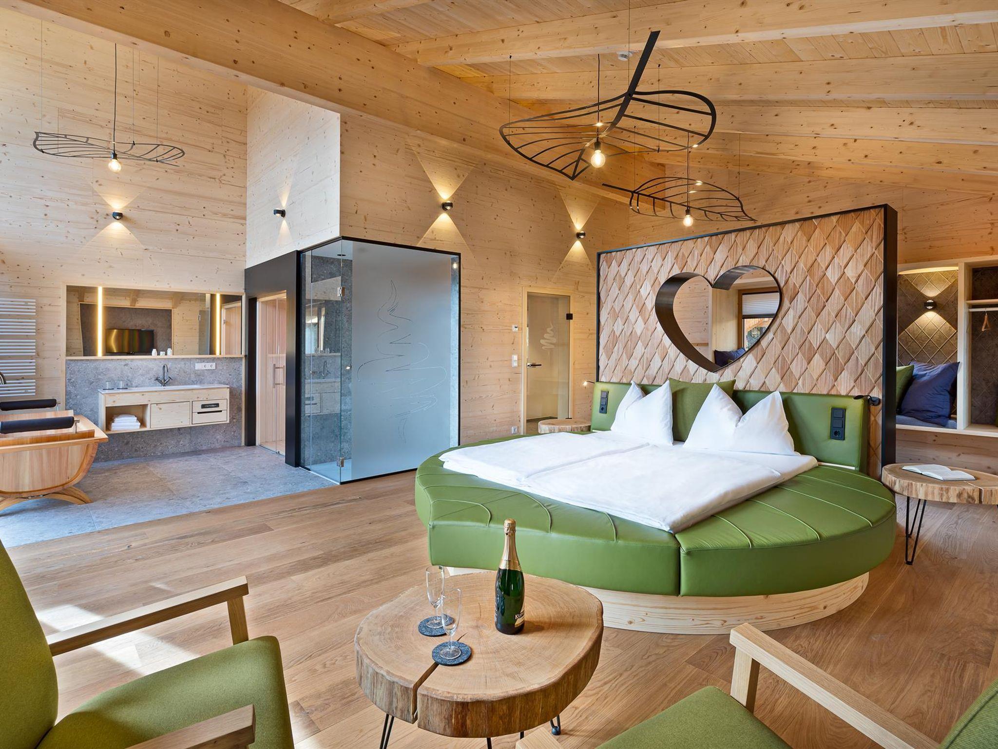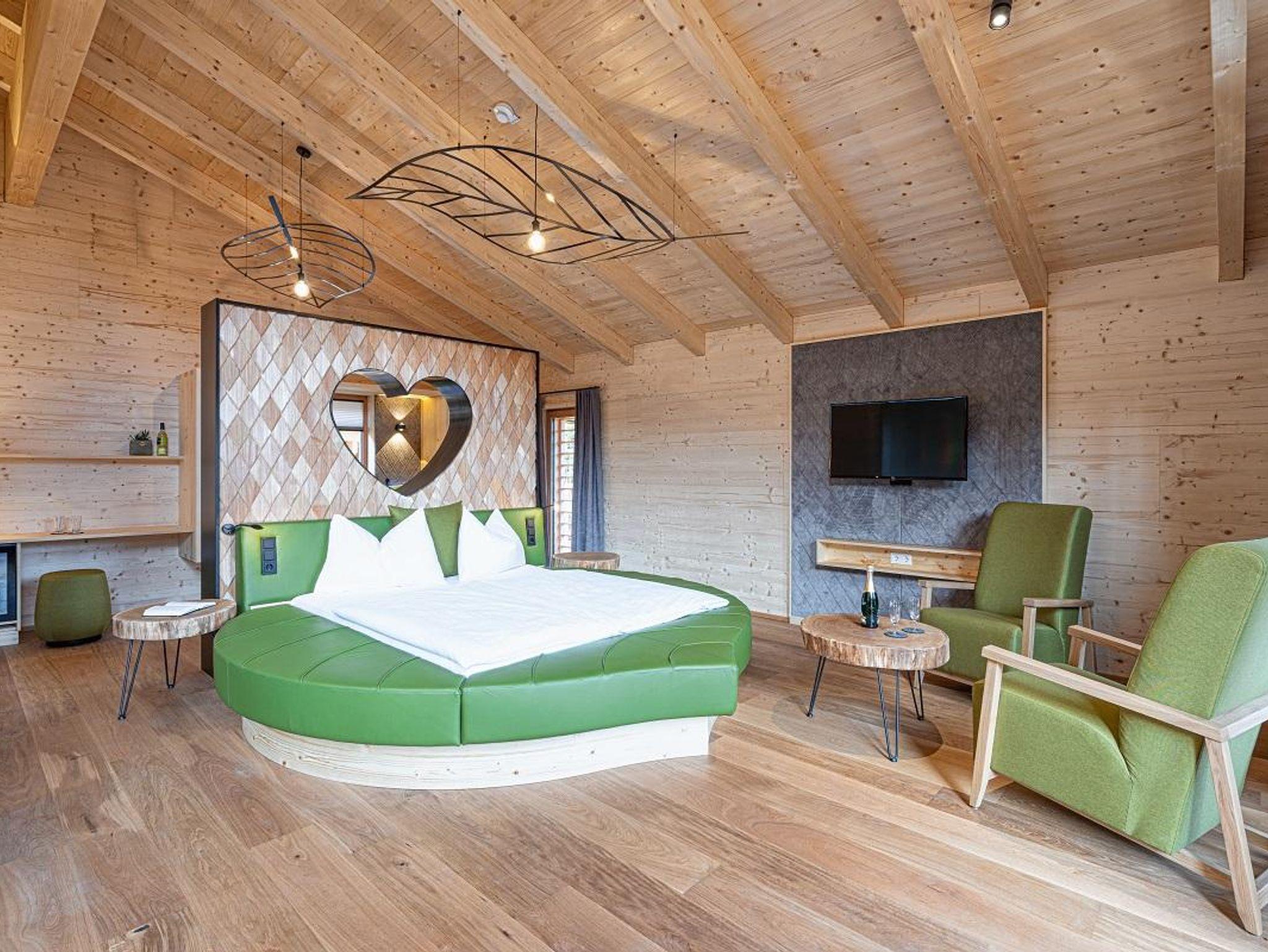 Die großzügige Wohnfläche und das einzigartige Design machen unser Baumhotel Wald-Romantik mit Spa zu einer Wohlfühloase. Auf ca. 64m² genießen Sie die Zeit zu zweit und erleben einen unvergesslichen Aufenthalt. Besonderen Flair verleihen das Doppelbett in Blattform und die freistehende Holzbadewanne, sowie die Regendusche.