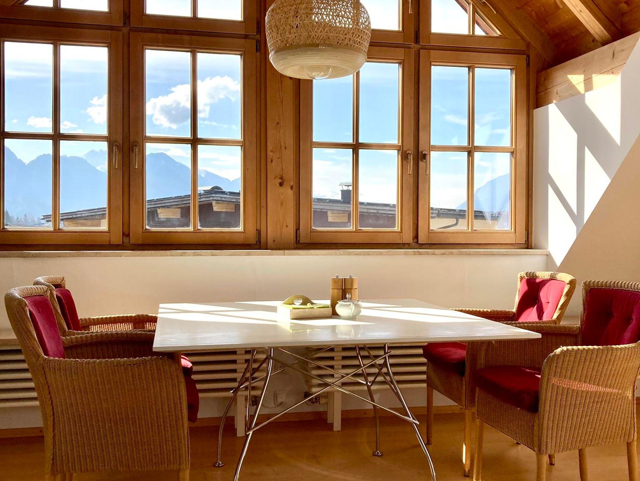Mit viel Liebe zum Detail haben wir das Apartment eingerichtet, damit Sie Ihren Urlaub genießen können. Sie werden sich fühlen wie auf Wolke 7. Die Räumlichkeiten sind hell, luftig und mit vielen Naturmaterialien ausgestattet. Dachfenster geben den Blick in alle Himmelsrichtungen und die umliegende Bergwelt frei. Im Wohnbereich ist eine große Fensterfront mit Blick Richtung Westen.