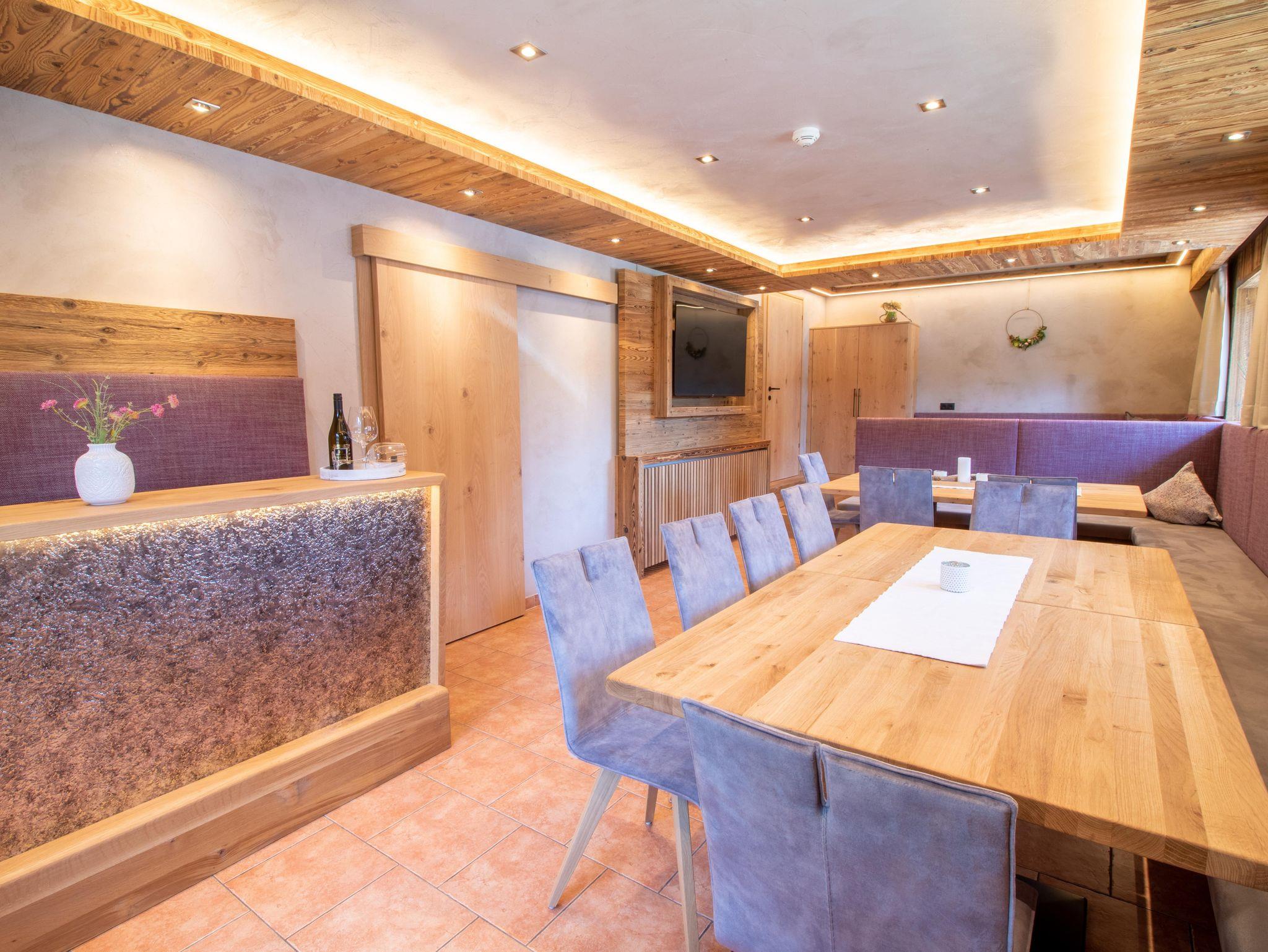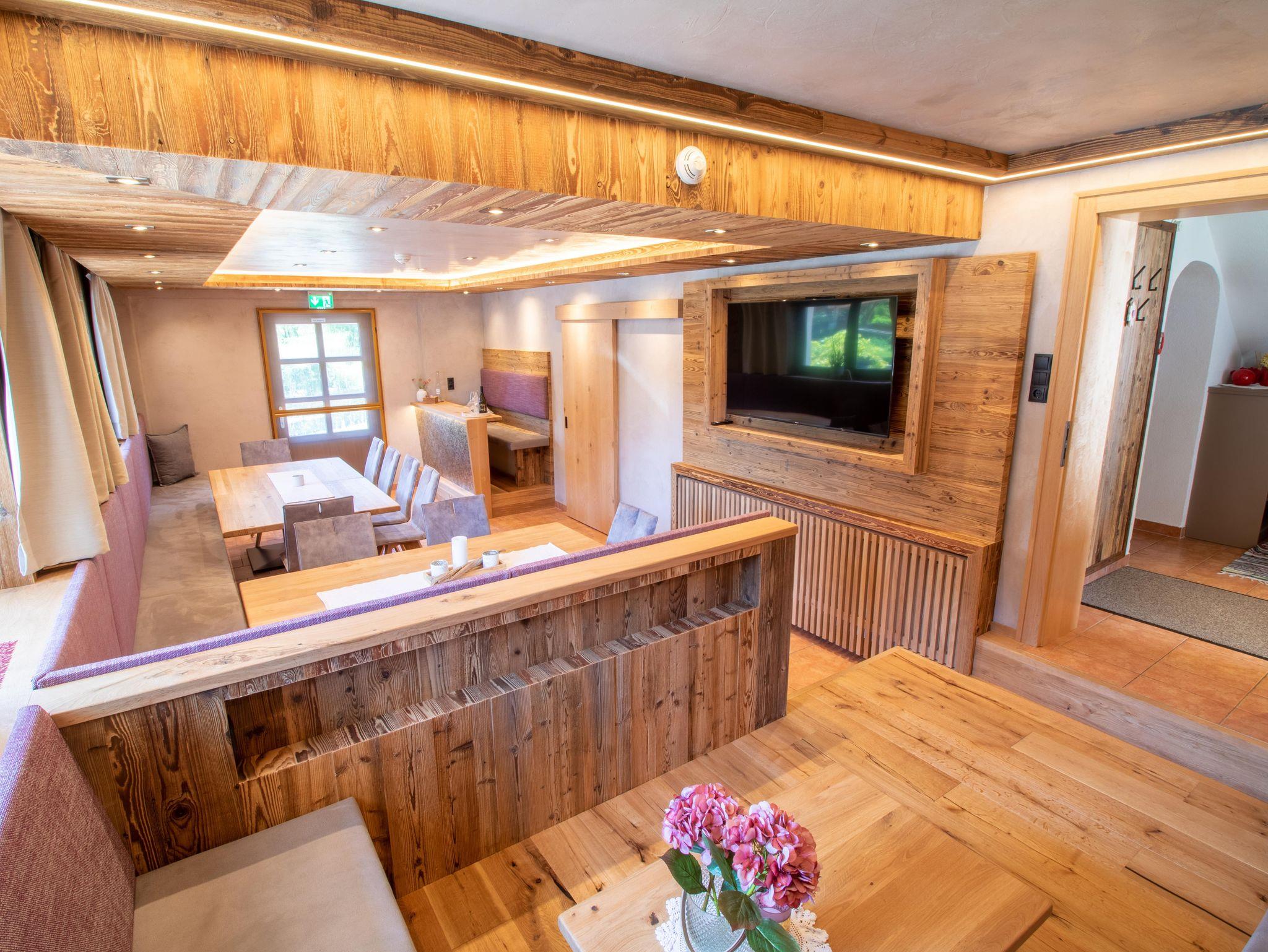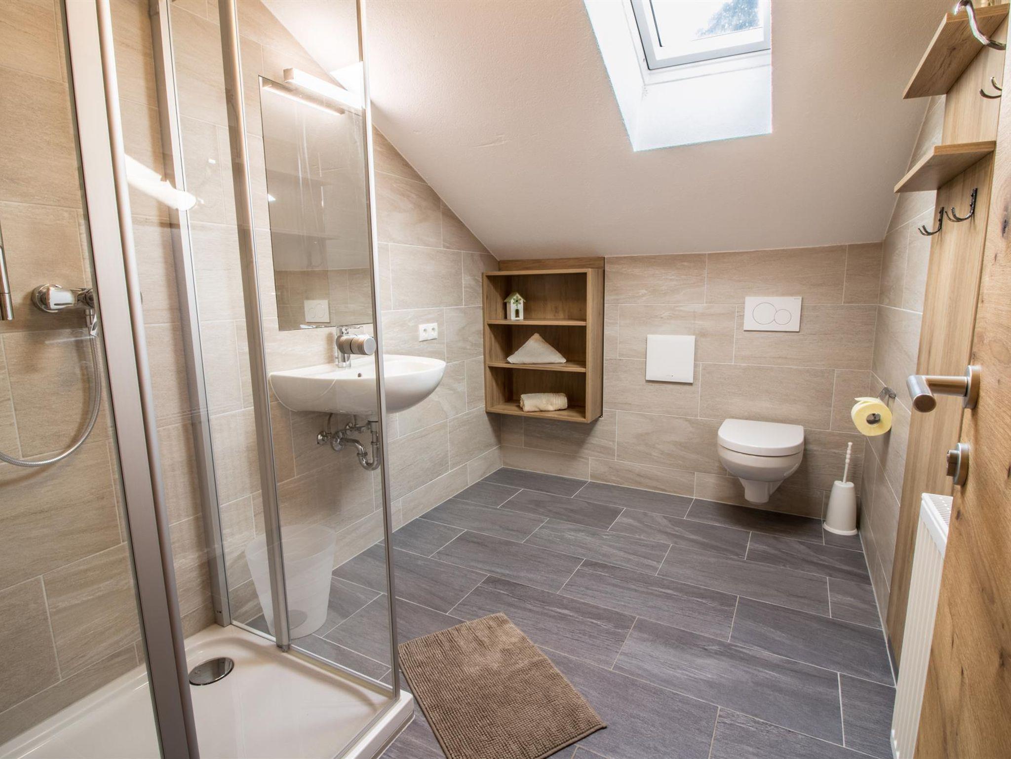Ferienhaus für maximal 18 Personen, 6 Schlafzimmer, 3 Etagen, ca. 220m²; Vom Eingangsbereich geht es über zwei Stufen in den Wohnraum mit wunderschönen Eckbänken, Stühlen und Zugang zur Terrasse. Ebenfalls vom Wohnraum erreichbar ist die gut ausgestattete Küche (Gastroherd mit 4 Platten und Backofen, Mikrowelle, Geschirrspüler, Kühlschrank, Gefrierschrank, 2 Kaffeemaschinen, Wasserkocher, Eierkocher und Toaster) gehören zur Einrichtung dazu. Bei so einem großen Ferienhaus sind natürlich Insgesamt drei separate WC´s, auf jeder Etage eines vorhanden. Im Winter wird unser Schieraum mit Schuhtrockner von unseren Gästen sehr gut angenommen.