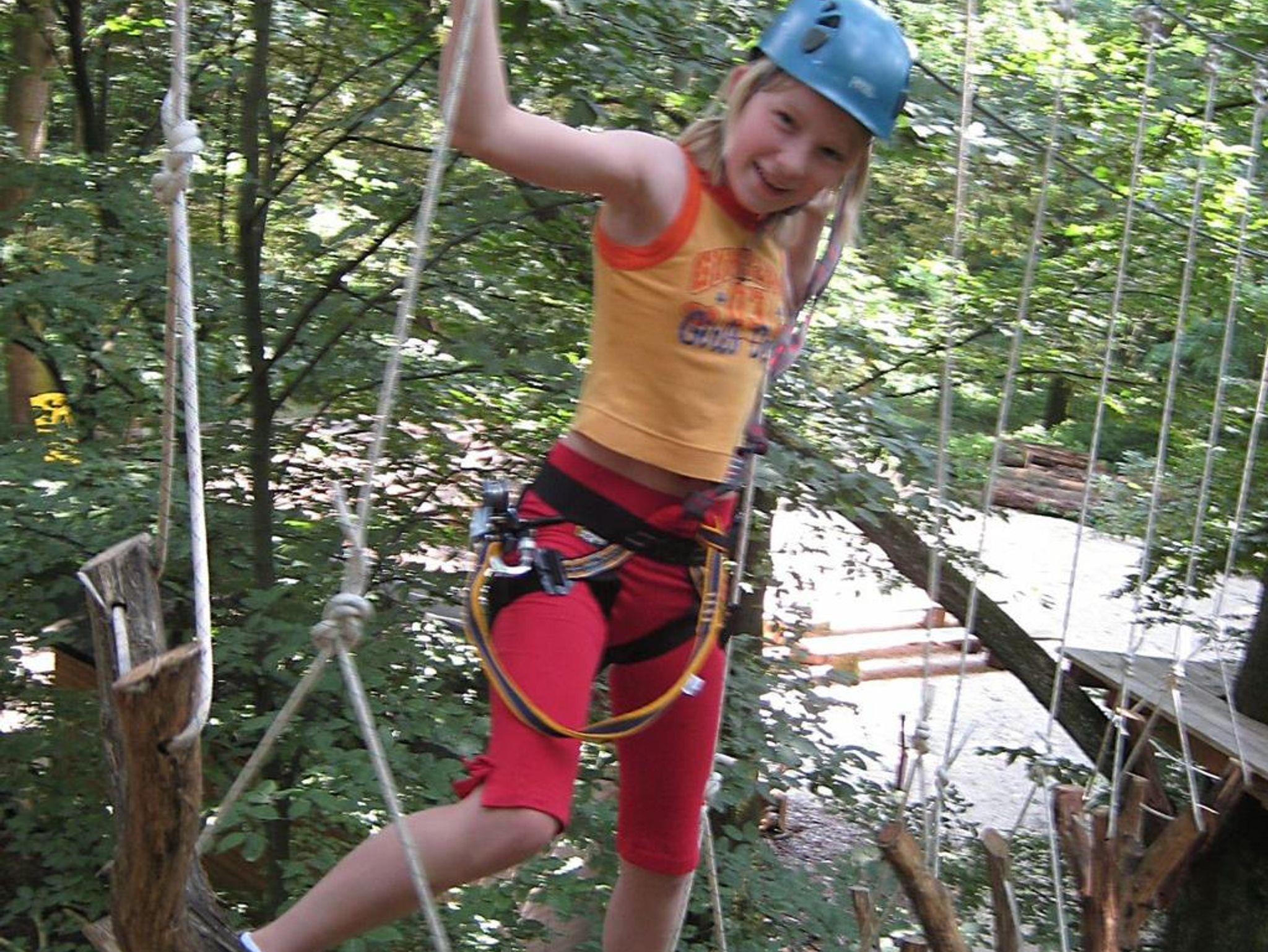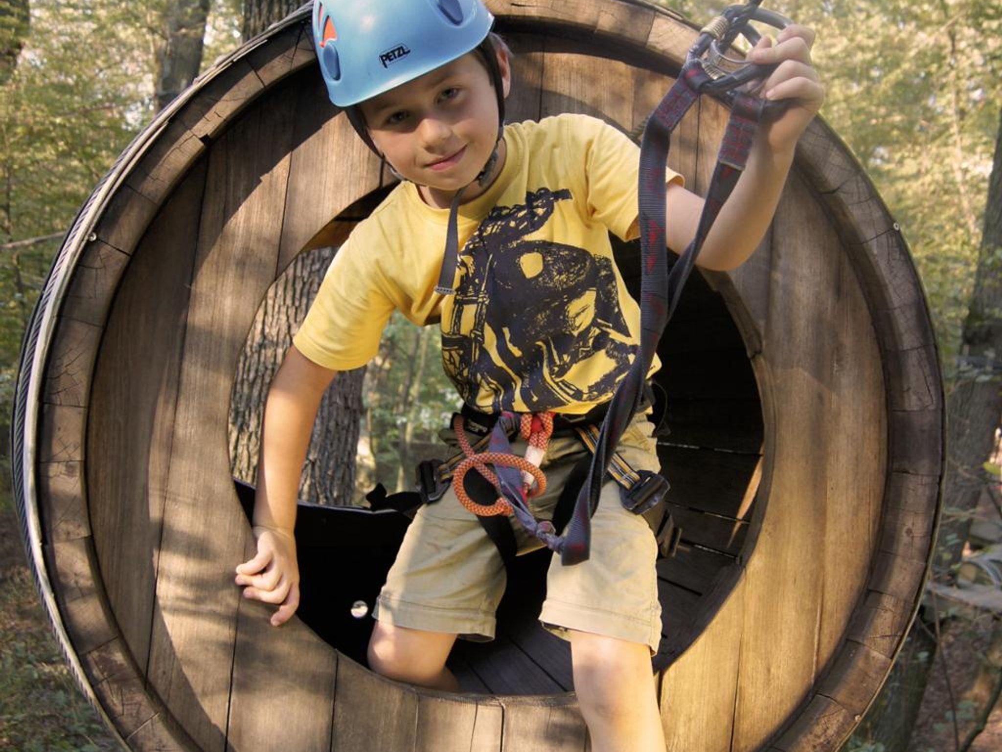 Tagsüber warten sieben Parcours im Kletterwald auf Abenteurer: Ob mit dem Fahrrad in 5 Metern Höhe von Baum zu Baum fahren oder mit einem Bottich durch die Luft sausen – hier kommt jeder auf seine Kosten. Für kleine Gäste gibt es einen Kletterspielplatz.