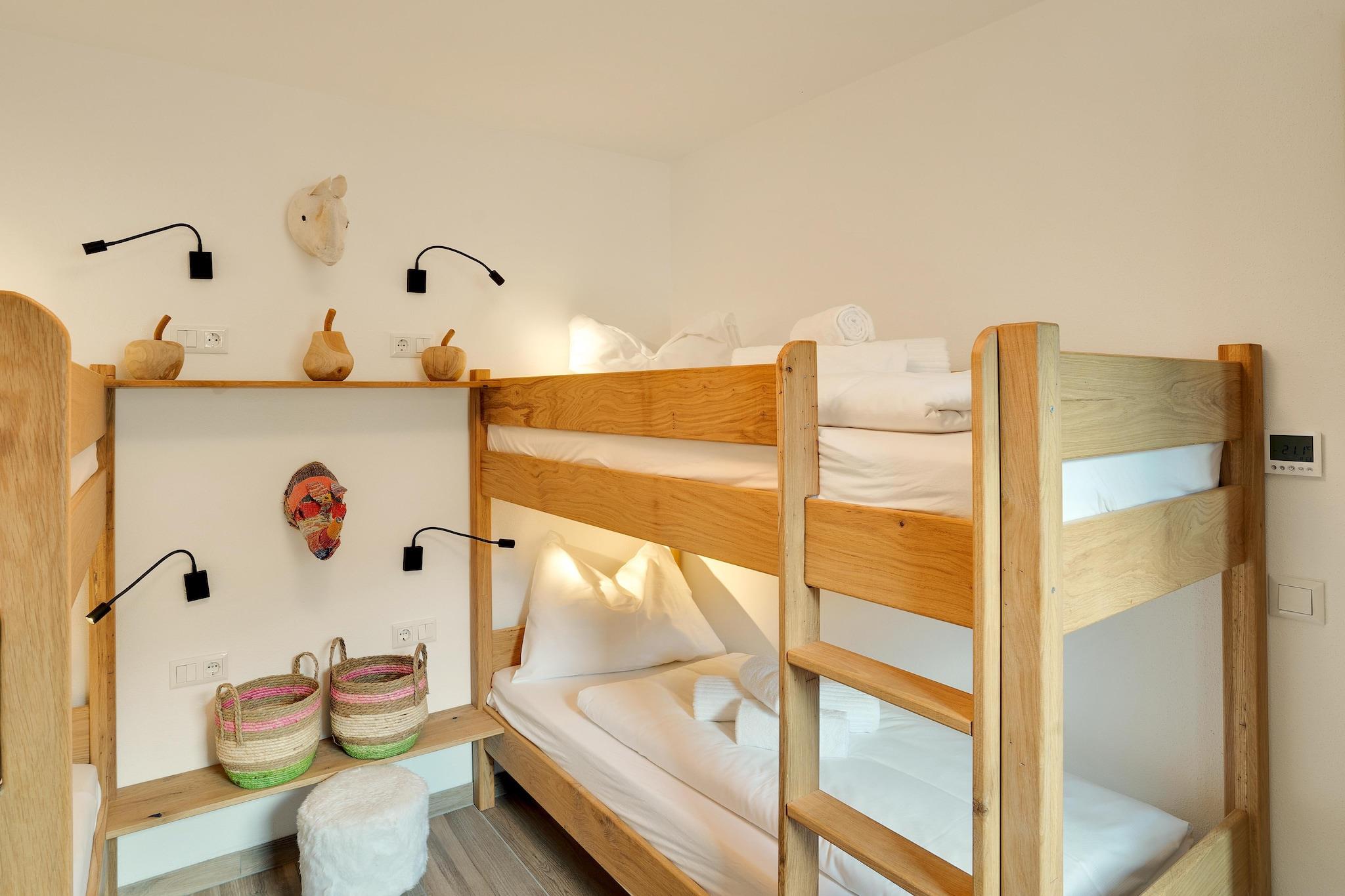 Stueetage: (soveværelse(dobbeltseng, Fjernsyn, balkon eller terrasse), soveværelse(dobbeltseng, Fjernsyn, balkon eller terrasse), soveværelse(2x køjeseng, Fjernsyn), badeværelse(bruser, håndvask, toilet), badeværelse(bruser, håndvask, toilet)) På 1. etage: (Stue(Fjernsyn, sofahjørne, balkon), åbent køkken(spisebord, komfur, ovn, combi-mikroovn, opvaskemaskine , køle-fryseskab), soveværelse(dobbeltseng, Fjernsyn), badeværelse(bruser, håndvask, toilet)) Kælder: (loungerum(bruser, sauna, liggestole), skiopbevaring(tørretumbler, vaskemaskine)) rejseseng, have, parkering, barnestol