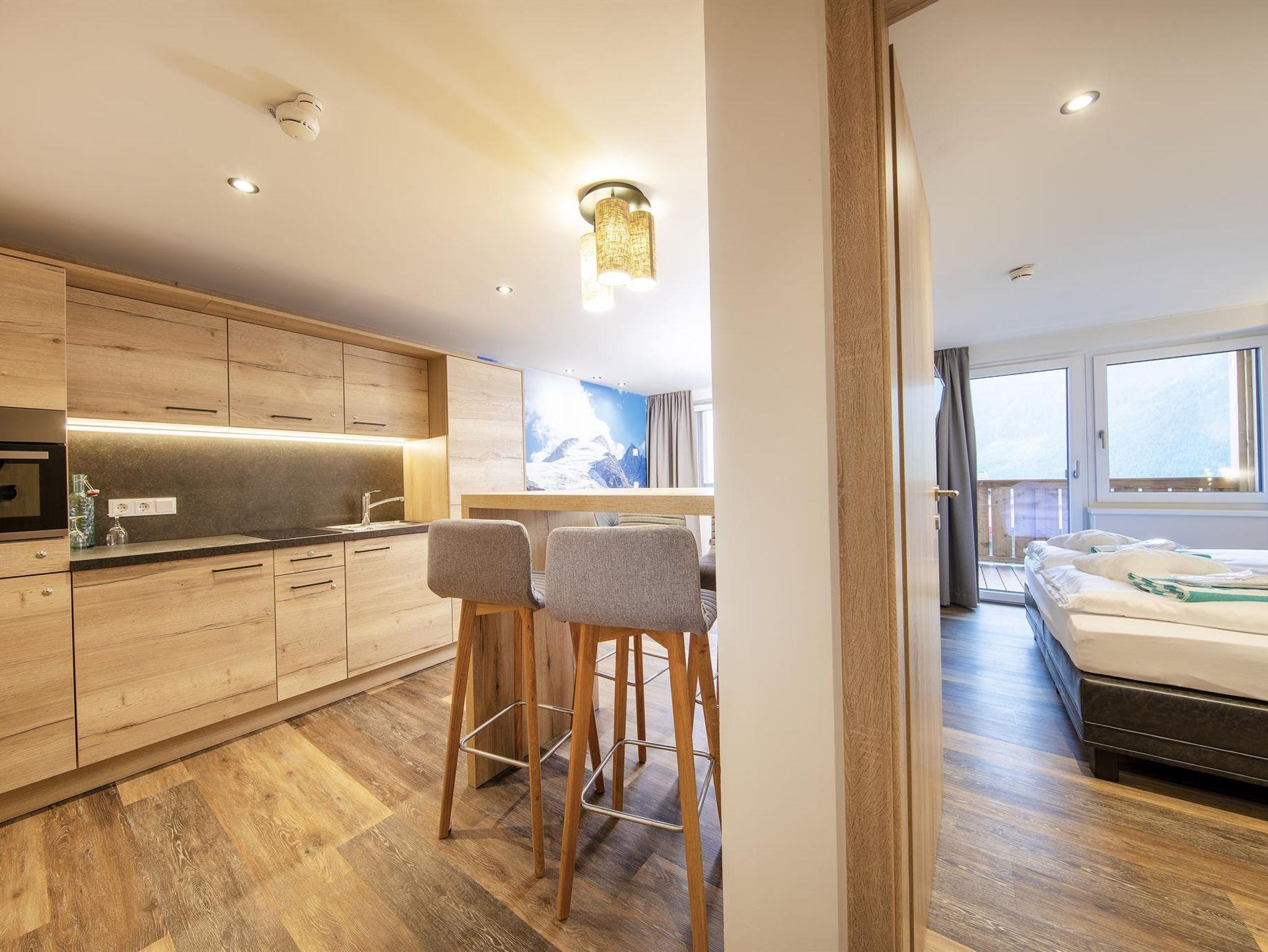 Die im Frühjahr 2019 komplett neu renovierten Zimmer (für 1-4 Personen) im alpin-modernen Design wurden mit natürlichen Materialien ausgestattet. Die allergikergerechte Ausstattung sorgt für Wohnkomfort mit höchsten Ansprüchen. Dieses Zimmer verfügt über ein getrenntes Schlafzimmer, einem Wohnraum mit einer Ausziehcouch und getrenntem WC und Badezimmer. Vom eigenen Balkon aus genießen Sie den Panoramablick auf die Krimmler Berge.