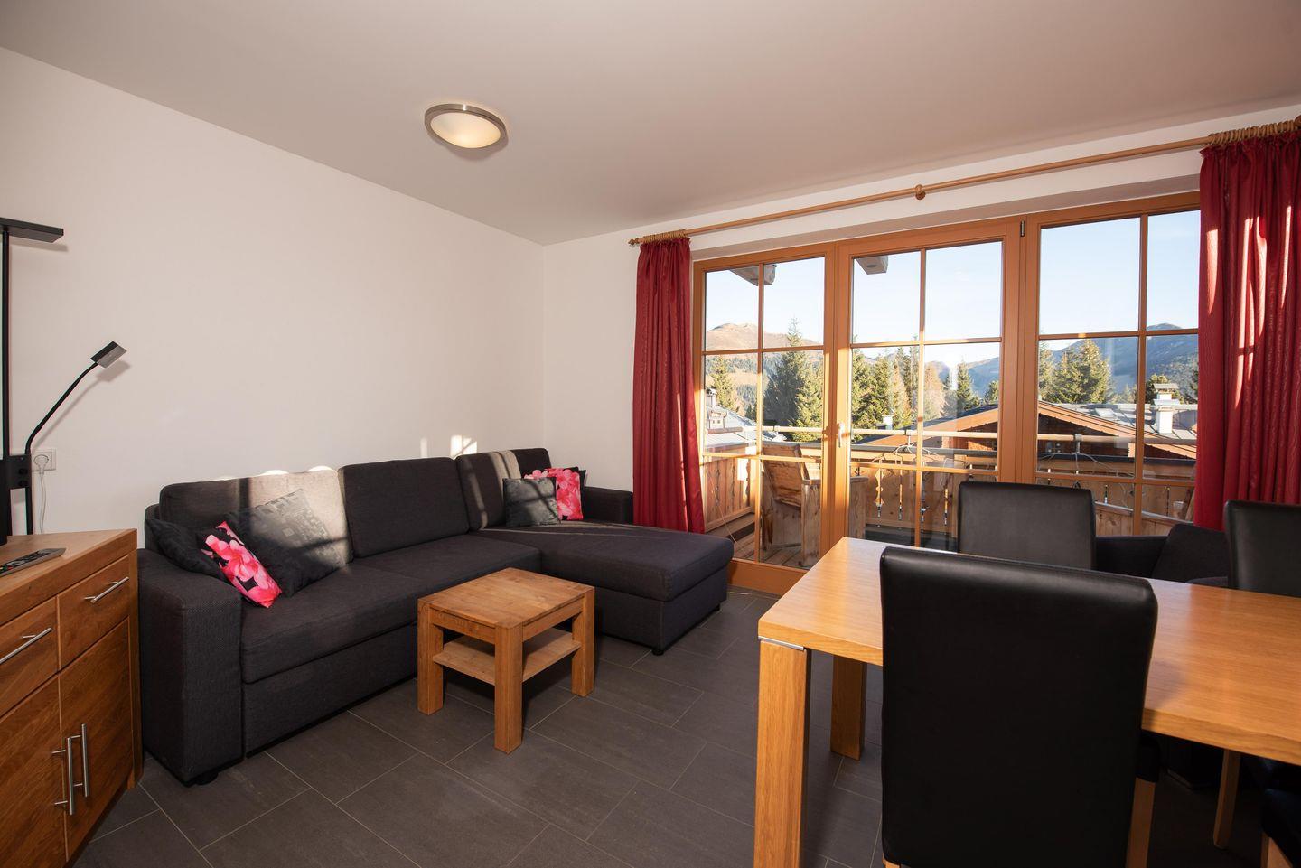 Die Ferienunterkunft Duxeranger E Top 3 bietet auf 45 m² modernen Komfort mit zwei Schlafzimmern und Platz für bis zu sechs Personen. Zu den Annehmlichkeiten zählen ein offener Wohn- und Essbereich, voll ausgestattete Küche, Balkon mit Bergblick, gemeinschaftlich nutzbare Waschmaschine und Trockner, Fußbodenheizung, kostenfreier Privatparkplatz sowie WLAN.