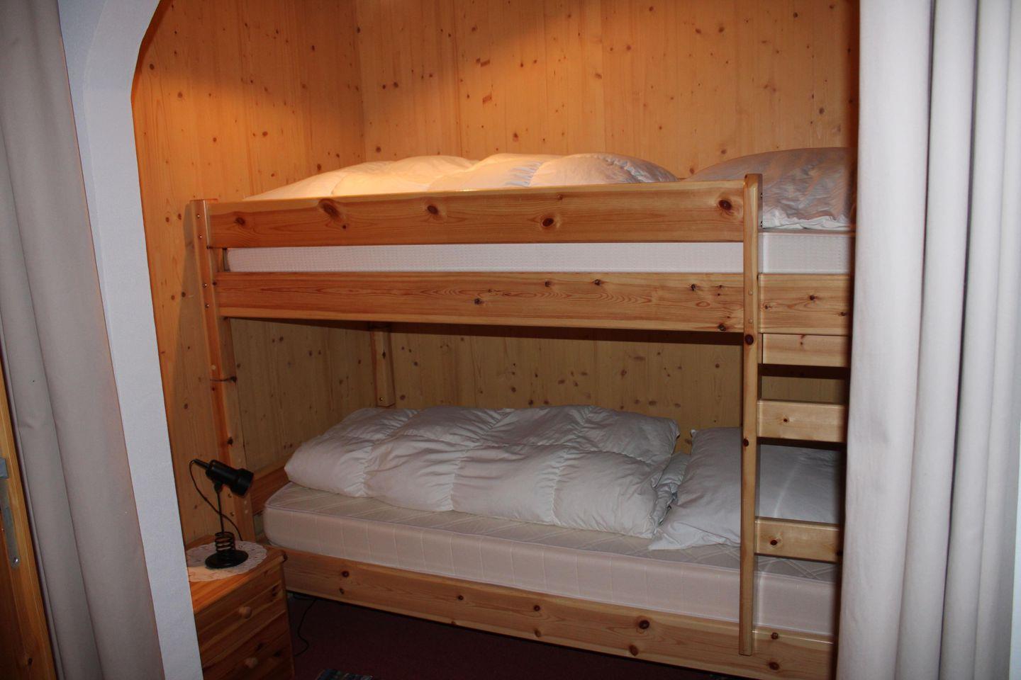 Das Stockbett befindet sich in einer Schlafnische abtrennbar mit einem Vorhang (Alkoven)