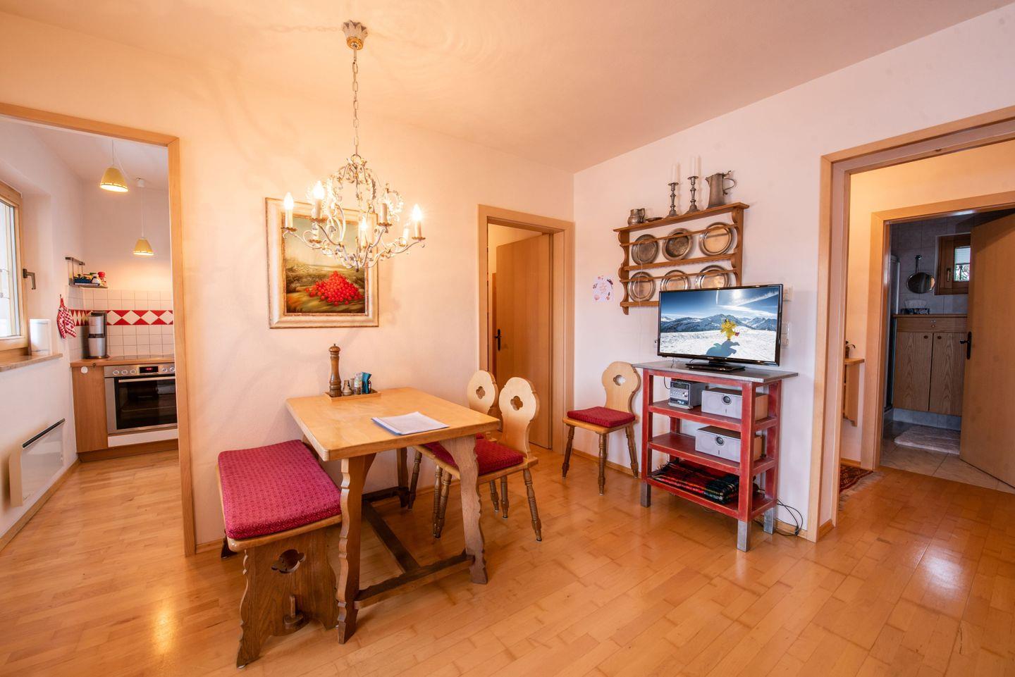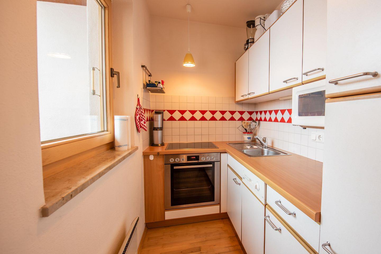 Die helle Wohn-Küche mit vielen Fenstern schafft einen schönen Rundum-Blick und ergibt zusammen mit dem Balkon zum Sonne tanken auch außerhalb der Skisaison eine attraktive Unterkunft für Urlaub mit der Familie oder Freunden.