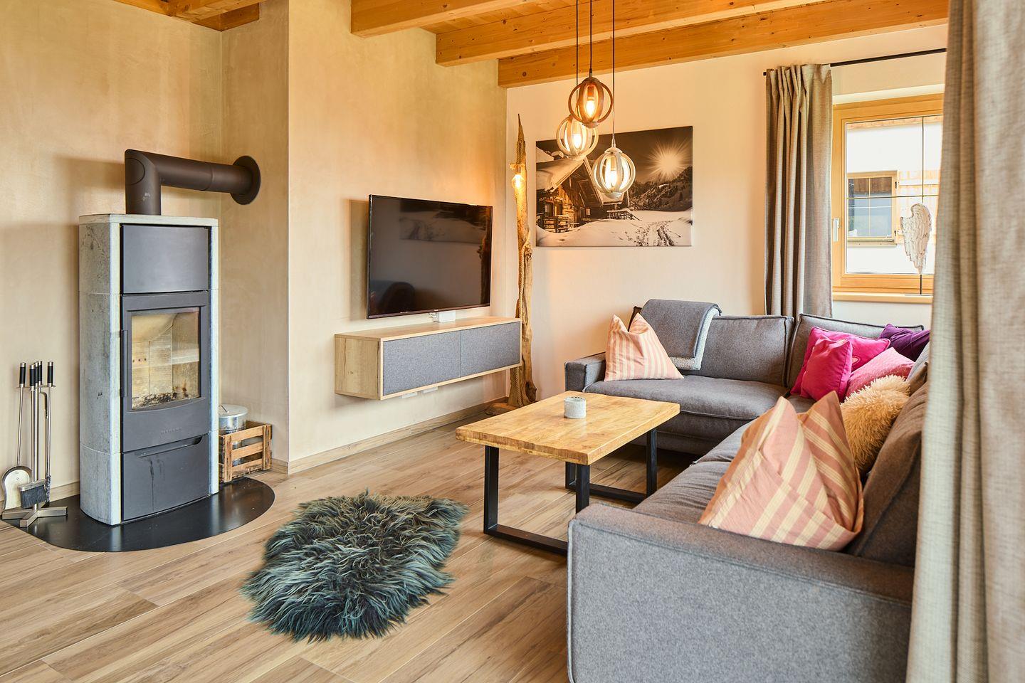 Der Kamin im Wohnraum schafft eine gemütliche Atmosphäre und spendet in den kalten Wintermonaten jene Wärme, die nach einer langen Abfahrt den Tag gemütlich zum Abschluss bringt.