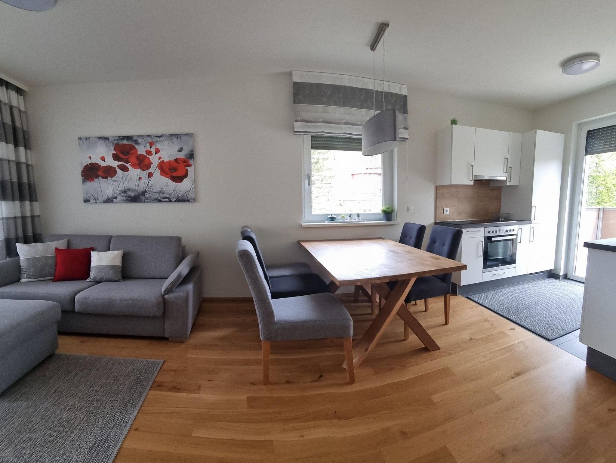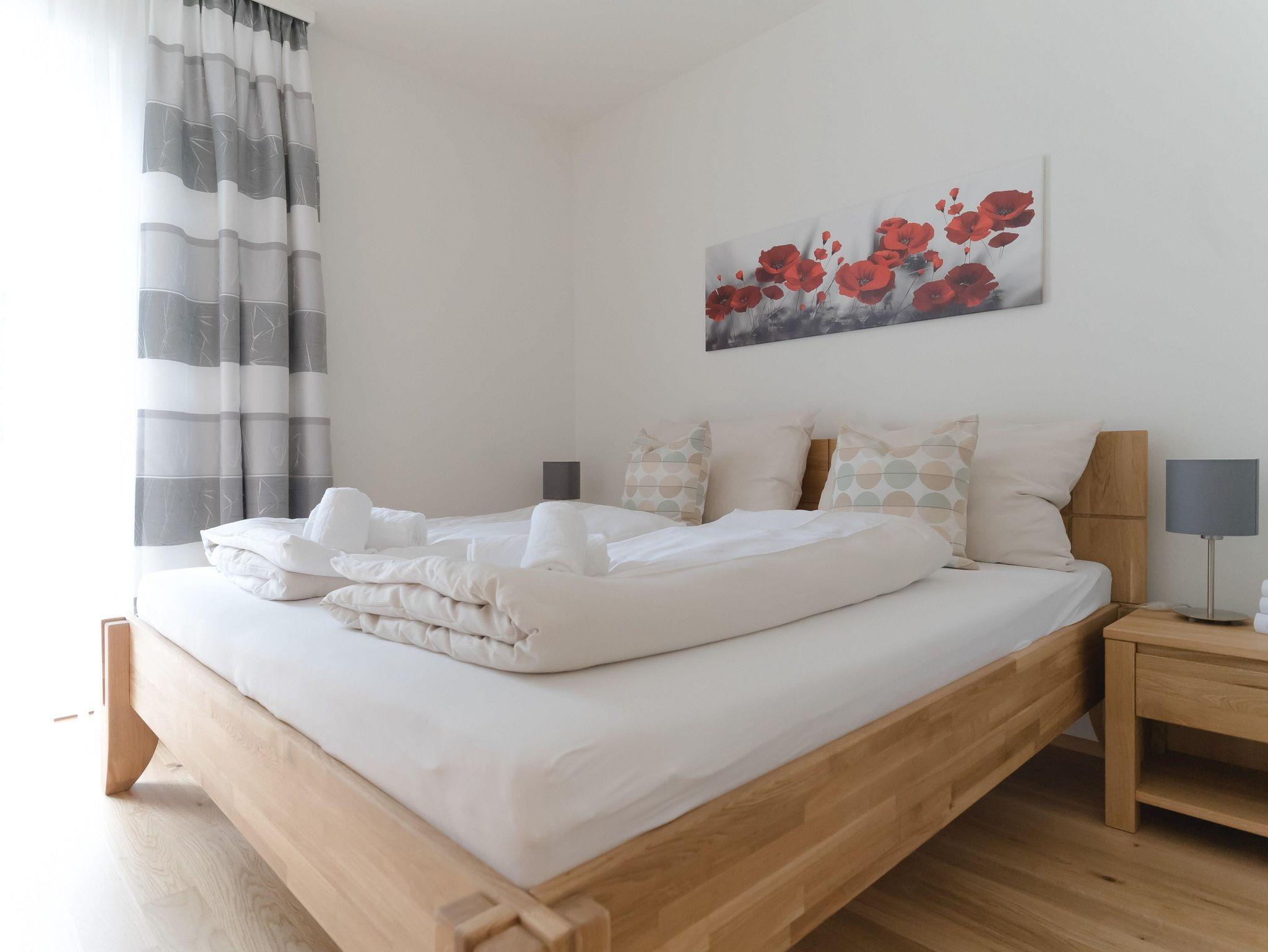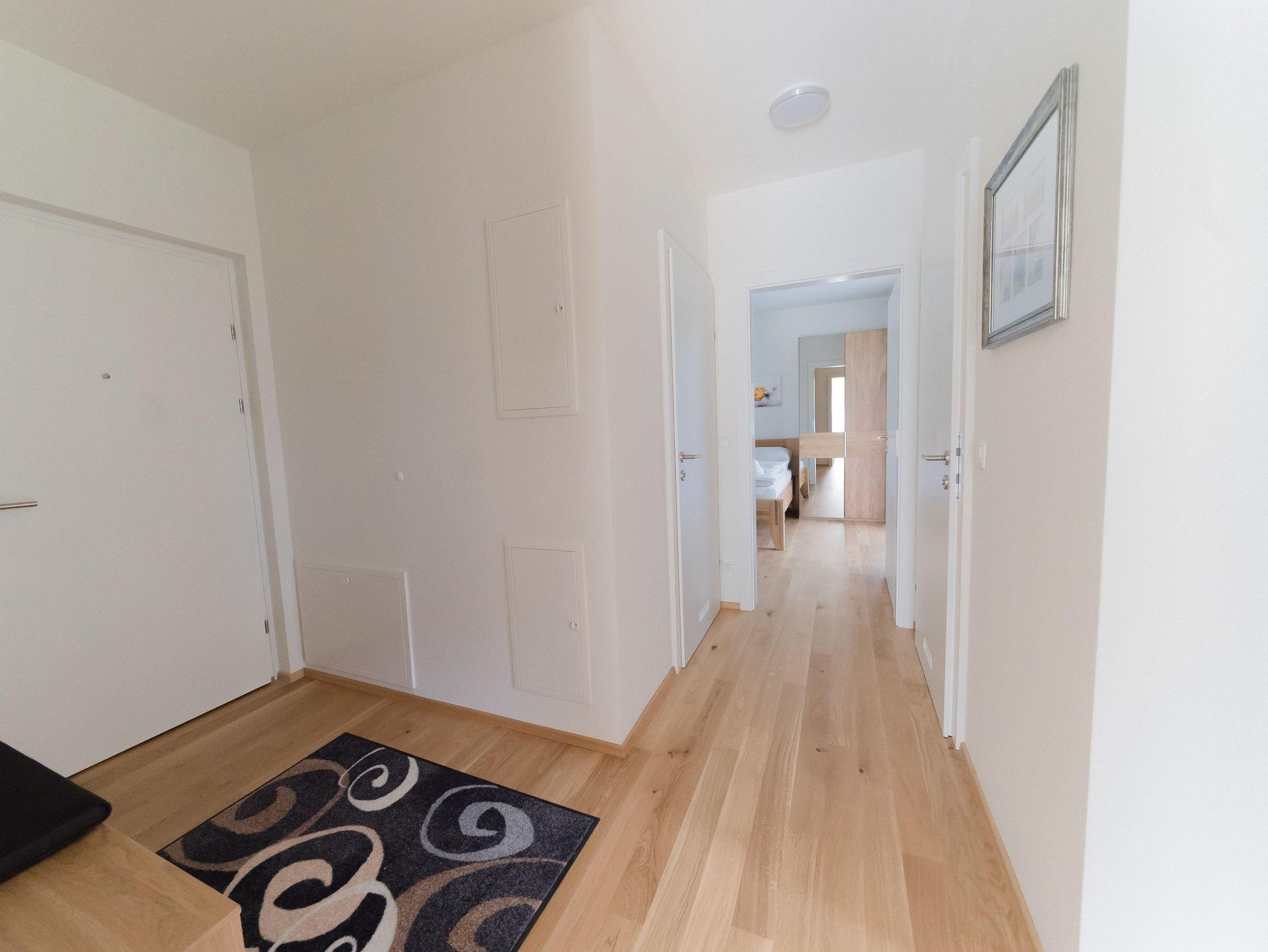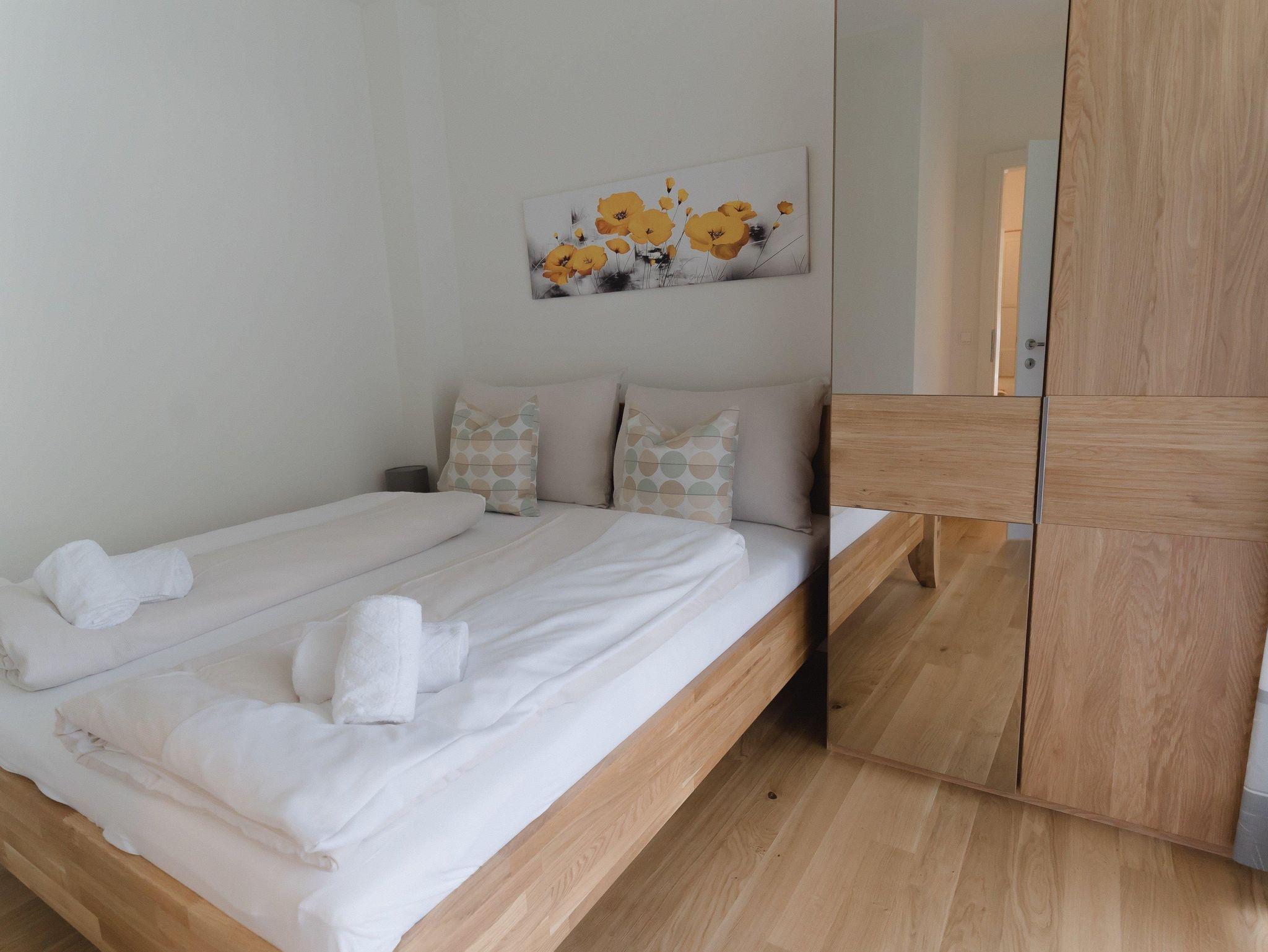 Das Apartment befindet sich im 1. Obergeschoss und ist mit dem Aufzug oder über das Stiegenhaus erreichbar. Die Wohnung bietet auf 70qm Wohnfläche genügend Platz und verfügt über 2 Schlafzimmer mit je einem Doppelbett und einer großzügigen Wohnküche mit Küchenzeile, Essbereich sowie einer gemütlichen Schlafcouch für 2 weitere Personen. Das Apartment eignet sich für bis zu 6 Personen und ist somit ideal für Familien oder Freunde. Des weiteren stehen Dir 2 Badezimmer zur Verfügung, die mit Dusche und WC bzw. einem separatem WC ausgestattet sind. Ein absolutes Highlight sind die 2 Balkone. Einer davon ist sogar überdacht - so kann man einen erlebnisreichen Tag gemütlich ausklingen lassen!