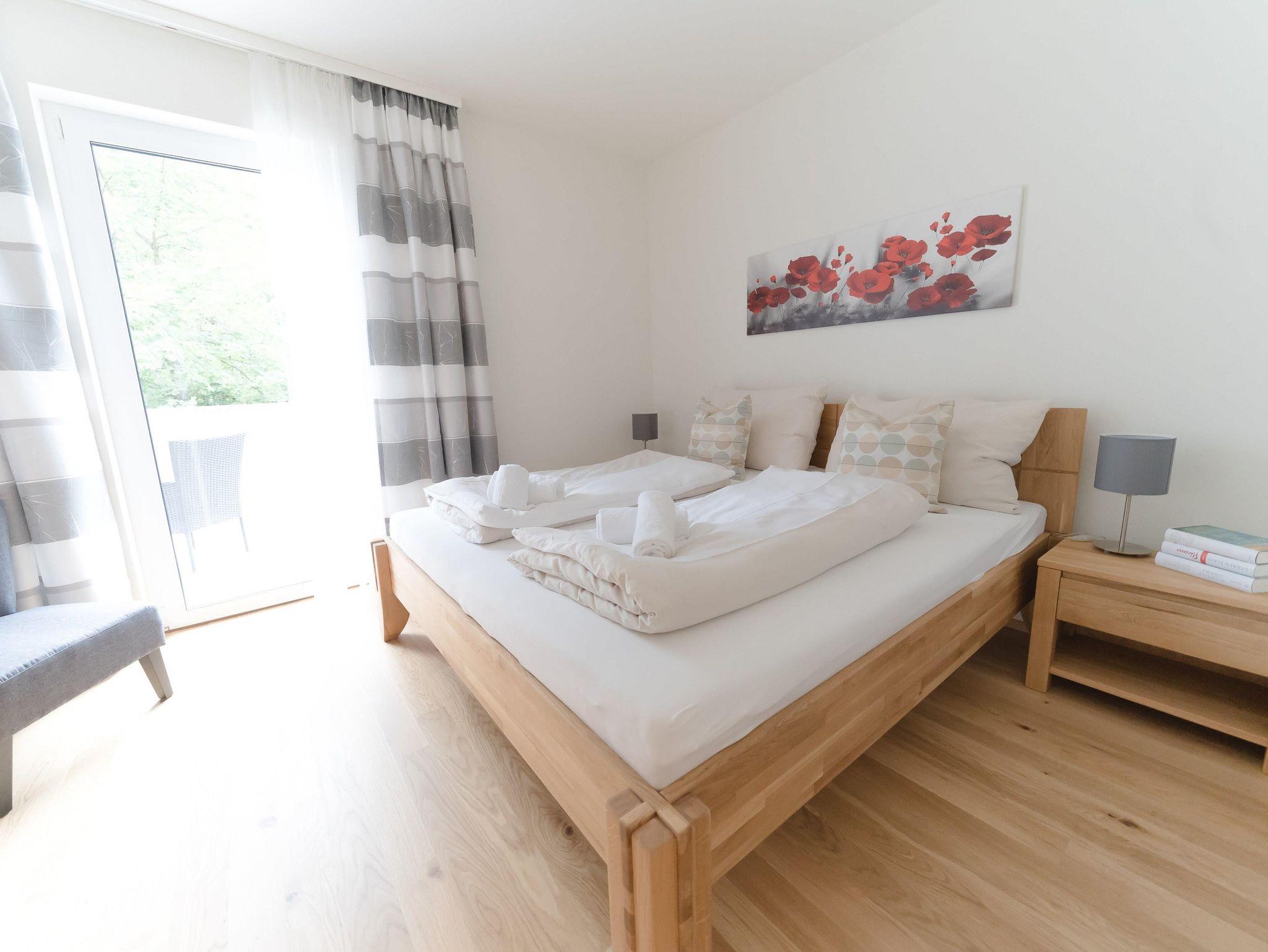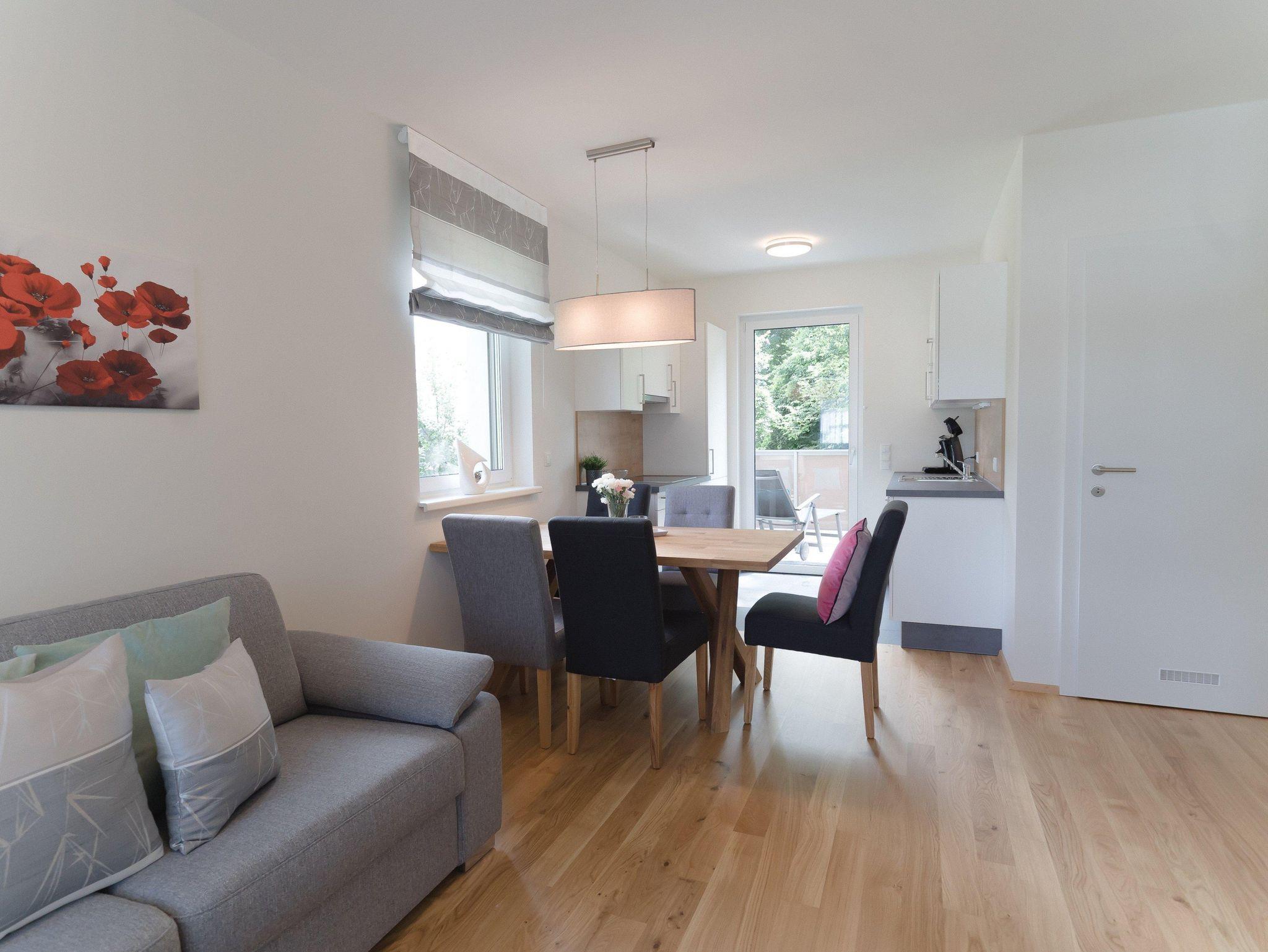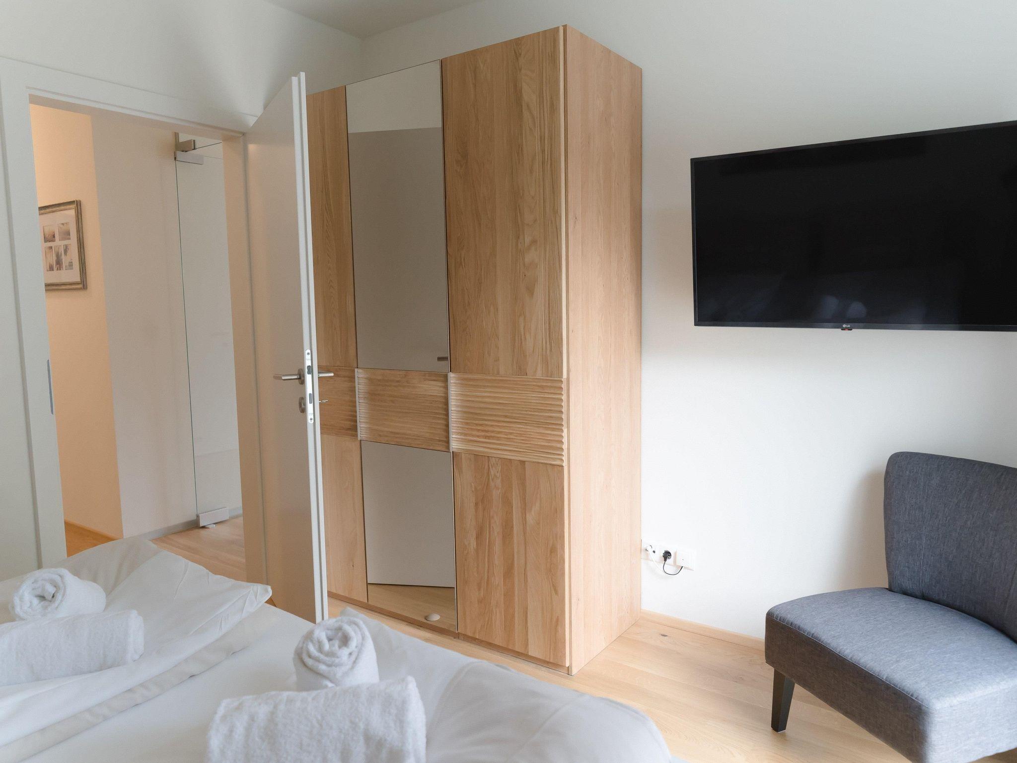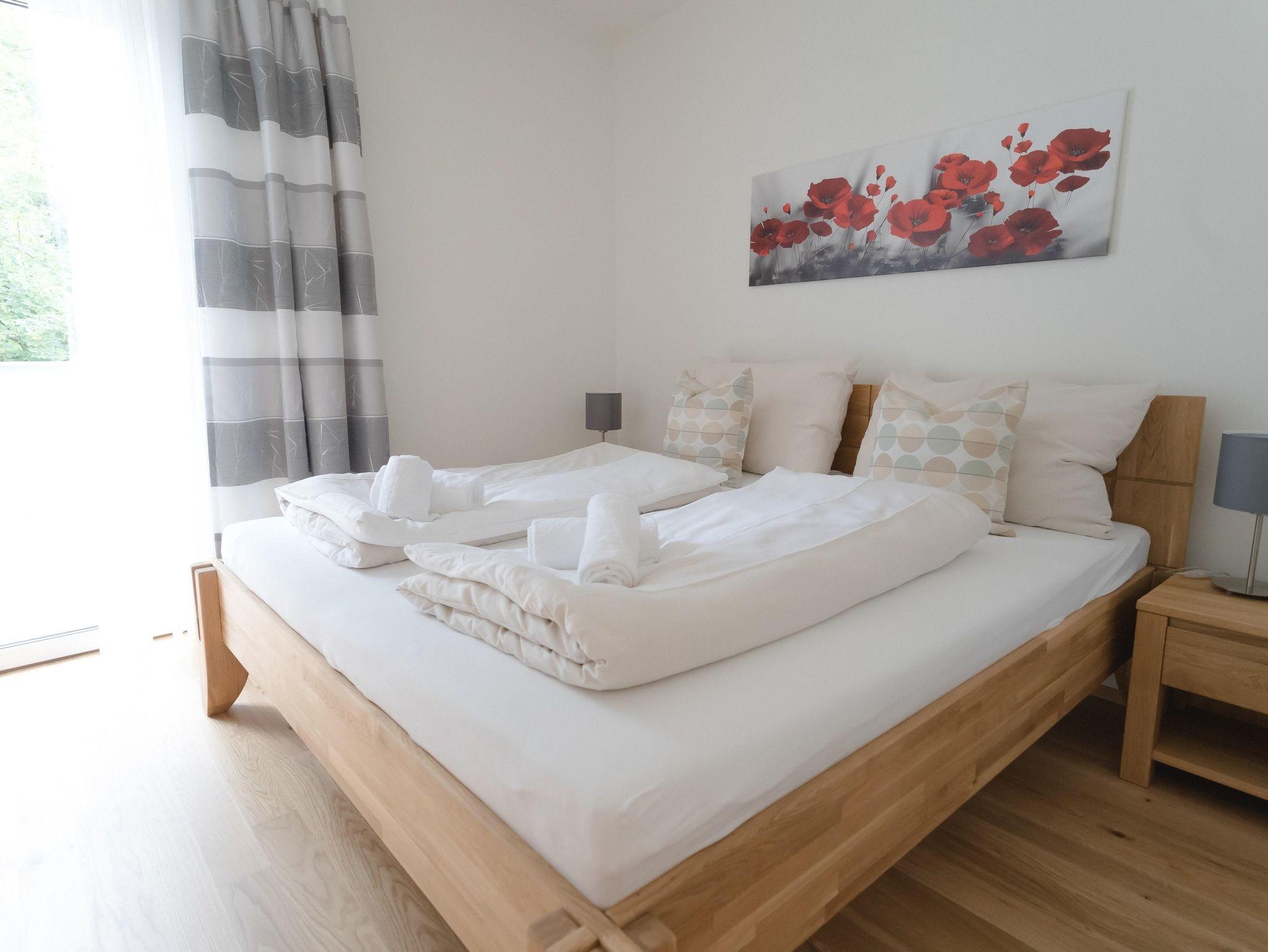 Das Apartment befindet sich im 1. Obergeschoss und ist mit dem Aufzug oder über das Stiegenhaus erreichbar. Die Wohnung bietet auf 70qm Wohnfläche genügend Platz und verfügt über 2 Schlafzimmer mit je einem Doppelbett und einer großzügigen Wohnküche mit Küchenzeile, Essbereich sowie einer gemütlichen Schlafcouch für 2 weitere Personen. Das Apartment eignet sich für bis zu 6 Personen und ist somit ideal für Familien oder Freunde. Des weiteren stehen Dir 2 Badezimmer zur Verfügung, die mit Dusche und WC bzw. einem separatem WC ausgestattet sind. Ein absolutes Highlight sind die 2 Balkone. Einer davon ist sogar überdacht - so kann man einen erlebnisreichen Tag gemütlich ausklingen lassen!