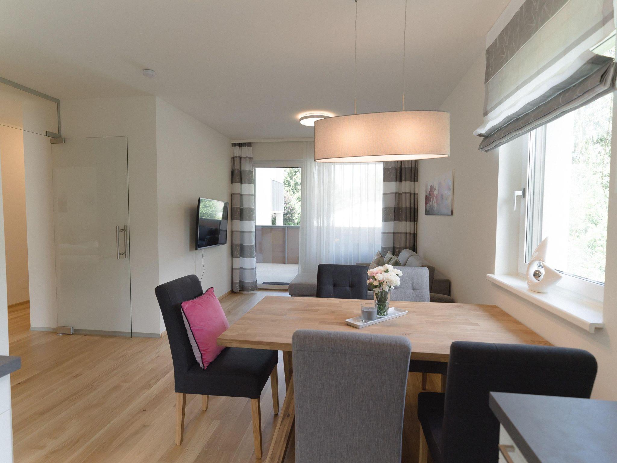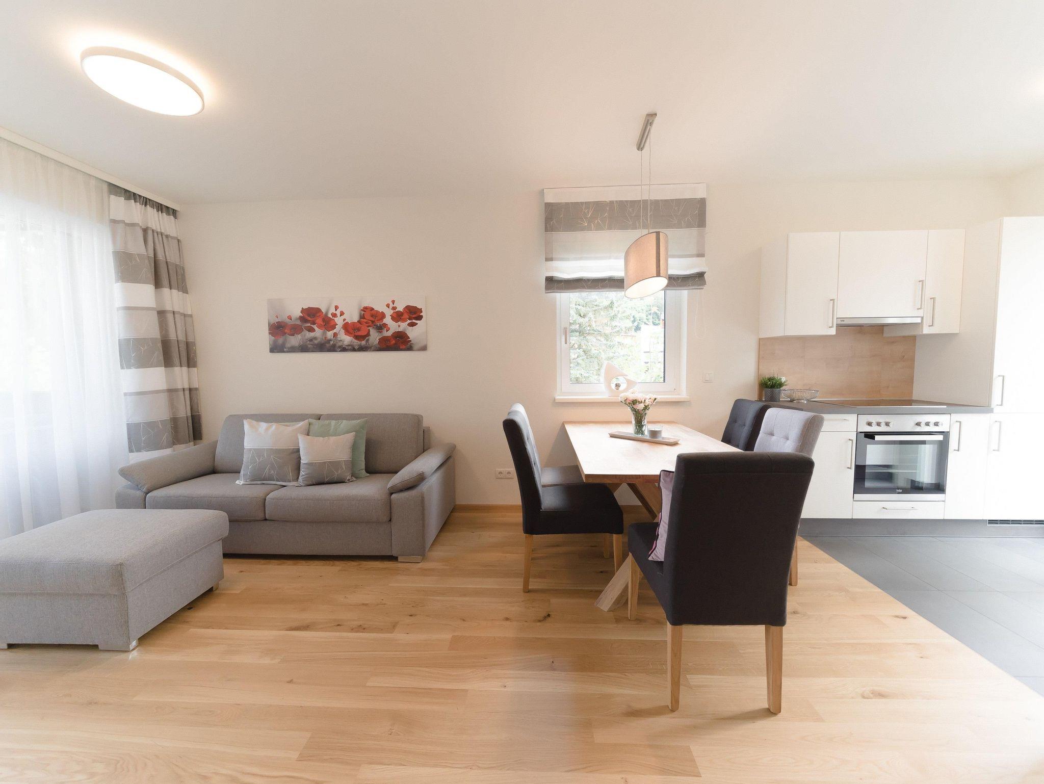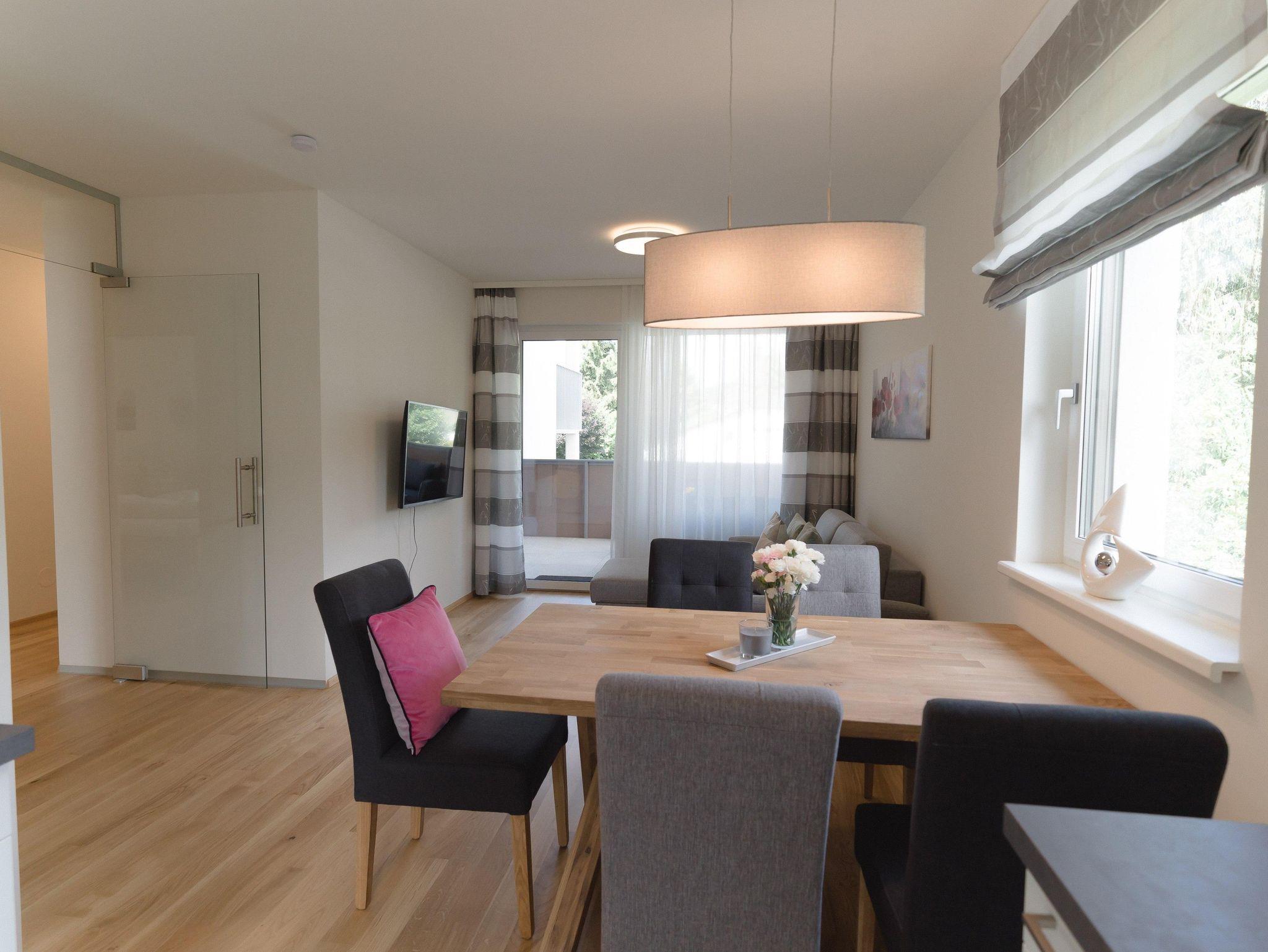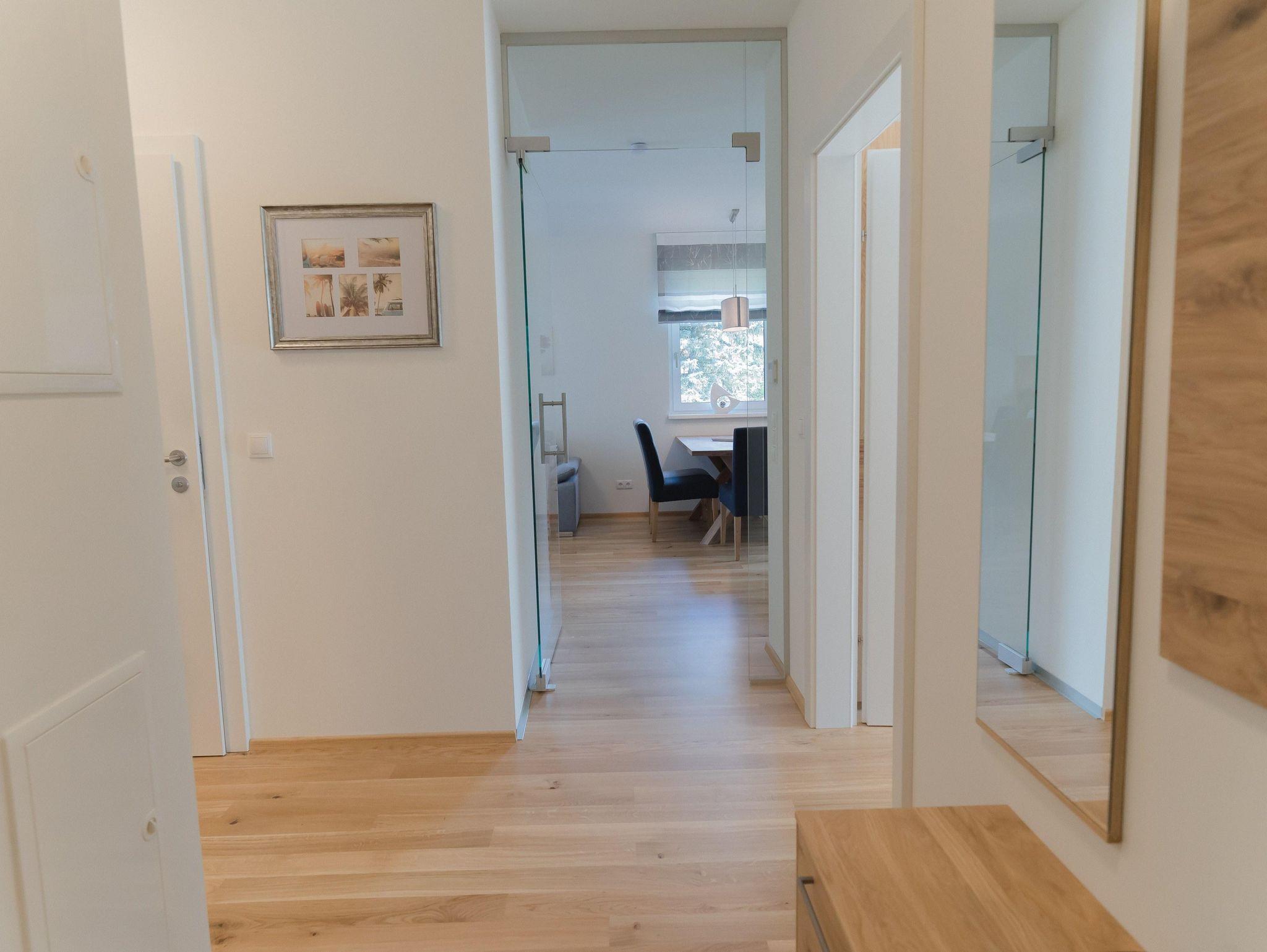 Das Apartment befindet sich im 1. Obergeschoss und ist mit dem Aufzug oder über das Stiegenhaus erreichbar. Die Wohnung bietet auf 70qm Wohnfläche genügend Platz und verfügt über 2 Schlafzimmer mit je einem Doppelbett und einer großzügigen Wohnküche mit Küchenzeile, Essbereich sowie einer gemütlichen Schlafcouch für 2 weitere Personen. Das Apartment eignet sich für bis zu 6 Personen und ist somit ideal für Familien oder Freunde. Des weiteren stehen Dir 2 Badezimmer zur Verfügung, die mit Dusche und WC bzw. einem separatem WC ausgestattet sind. Ein absolutes Highlight sind die 2 Balkone. Einer davon ist sogar überdacht - so kann man einen erlebnisreichen Tag gemütlich ausklingen lassen!