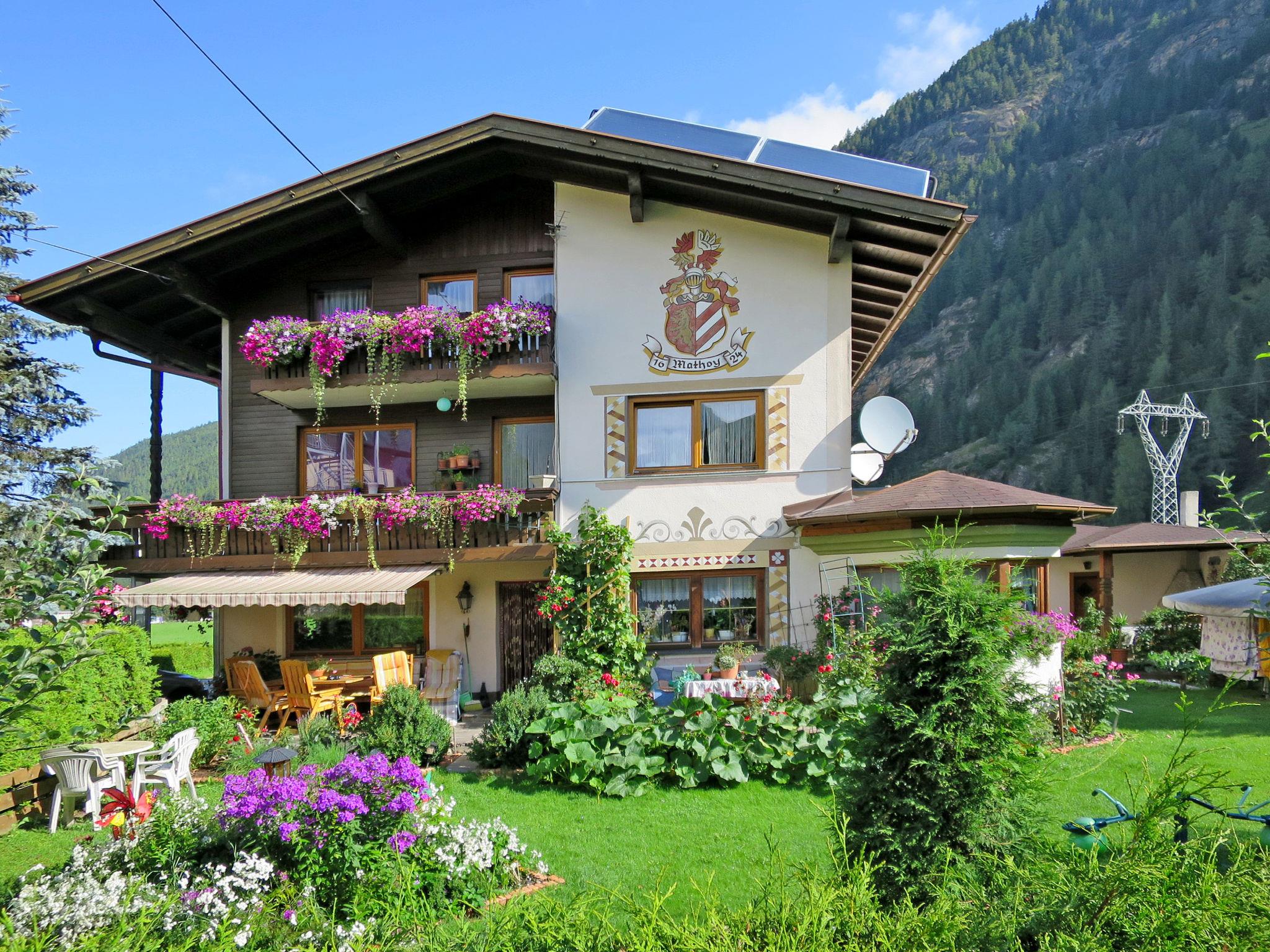 Au 3 km from Längenfeld: Large 2-family house "Mathoy". In the district of Au 3.5 km from the centre of Längenfeld, 17 km from the centre of Sölden. For shared use: beautiful garden with lawn and plants. Terrace, garden furniture, barbecue (slide, swing). In the house: storage room for skis, ski boot dryer. Bread roll service. Parking on the premises. Supermarket 3.5 km, restaurant, bakery 100 m, café 100 m, bus stop 200 m, thermal baths "Aqua Dome Längenfeld" 4 km. Gondola lift 17 km, cross country ski track 100 m. Well-known ski regions can easily be reached: Sölden 17 km, Ötz 14 km. Please note: the owner lives in the same residence.
