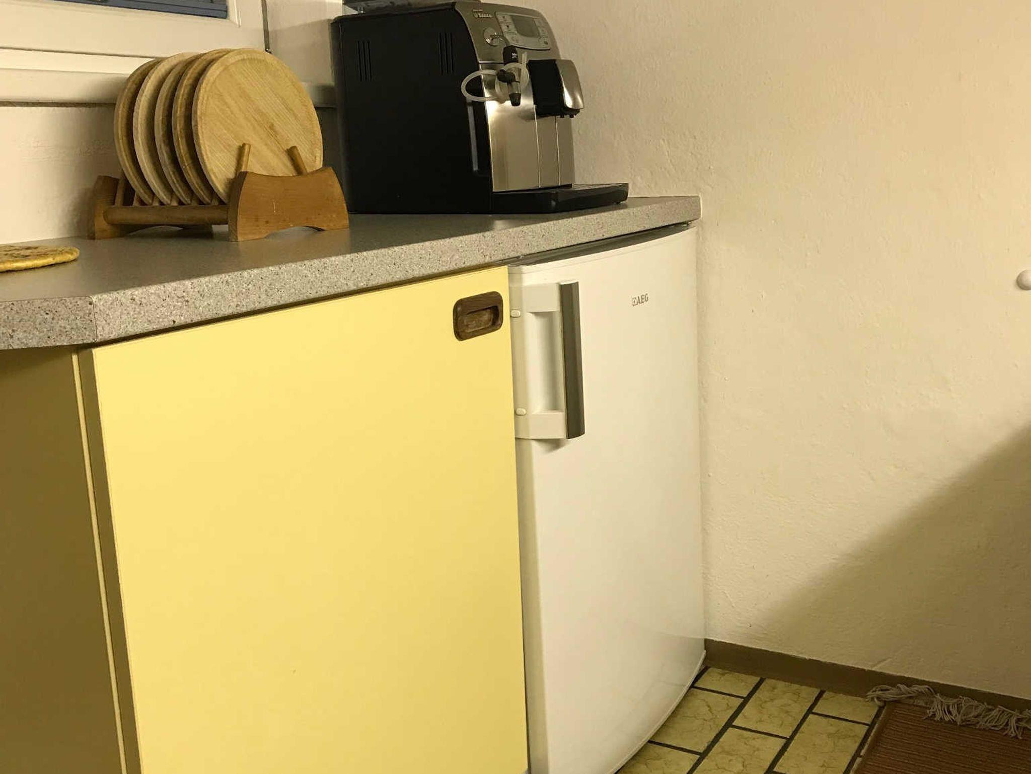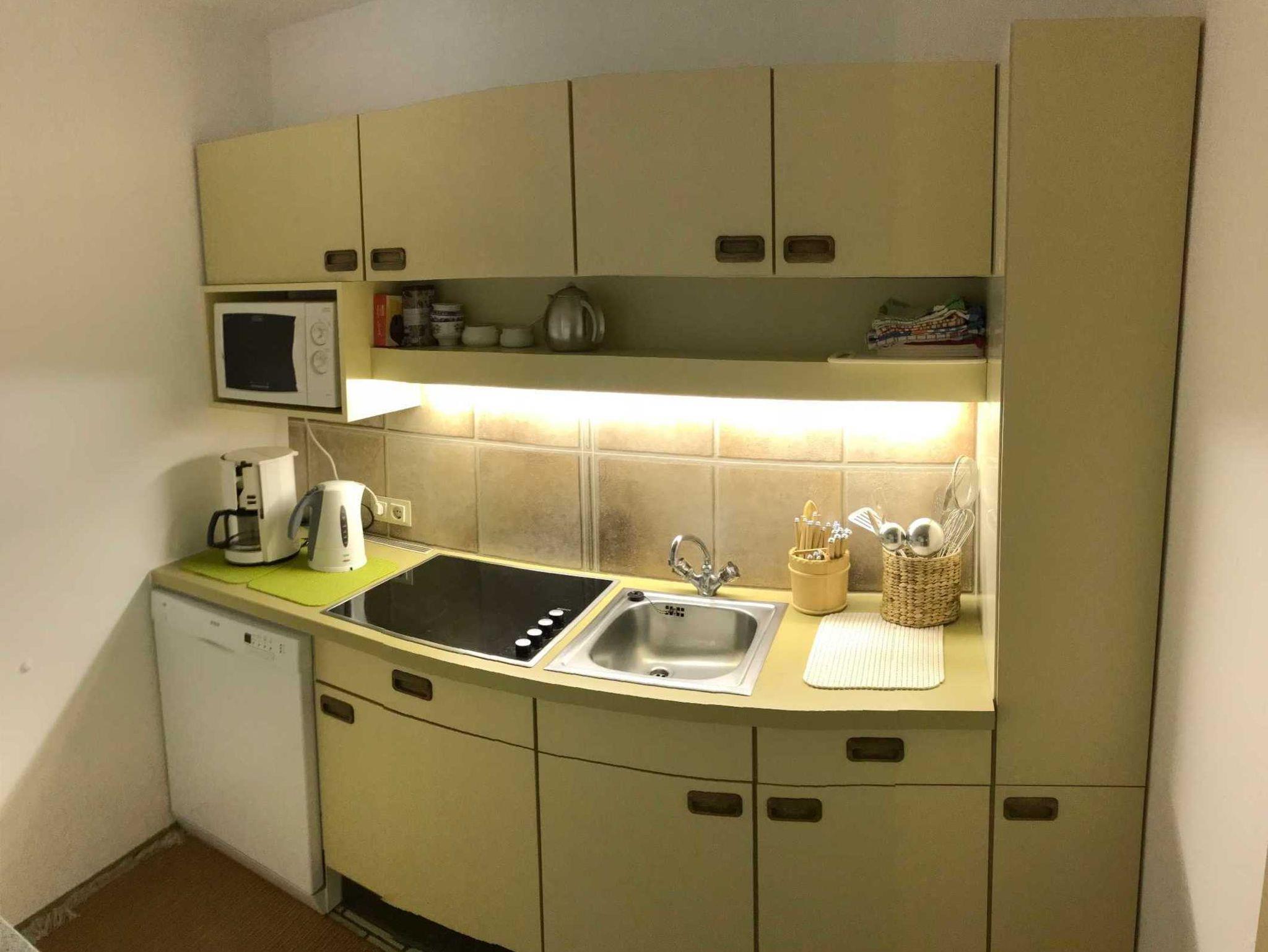 E-Herd, Mikrowelle, Kühlschrank mit Gefrierfach, Toaster, Kaffeeautomat, Kaffeemaschine und einem Teekocher. Koch - und Essgeschirr ist genügend vorhanden.
