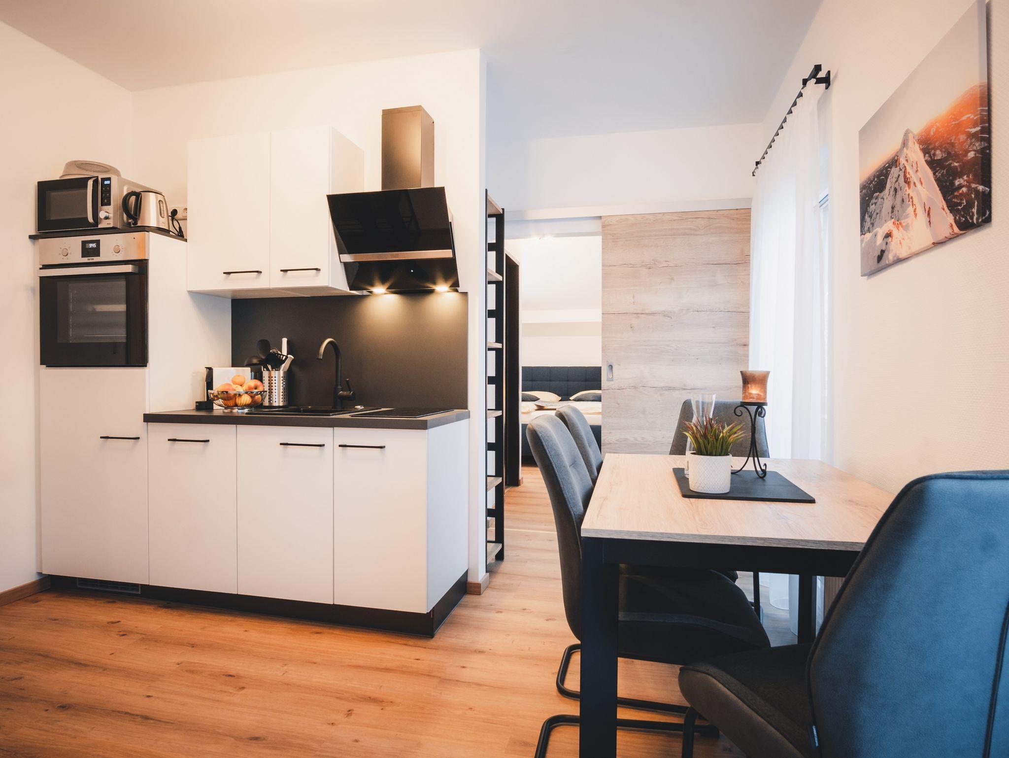 Das Appartement bietet eine voll ausgestattete, moderne Küche mit E-Herd, Backofen, Geschirrspüler, Mikrowelle, Nespresso Kaffeemaschine, Kühlschrank, Wasserkocher, Geschirr und Besteck.