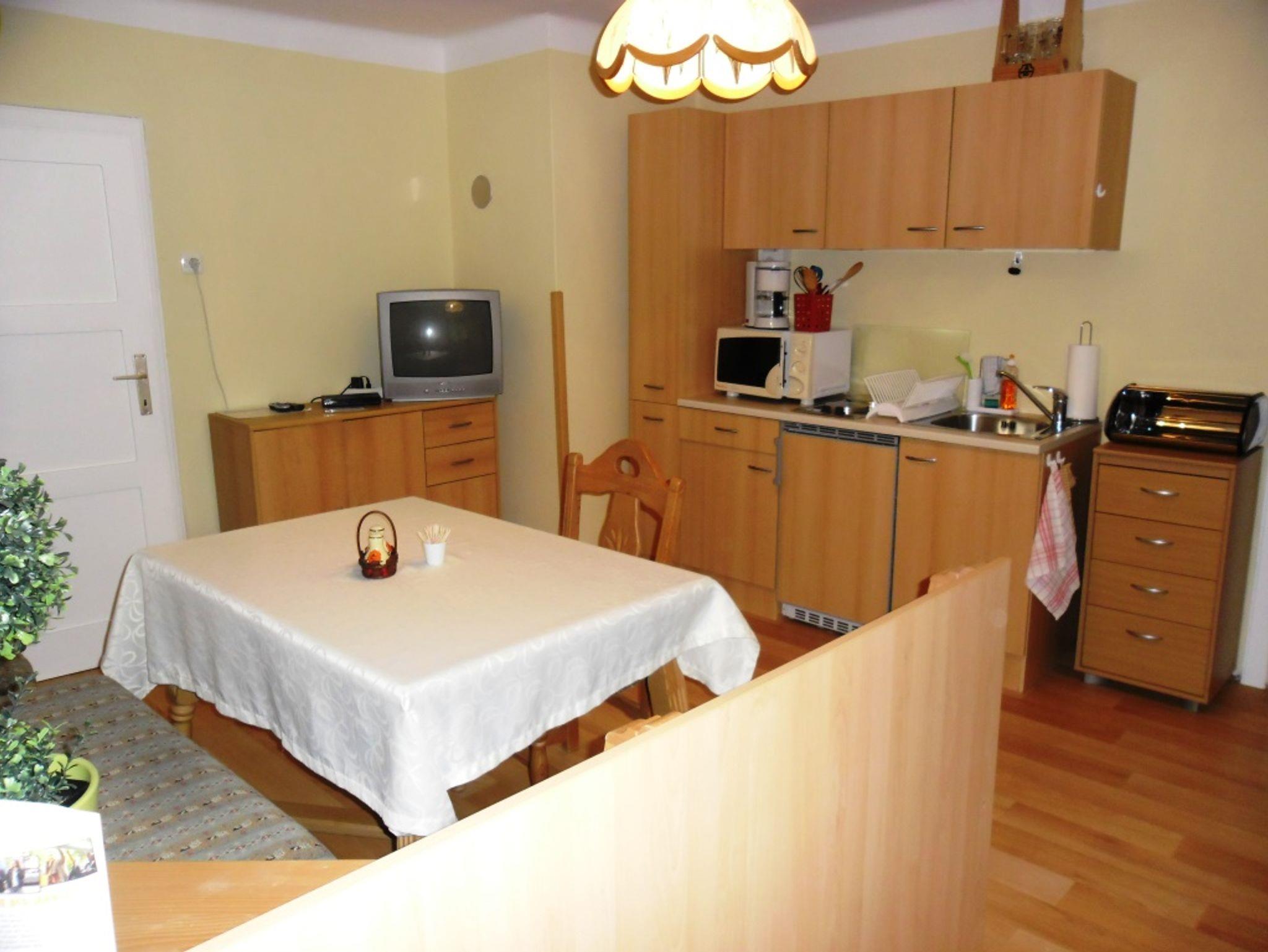 Die Ferienwohnung befindet sich im 1. Stock des Einfamilienhauses. Sie hat ein Schlafzimmer mit Doppelbett und ein getrenntes Schlafzimmer mit 2 getrennten Betten. Daher ist diese Wohnung ideal für Familien mit 2 Kindern. In der dazwischen liegenden Wohnküche kann man gemütlich zusammen sitzen und schöne Stunden mit seiner Familie verbringen. Außerdem kann man sich nach einem schönen Schitag in der Badewanne entspannen und zu neuen Kräften kommen. Ausgestattet ist die Küche mit einer Filterkaffeemaschine, Teekocher, Toaster, Mikrowelle, Minibackofen, und mit einem Kühlschrank mit kleinem Gefrierfach.