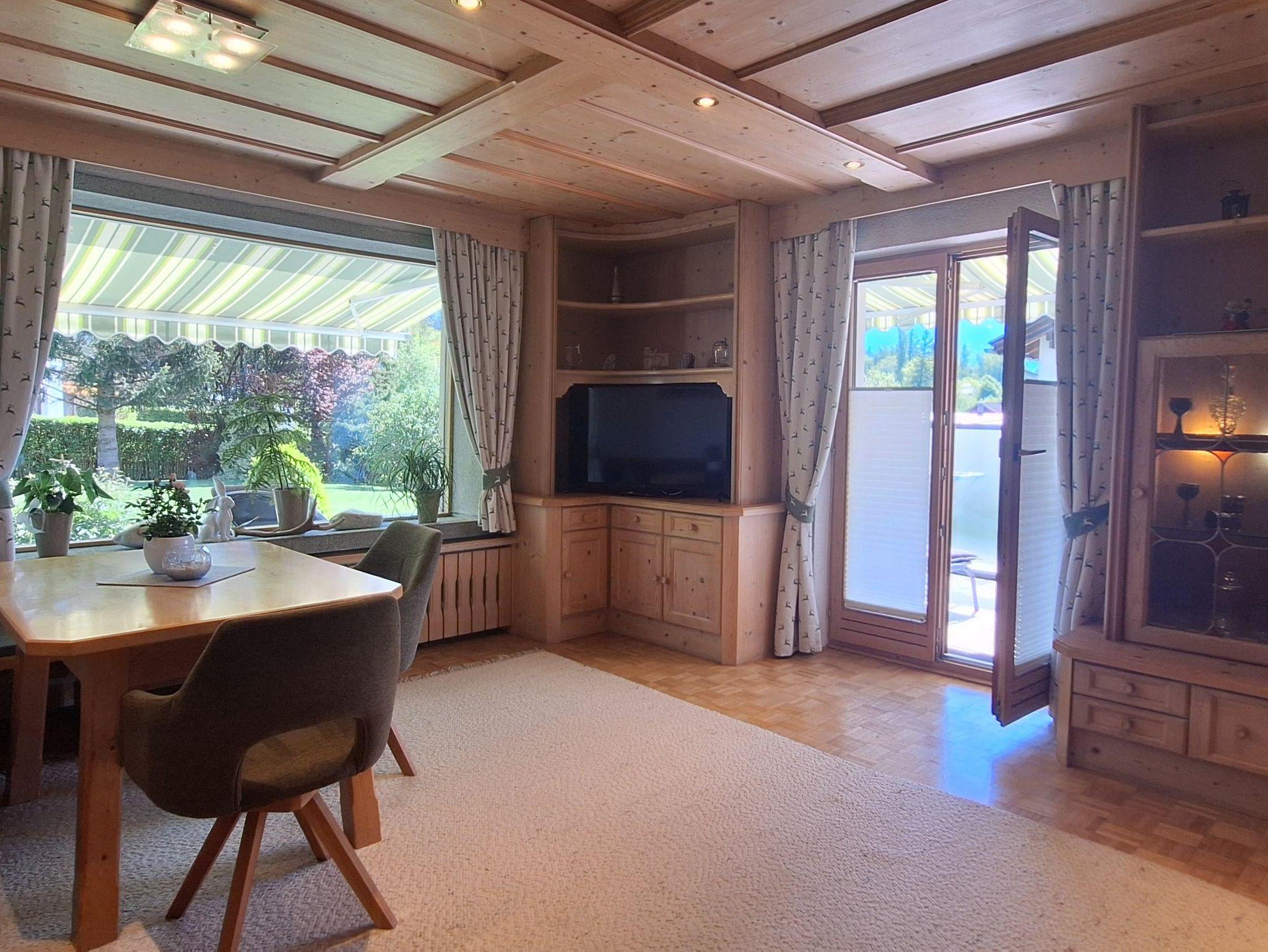 • Stube (Wohnzimmer) im Tiroler Stil mit Kabel-TV und gemütlicher Sitzecke | Tür zur Terrasse | Blick in den Garten