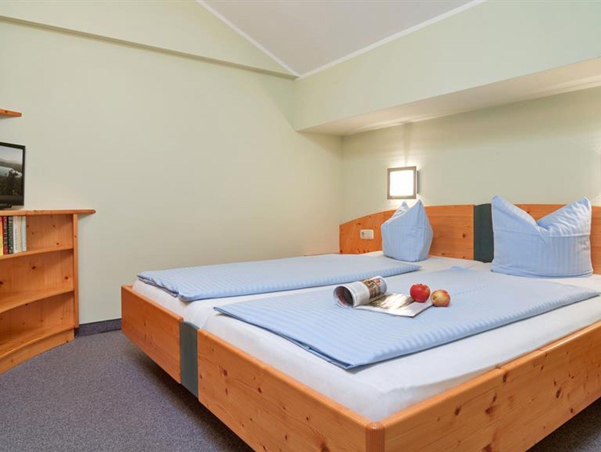 Appartement für 3-6 Personen mit 2 Schlafräumen (1 x mit Doppelbettzimmer, 1 mit Stockbetten, )2. TV-Gerät im Elternschlafzimmer, Wohn/Schlafraum mit Sitzgruppe und Couch, Essecke mit Kochnische und Kaffemaschine, Kühlschrank, Du/WC und Balkon, SAT-TV- und Telefon, ost-west-seitige Gartenlage, WLAN