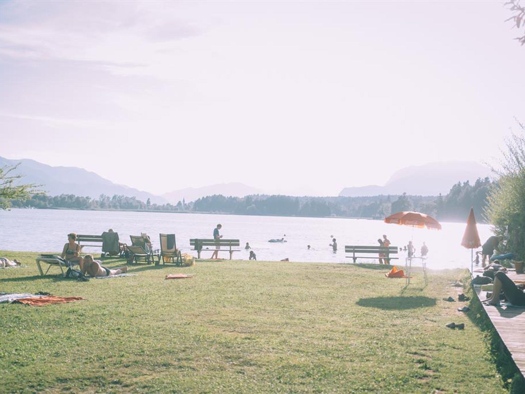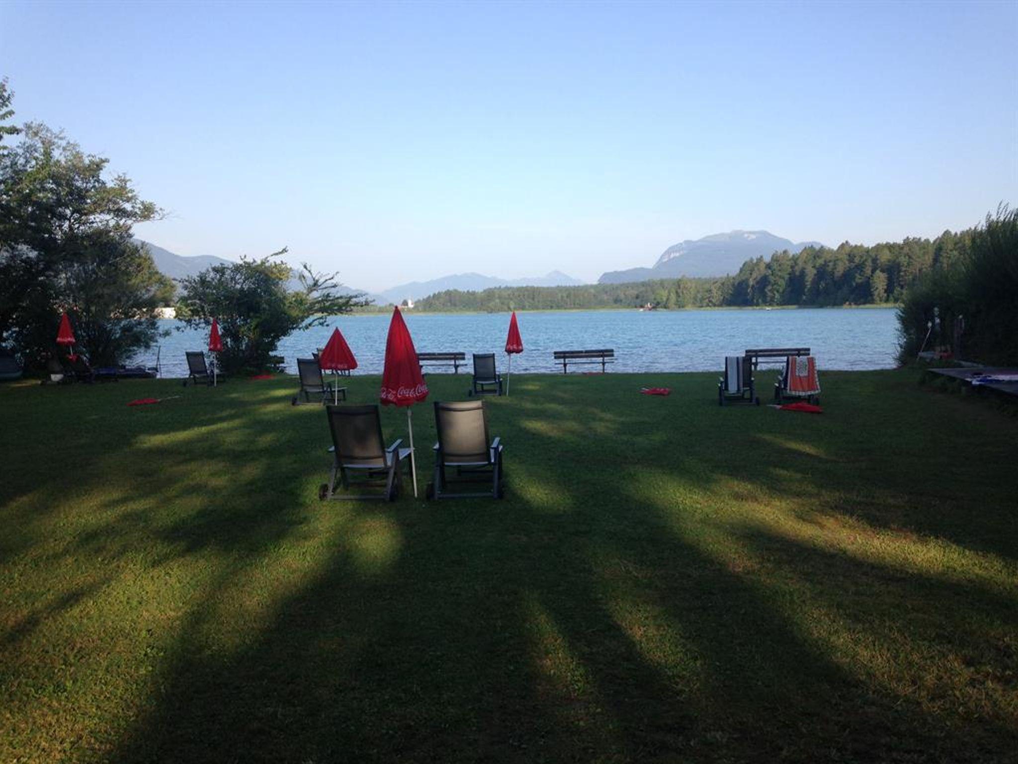 Urlaub in der Region Faaker See. Großer Privat-Badestrand mit Café und Badehaus am Faaker See inklusive (4km, 3 Min. von Privatparkplatz zu Privatparkplatz, beide kostenfrei).