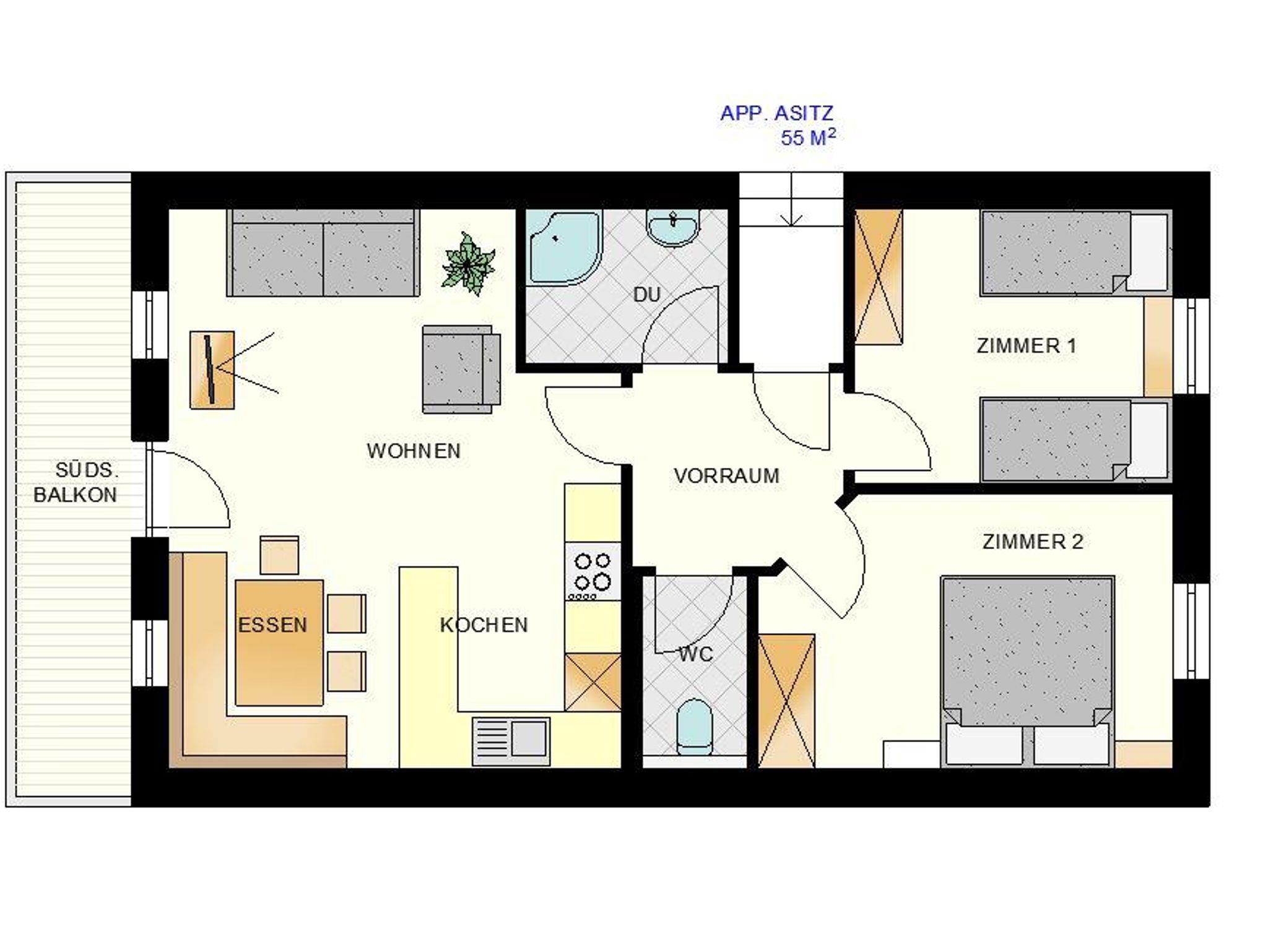 Jedes Appartment umfasst 2 getrennte Schlafzimmer, Dusche, WC seperat,komplette Wohnküche mit Geschirrspüler, Ausziehcouch, Kabel TV, Telefon, Internetanschluss, Vorraum und Balkon.