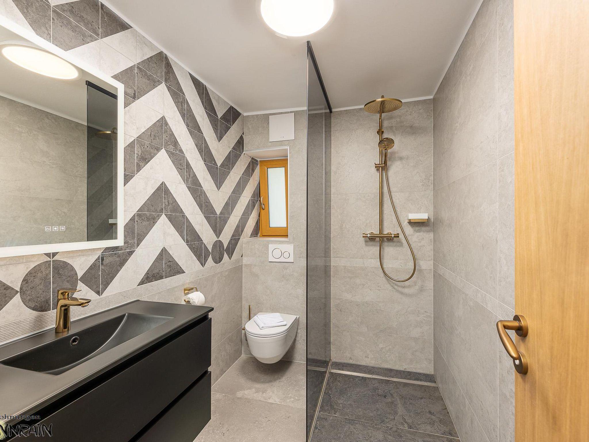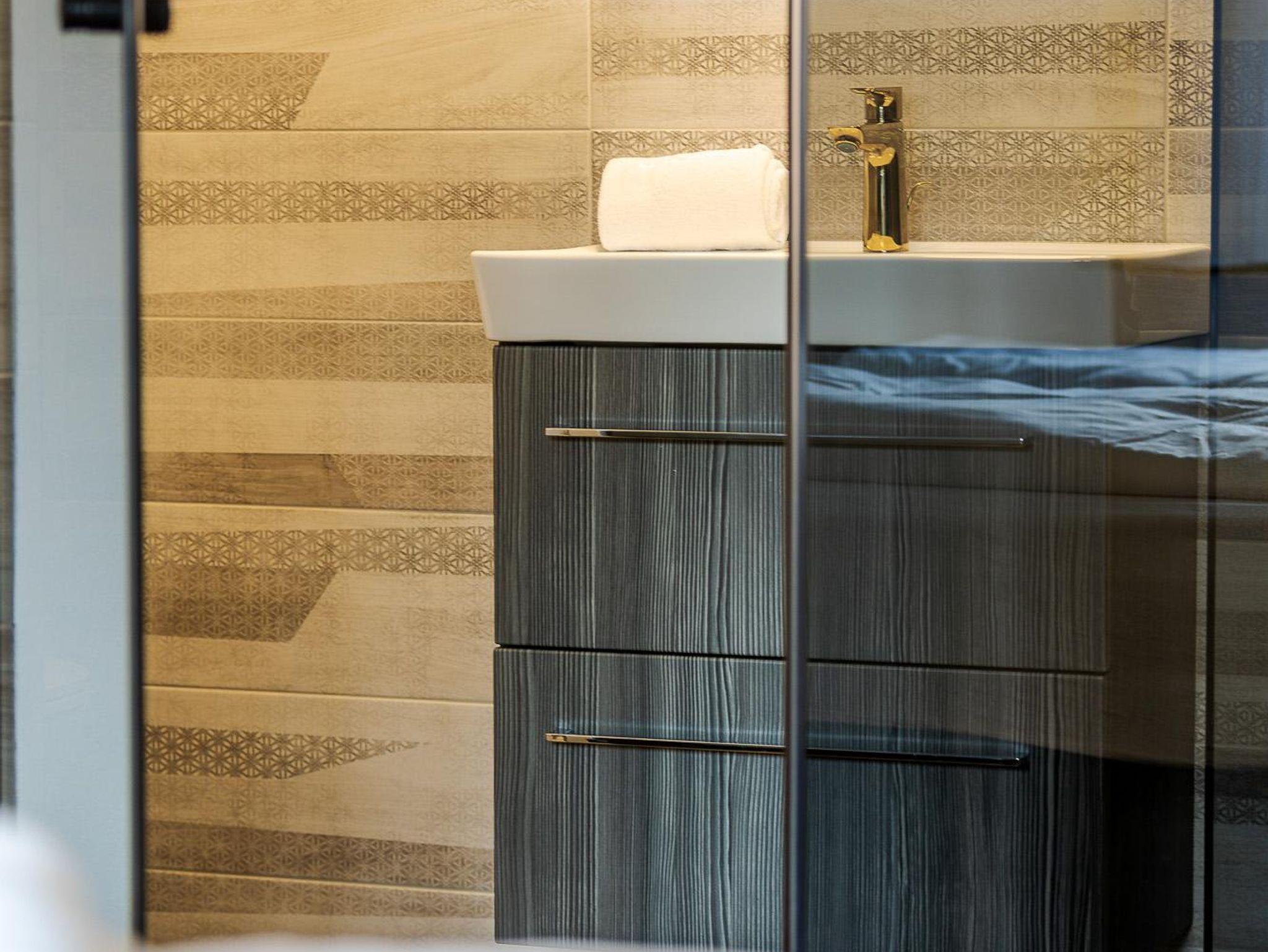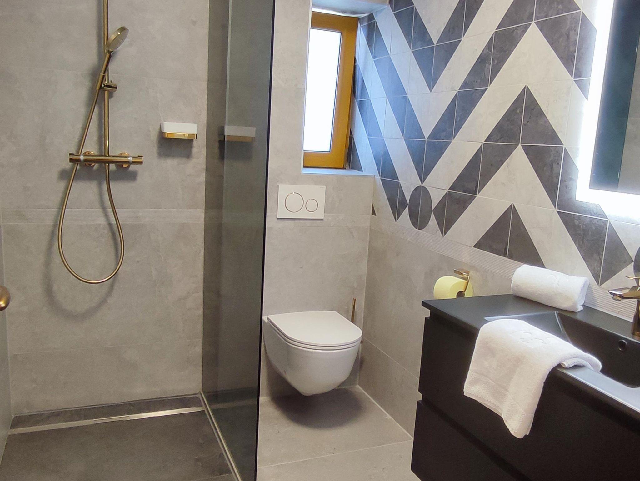 Im Haus ist ein Apartment mit 1 Schlafzimmer ideal für 4 Personen. Die Wohnung liegt auf 2 Ebene: Erdgeschoss: Eingangsbereich mit Garderobe, Wohnküche, 1 Schlafzimmer mit 1 Doppelbett für 2 Personen, 2 Badezimmer mit Dusche und WC. Im Tiefparterre befinden sich den weiteren hellen Räume und ein WC. Es ist bequem auch für 4 Personen.
