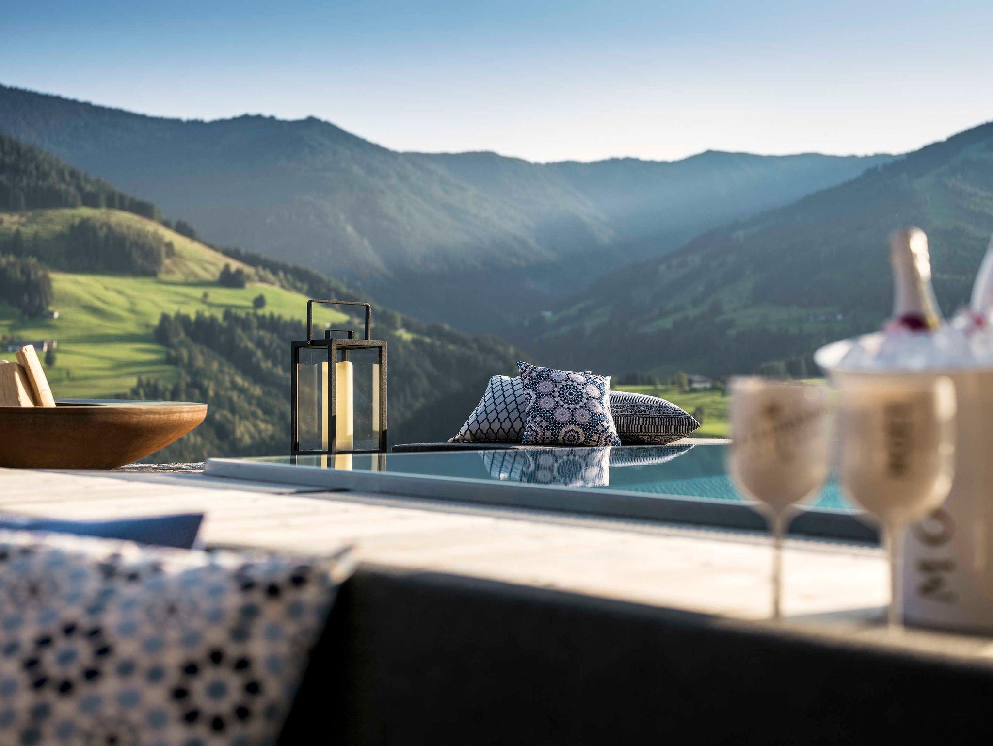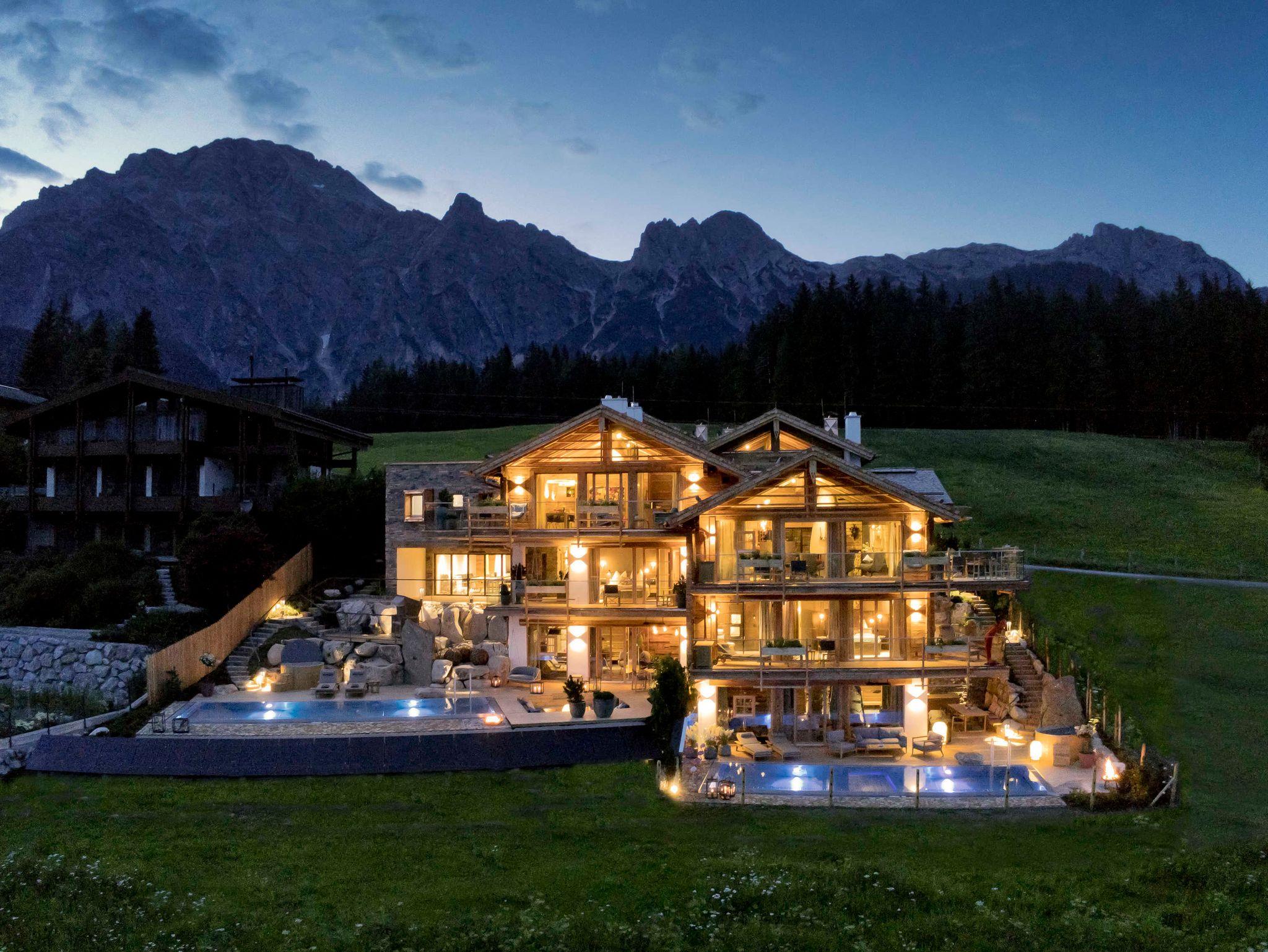 Ein luftig leichtes Loft, das das Lebensgefu¨hl der Berge in neuem Stil interpretiert und auf individuelle Art erleben la¨sst. Mit besonderem Designambiente voller Liebe zum Detail. Auf 180 m2 und verschiedenen Ebenen ero¨ffnen sich ein großzu¨giger Wohnbereich mit hohem Sichtdachstuhl, Ledersofa und Kamin, eine Ku¨che mit freistehendem Herd sowie ein Doppelzimmer und ein Masterbedroom - jeweils mit eigenem Bad. Fu¨r noch mehr Raum, frische Luft und Inspiration im Urlaubsreich geht es hinaus auf die Terrassen oder den Balkon. Große Glasfronten, Eichenholzbo¨den und Zirbenholzdecken lassen das natu¨rliche Ambiente des Chalets in allen Sinnen erleben. Auch hier gipfelt die exklusive Privatspha¨re im Wellnessbereich mit eigenem Infinity-Outdoorpool zum Abtauchen und Treibenlassen.