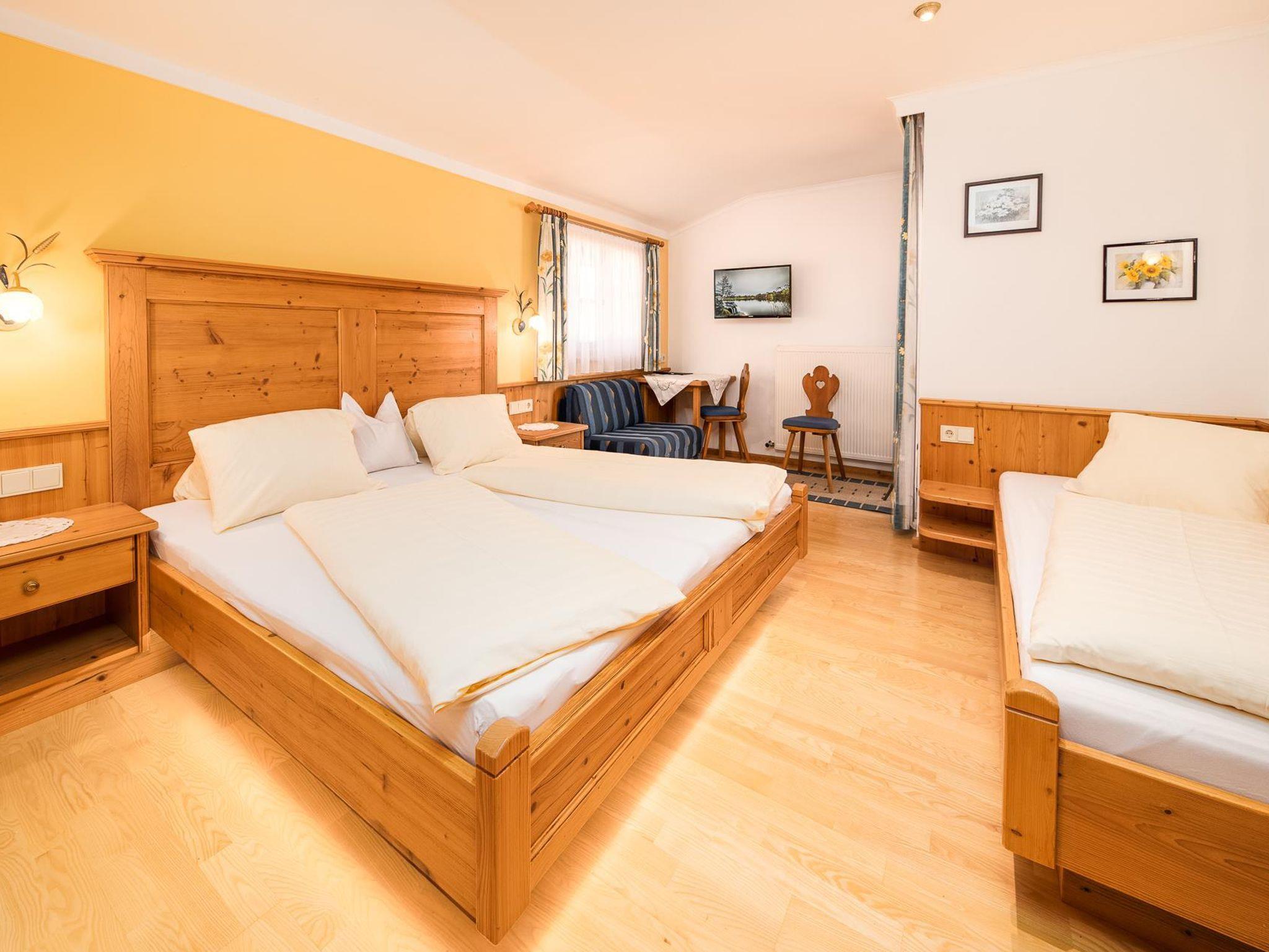 In unserem Dreibettzimmer finden Sie ein modernes Alpenflair zum Wohlfühlen. Auf etwa 25 m2 erwartet Sie ein 2 m breites Doppelbett, ein Einzelbett sowie eine ausziehbare Couch für maximal vier Personen. Zudem bietet Ihnen das helle im Altholz-Stil errichtete Zimmer einen Schreibtisch, Flat TV, Telefon, Wifi sowie einen Safe. Das Badezimmer verfügt über einen Waschtisch, Dusche, WC, Handtuchtrockner und Haarföhn. Zusätzlich besitzt unser Dreibettzimmer einen Balkon mit Blick auf die Leoganger Steinberge.