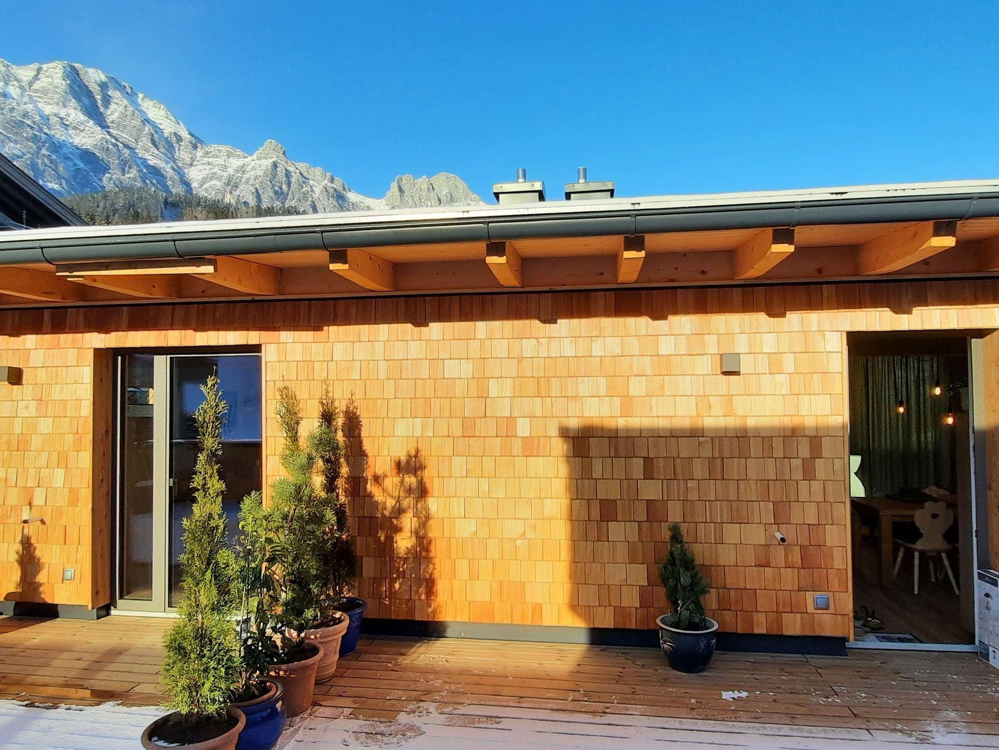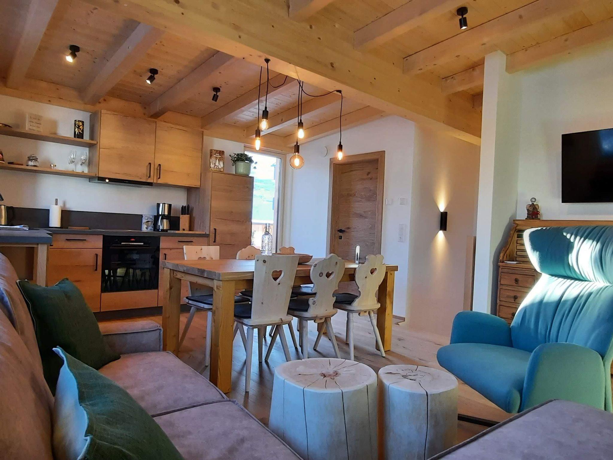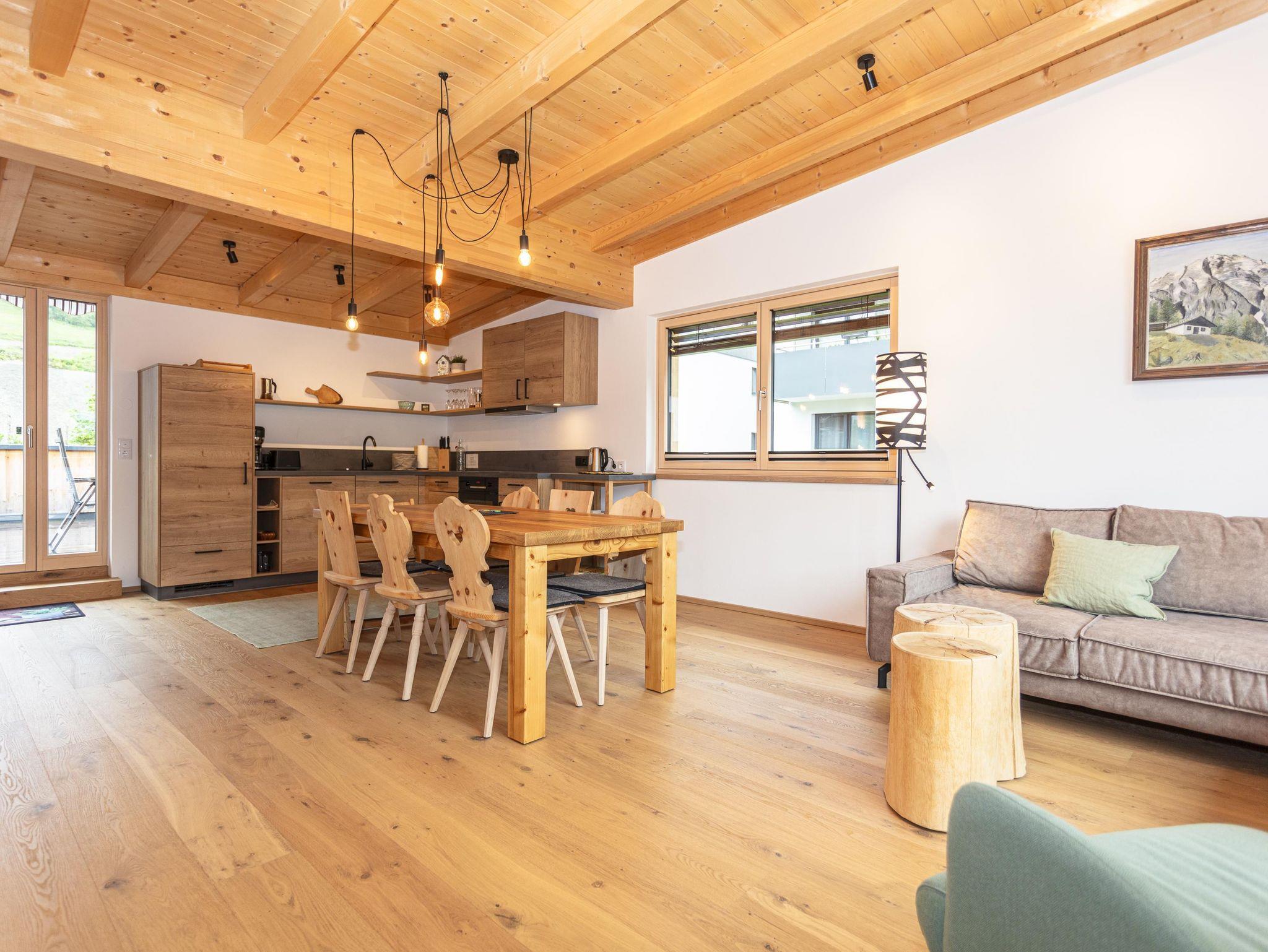 Die natürliche Fichtenholzdecke und ein gemütliches Ecksofa aus Naturleinen laden zum Chillen und Genießen des Ausblicks ein. Panoramafenster auf die Leoganger Steinberge. Eigene Sonnenterrasse mit Esstisch und Stühlen mit Blick auf die sanften Grasberge im Süden und Gartenbereich im Freien mit Liegestühlen.