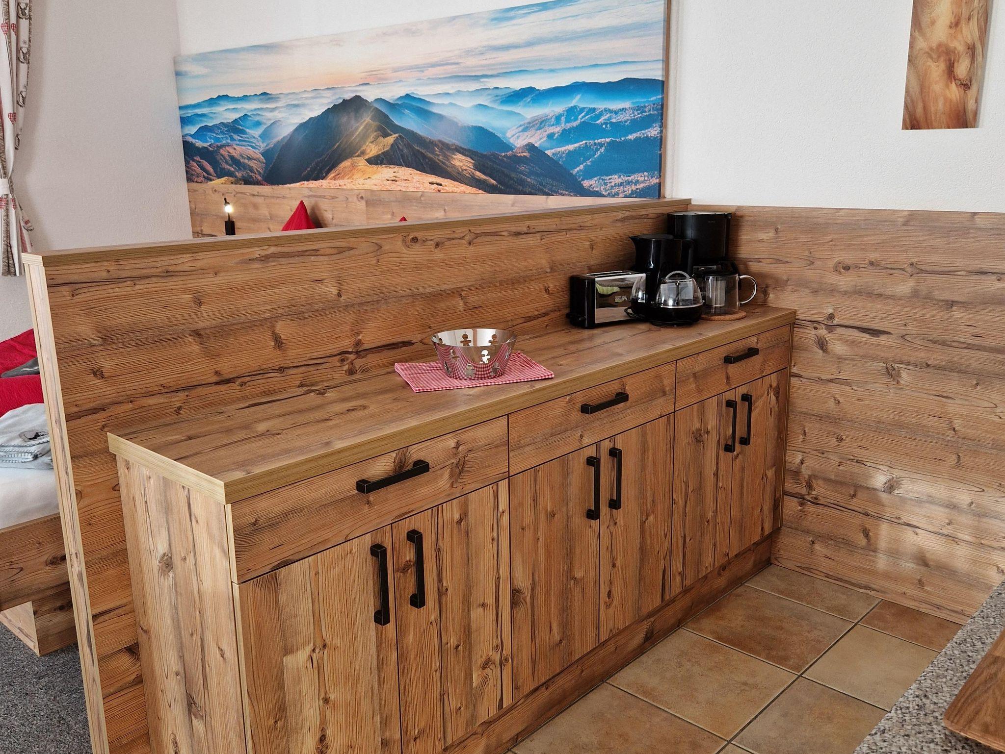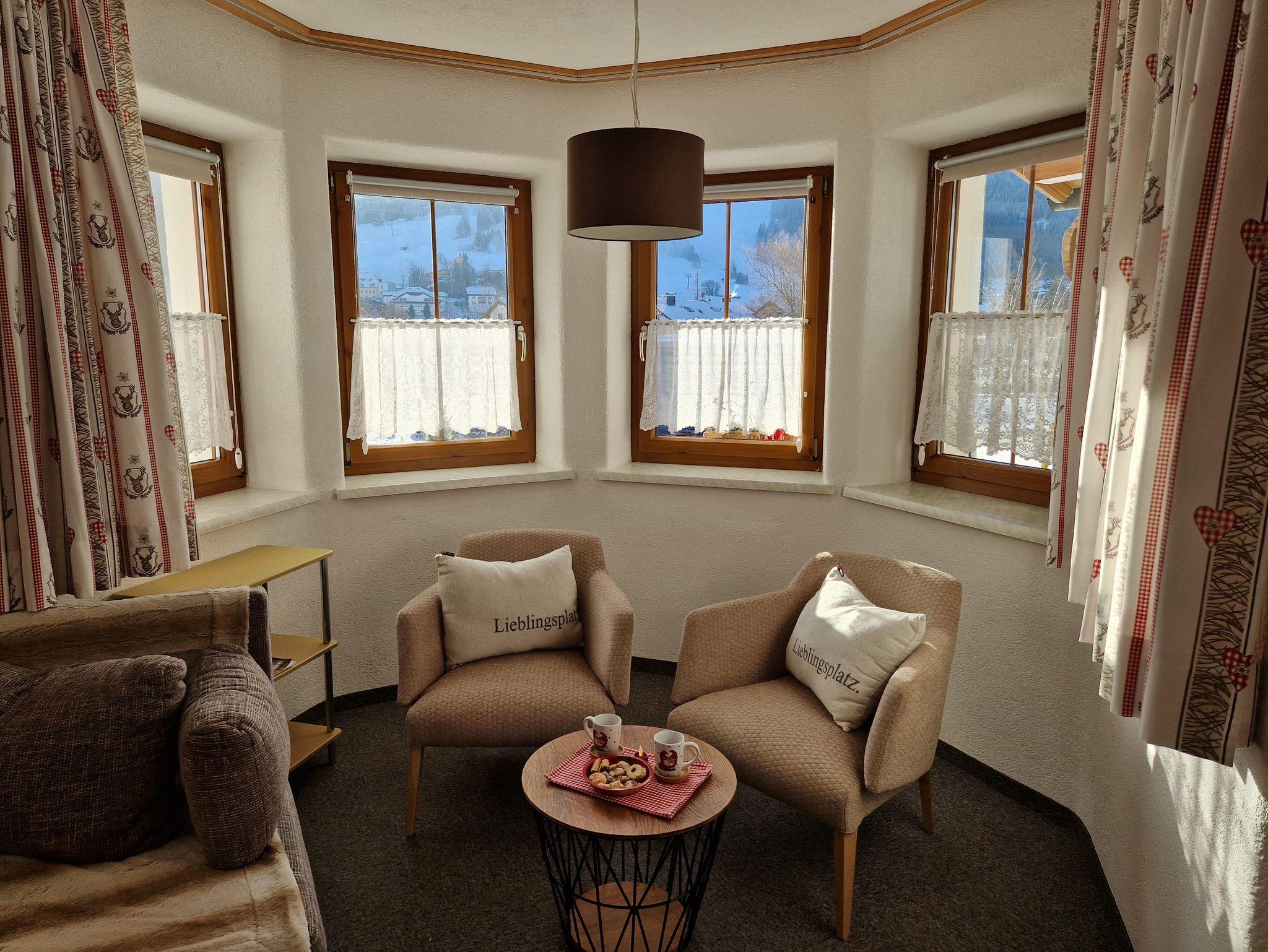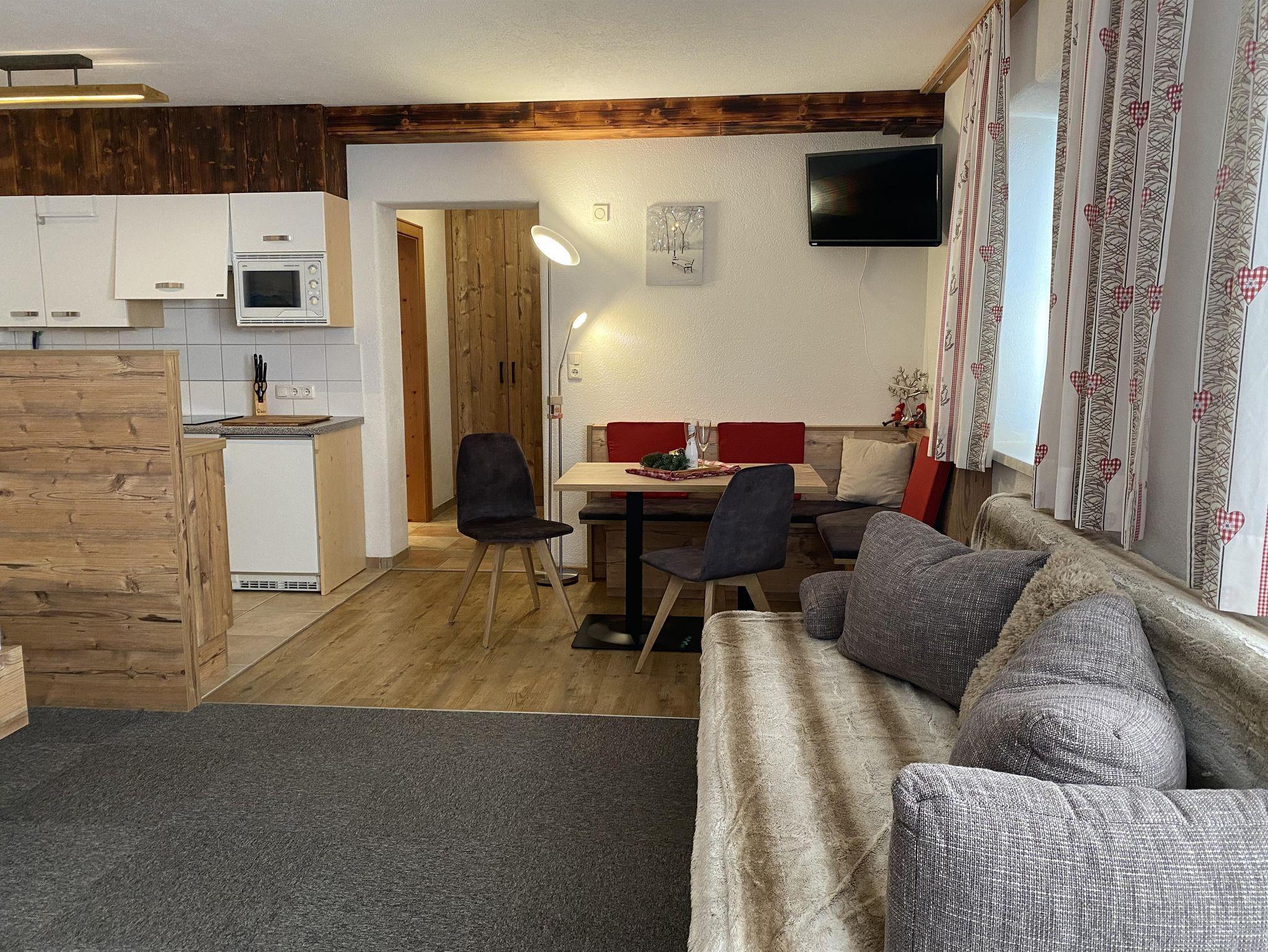Ebenerdig gelangen Sie zur 45m² Wohnung. Mit eigenem Eingang, Hausgang (Diele) mit Garderobe und Skiabstellplatz-Skischuhtrockenplatz, Vorraum, 1 großer Wohn-Schlafraum mit gemütlichem Ercker und Küche, DU/WC. Sonnen am windgeschützten - ausblickfreien Vorplatz. Supermarkt M-Preis/Bäckerei und Bushaltestelle (gratis Skibus direkt zur Gondel) befinden sich in 80 m Entfernung. Es sind nur wenige Minuten ins Zentrum und zu den Skiliften. Für Langläufer befindet sich der Loipeneinstieg direkt beim Haus.