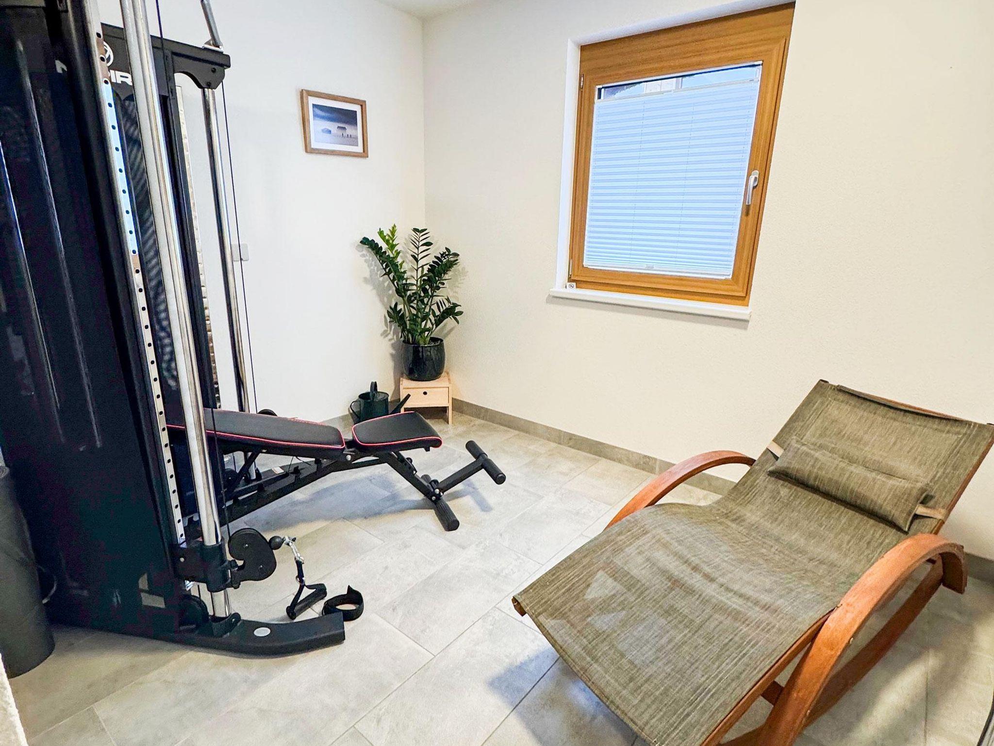 Der Fitnessraum ist mit hochwertigen Geräten ausgestattet, die ein umfassendes Ganzkörpertraining ermöglichen. Darüber hinaus eignet sich der Raum ideal für Gymnastik, Stretching oder Yogaübungen. Nach dem Schwitzen kann man sich in der angrenzenden Dusche direkt erfrischen.