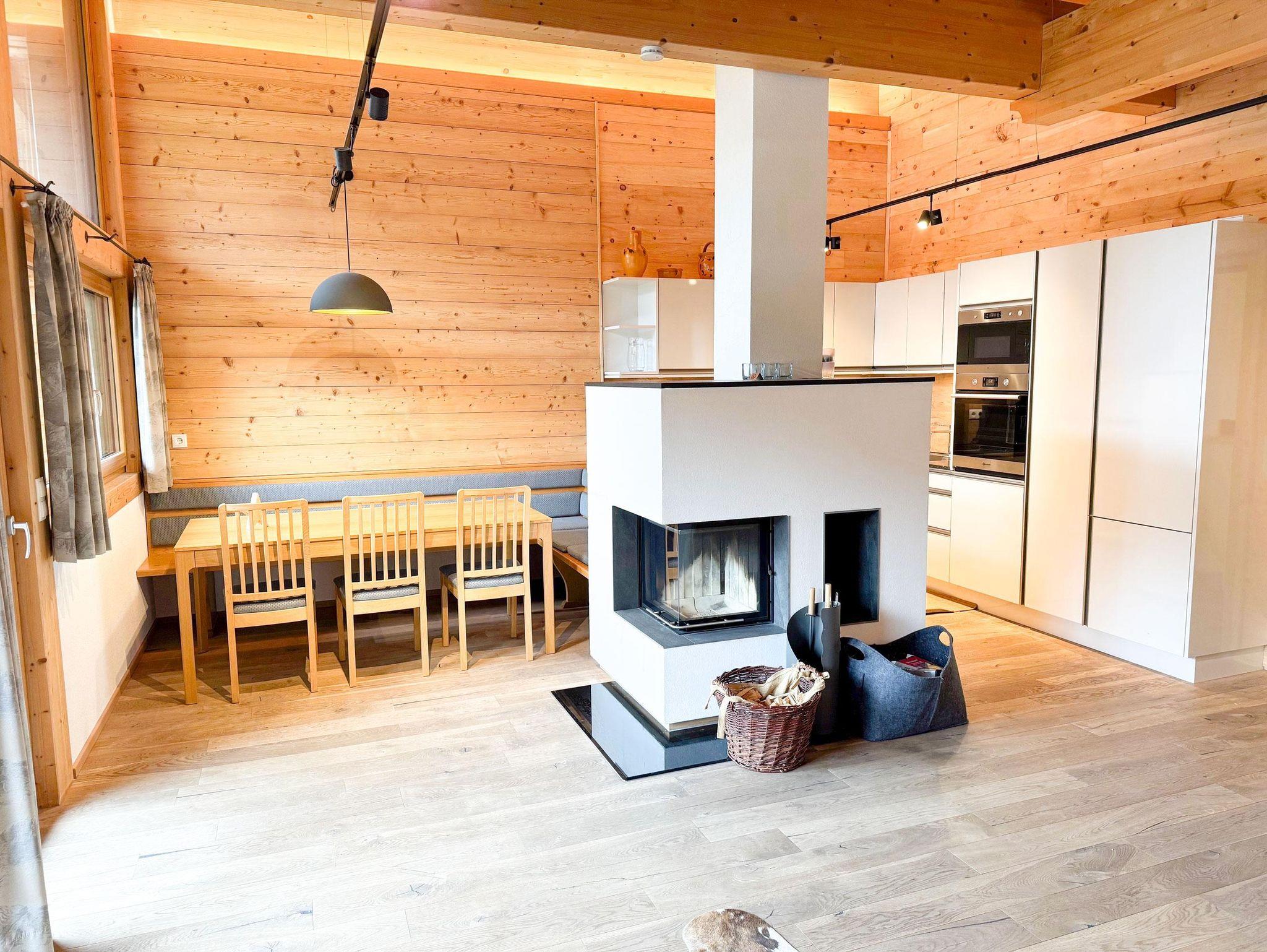 Das Chalet erstreckt sich über zwei Etagen. Über eine Treppe gelangen Sie in das Obergeschoss, welches den offenen Wohn-, Koch- und Essbereich umfasst. An die voll ausgestattete Küche grenzt direkt der gemütliche Essbereich mit Eckbank und großem Tisch. Hier wird das tägliche Kochen zum gemeinschaftlichen Erlebnis für Groß und Klein. Der Kamin in der Mitte des Raumes sorgt mit seinem knisternden Holz für Gemütlichkeit und angenehme Wärme. Der Wohnbereich mit großer Couchecke, Smart-TV und wunderschönem Ausblick ins Freie unterstreicht das alpine Ambiente. Durch die Balkontür haben die Gäste Zugang zum großen Sonnenbalkon mit weiteren Sitzmöglichkeiten an der frischen Luft. Ein Schlafzimmer sowie ein Badezimmer mit Doppelwaschbecken, WC, Dusche und Badewanne ergänzen die Zimmer im Obergeschoss.