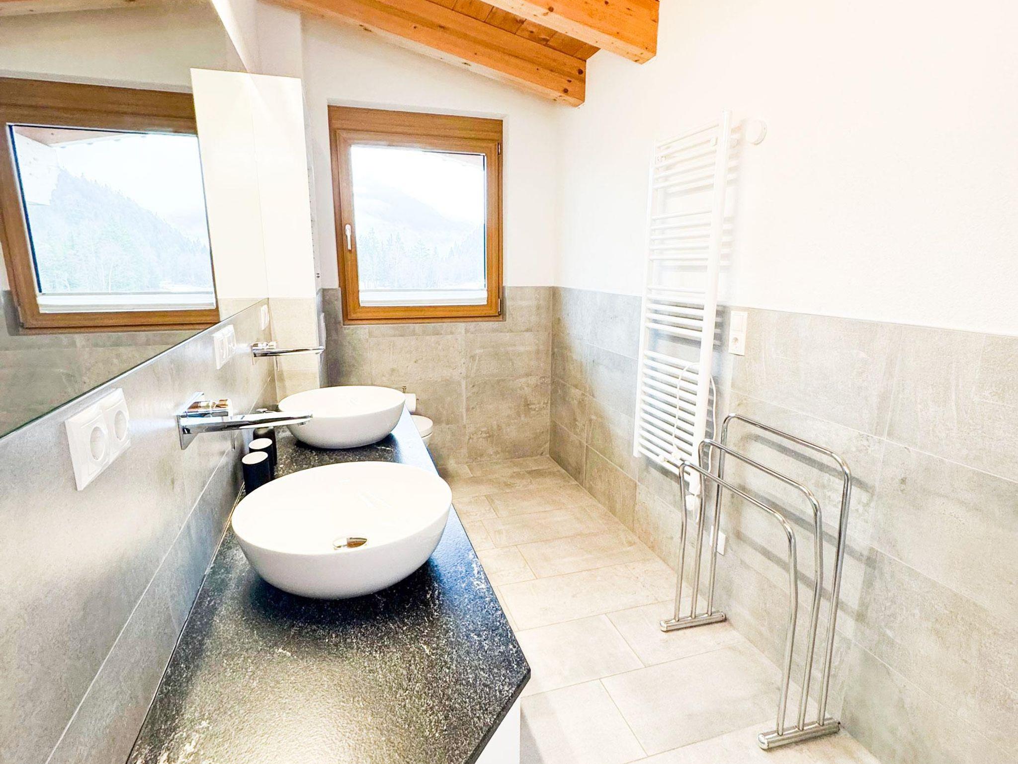 Im Erdgeschoss ist neben zwei großzügigen Schlafzimmern zusätzlich ein separates WC sowie der Fitnessbereich mit Dusche untergebracht. Von den beiden nebeneinanderliegenden Schlafzimmern hat man direkten Zugang zum Garten mit Sonnenterrasse und entsprechenden Sitzmöglichkeiten für einen schönen Grillabend im Sommer. Im Winter kann man von dort den Sonnenuntergang und das großartige Panorama der umliegenden Berglandschaft bei einem Glas Wein genießen.