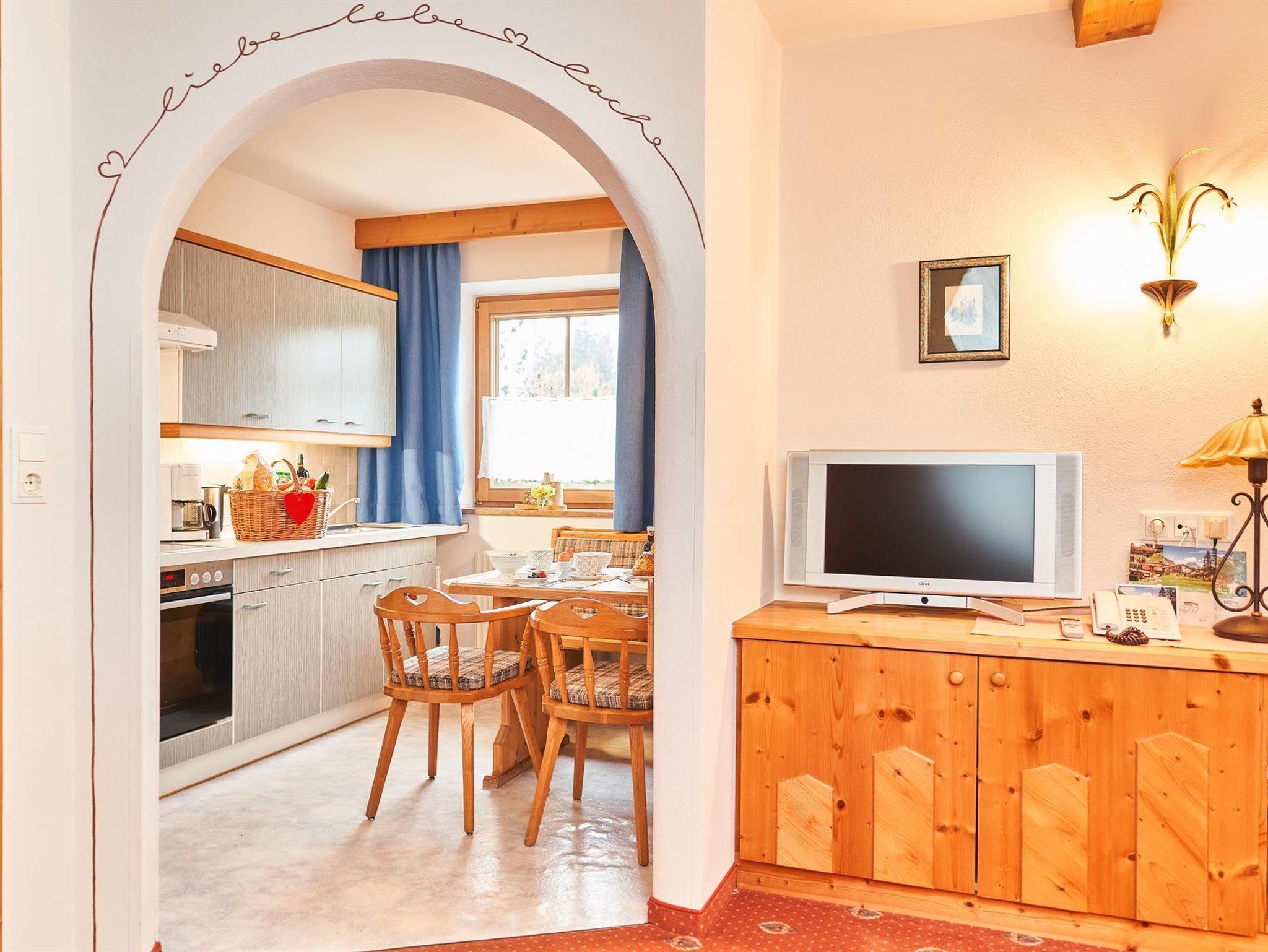 Ferienwohnung zur Ost-Südseite - die Suite des Hauses - Sonne von morgens bis abends, lichtdurchflutet. Schlafzimmer, Wohnzimmer mit Kachelofen und Ofenbank, separate Küche komplett eingerichtet mit Essplatz in der Küche, Dusche/WC, Vorraum mit Garderobe und Spiegel, Ost-Südterrasse, Südbalkon mit herrlicher Sonneneinstrahlung, Balkonmöbel, Wohnung neu eingerichtet, sehr gemütlich und komfortabel, sehr sauber, unverbaute Aussicht mit freiem Blick zur Hohen Munde und Wettersteinrundblick.