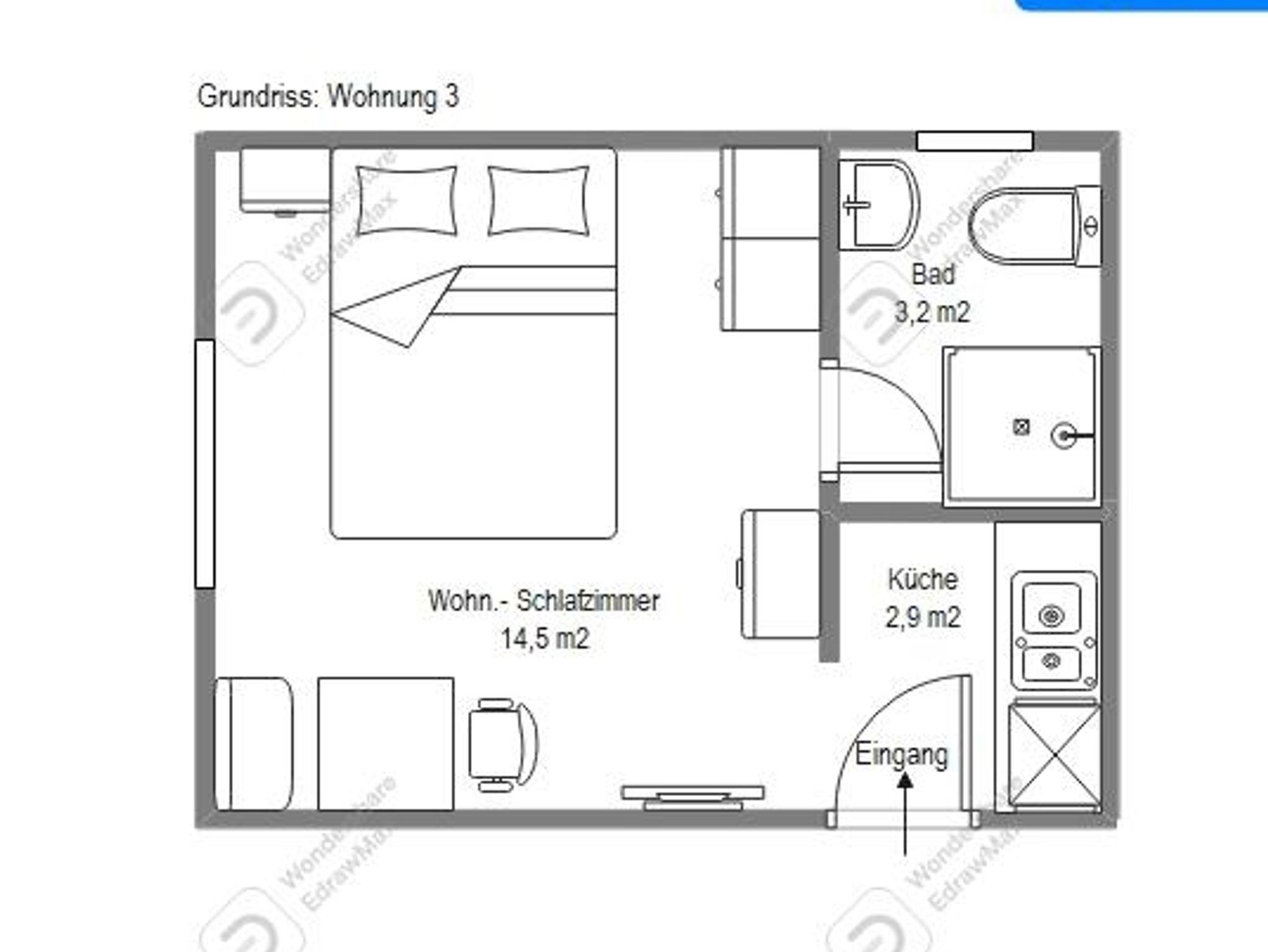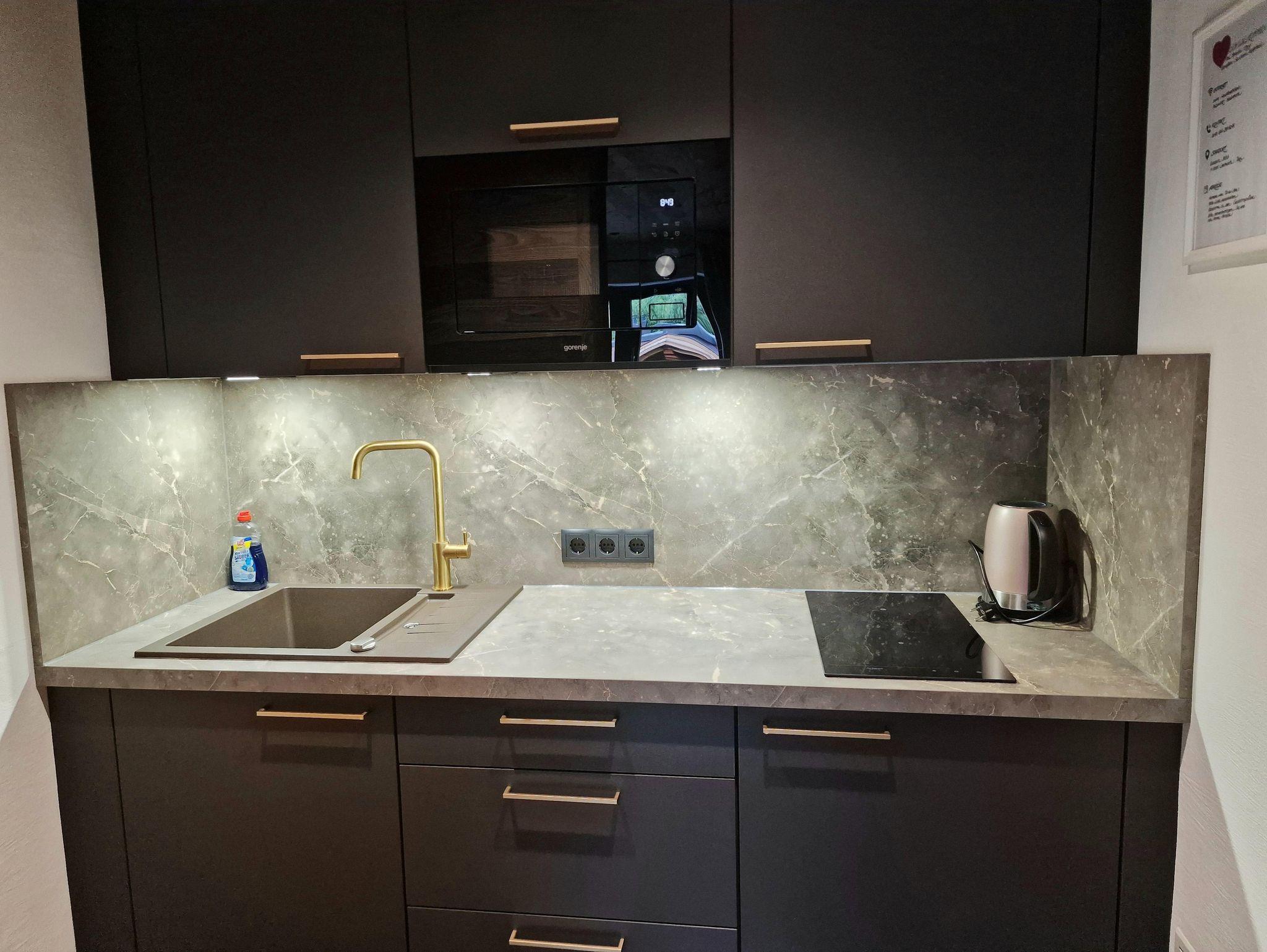 Das Studio besteht aus einem schönen, hellen Bad mit Dusche und Steinbecken, einer Essecke, gemütlichem aufklappbaren Bett und einer modernen Küche mit Mikrowelle, Kühlschrank sowie einer Herdplatte.