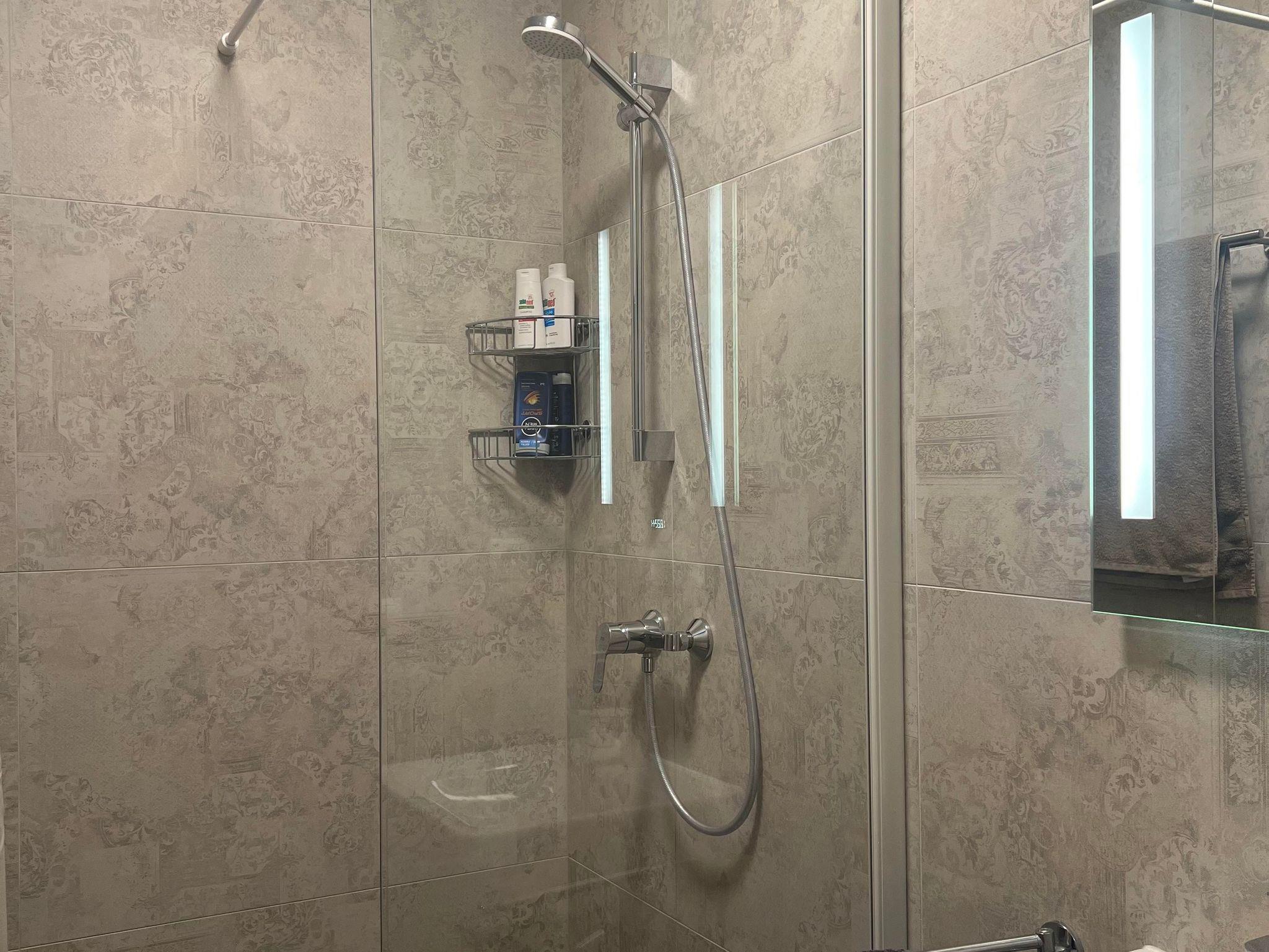 Das moderne Badezimmer ist mit Dusche und WC ausgestattet und sorgt mit funktionalem Design für zusätzlichen Komfort.