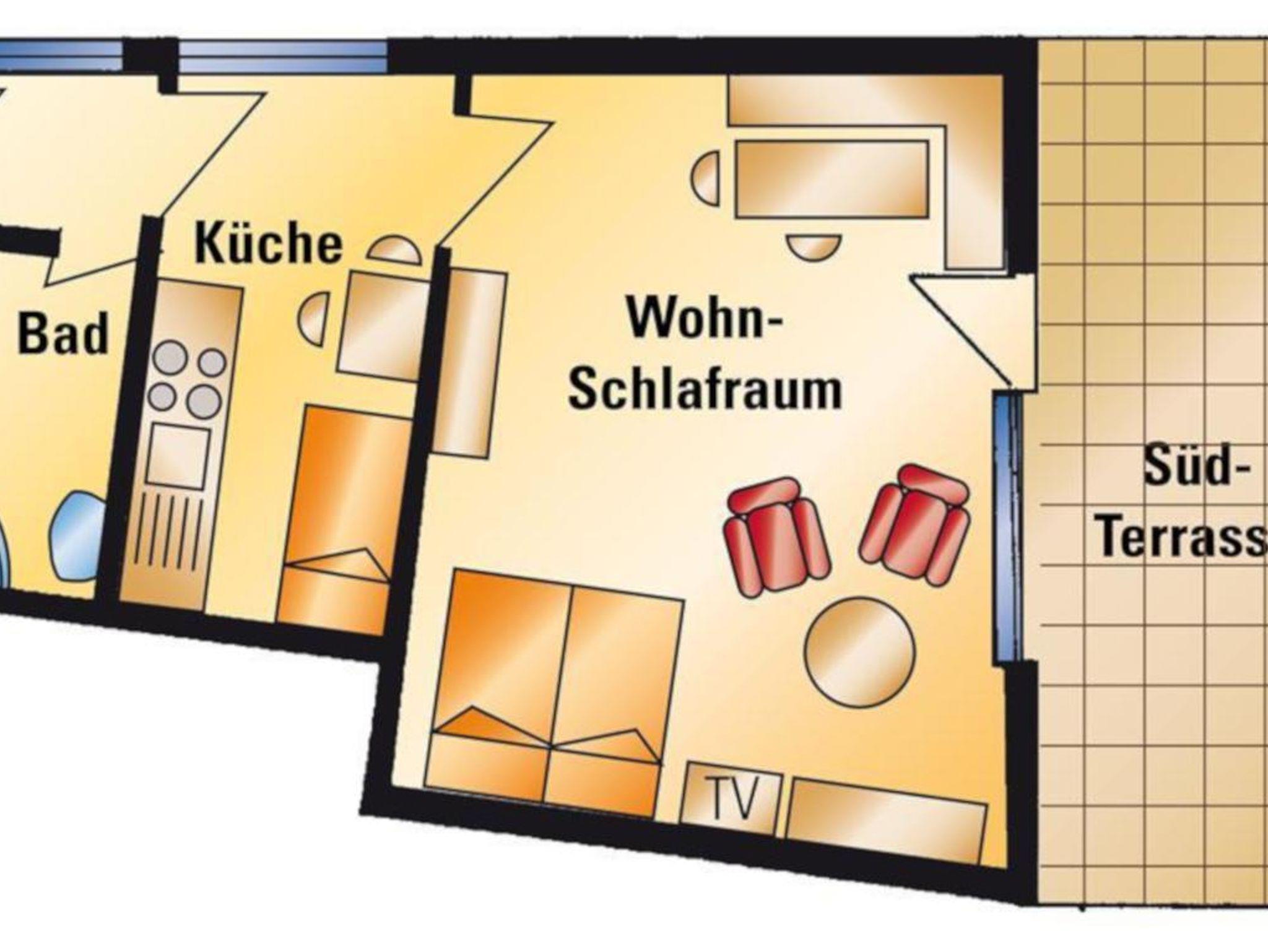 45 m², 1 Wohn-Schlafraum, Küchenzeile, DU/WC, Südbalkon